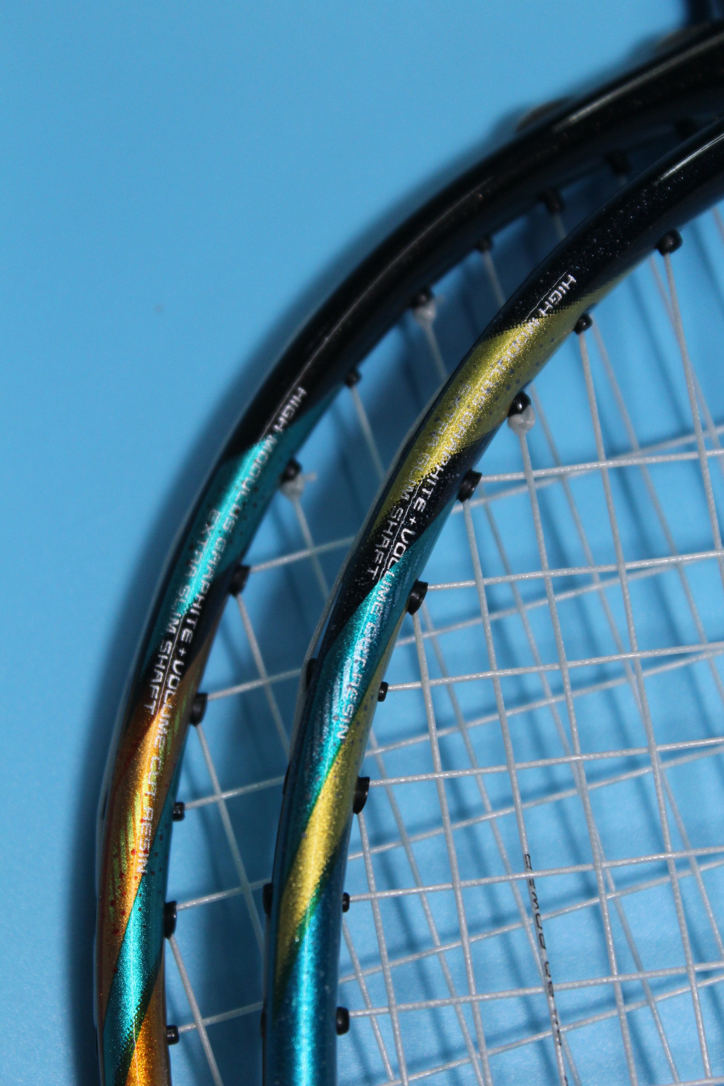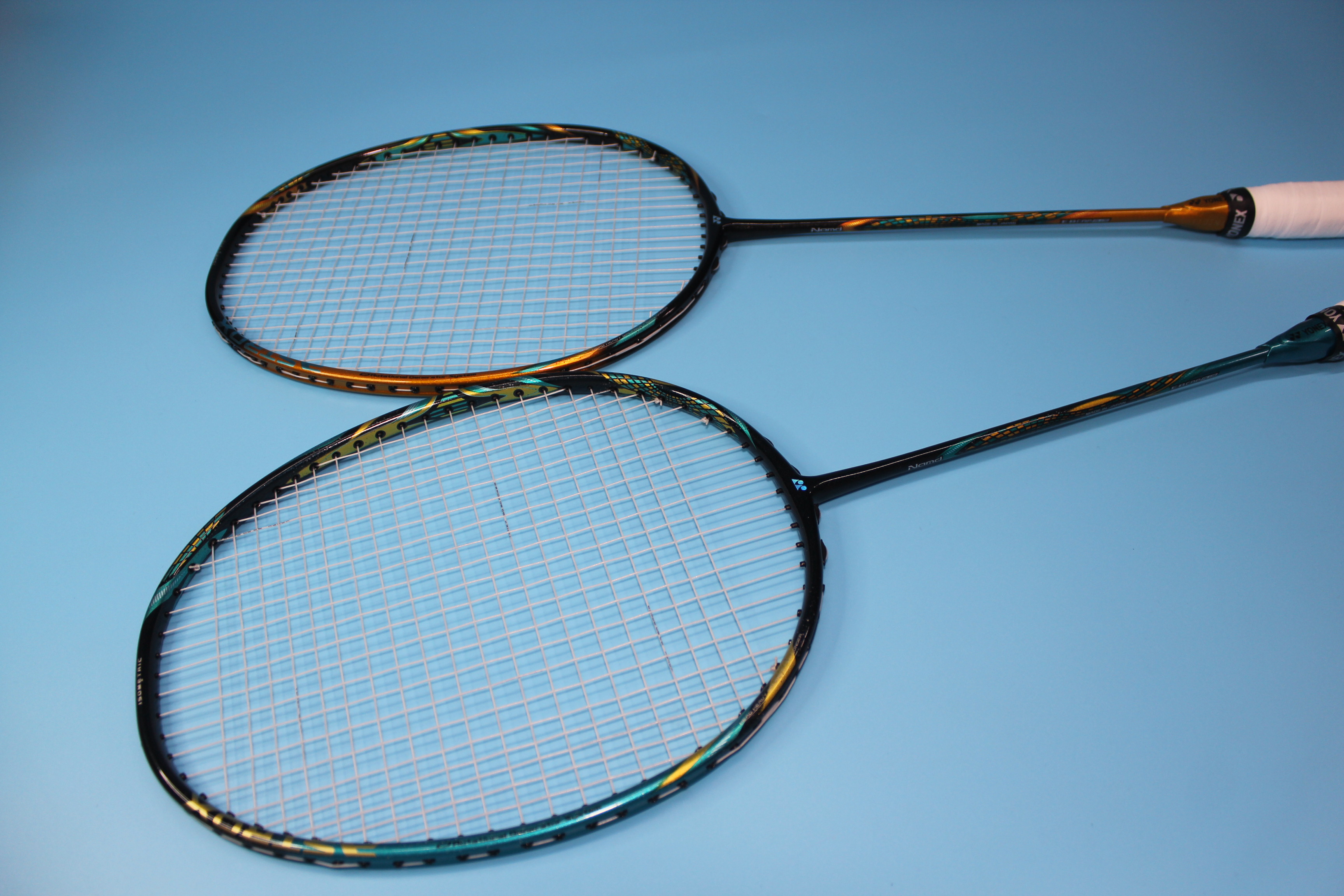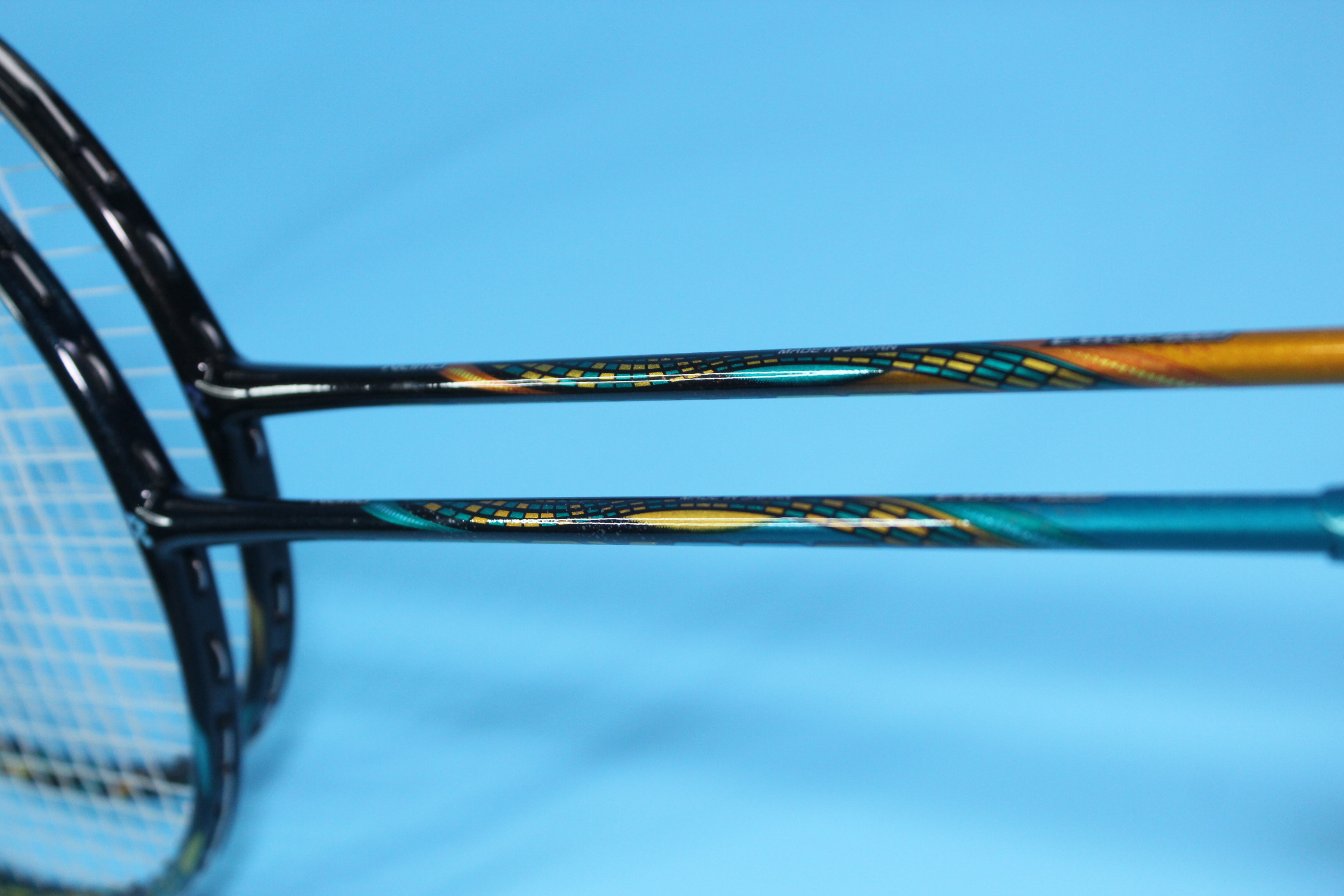 两支球拍均采用星空黑的烤漆为底色。 以活泼灵动的青绿来作为分工前场的主打灵动组织进攻的AX88SPRO再好不过了, 而以雍容华贵的黄金作为担任后场的稳定输出一锤定音的AX88DPRO也合情合理。