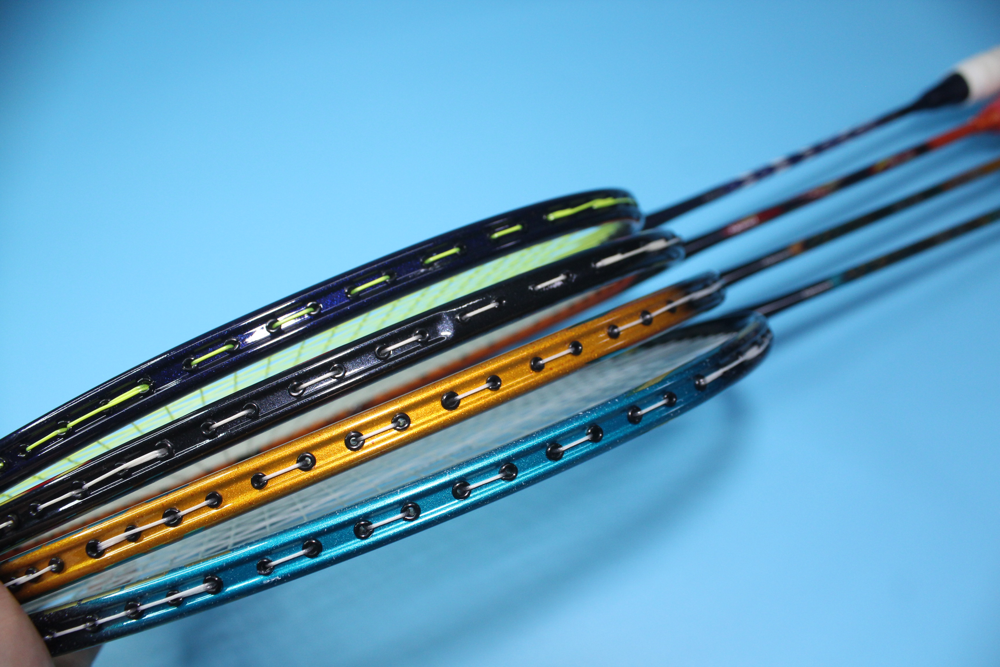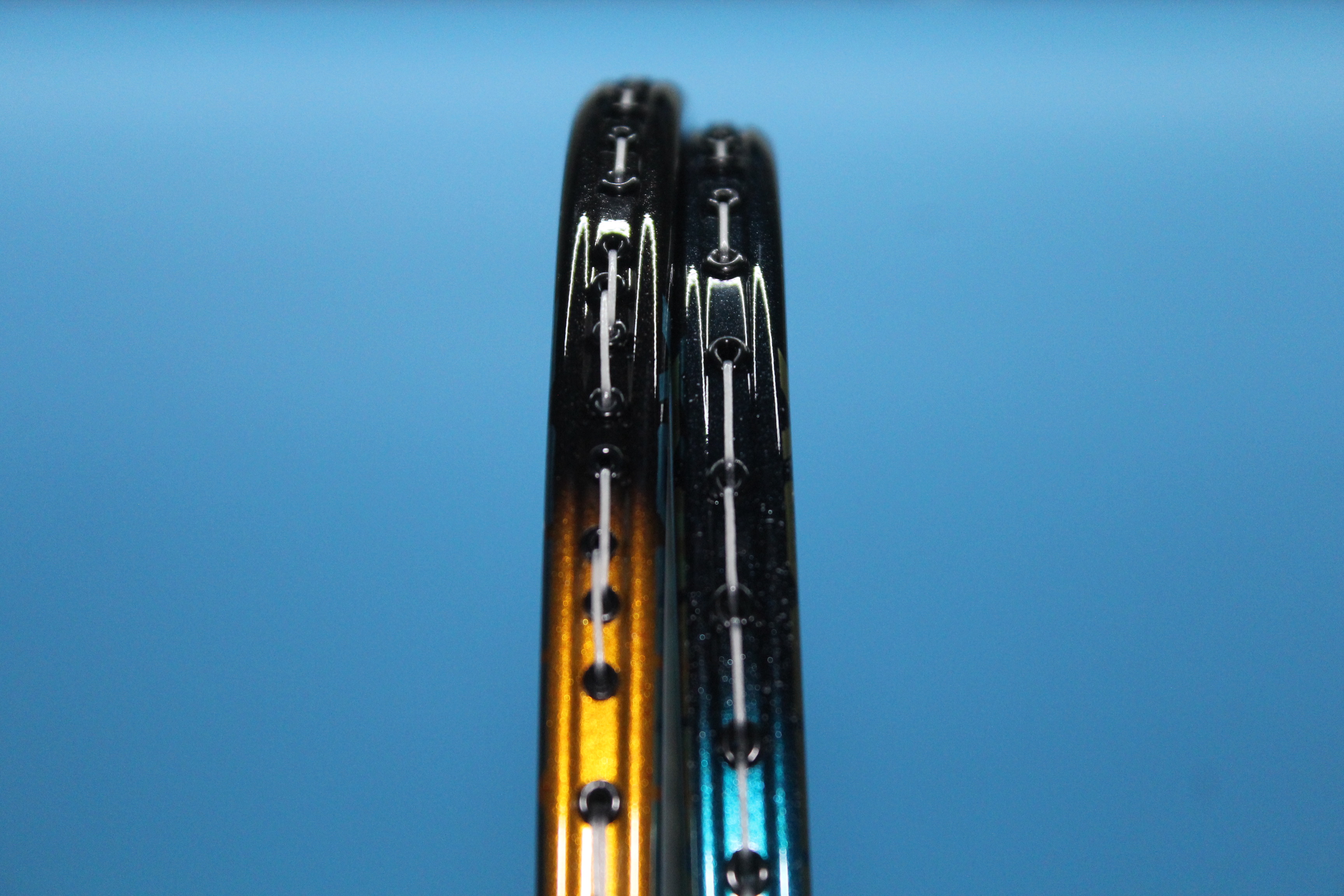 全线槽的使用,全新打孔设计,通过使用高强度新材料体积压缩树脂,在拍框两侧首次使用粗孔设计。提升拍线的可形变范围,同时提高击球时的拍面接触时间,增强持球性。根据S版和D版各自的特性,在最合适的位置配置了最佳数量的粗孔,发挥符合前后场选手的性能,反正穿线师是开心的。