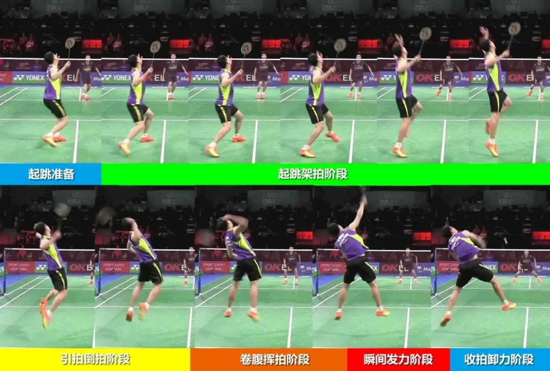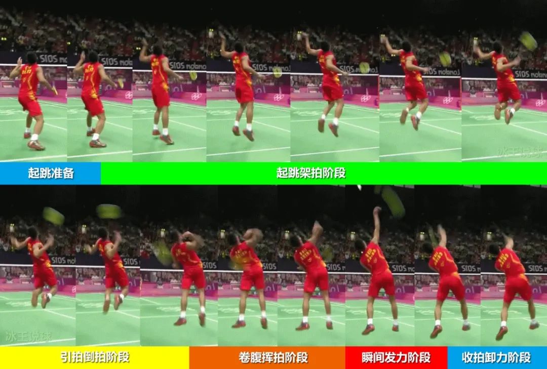 4)主次分明 上述3个动作以卷腹发力为主导,发力基于蹬地起跳的力量传递,旋臂发力为辅助,摆肩发力作为节奏变化用,两者的发力均基于转体的力量传递,然有能力者或可将三者融合而一创造最高杀球速度,实战应用时可根据需求选择不同的输出时机和输出比例。
