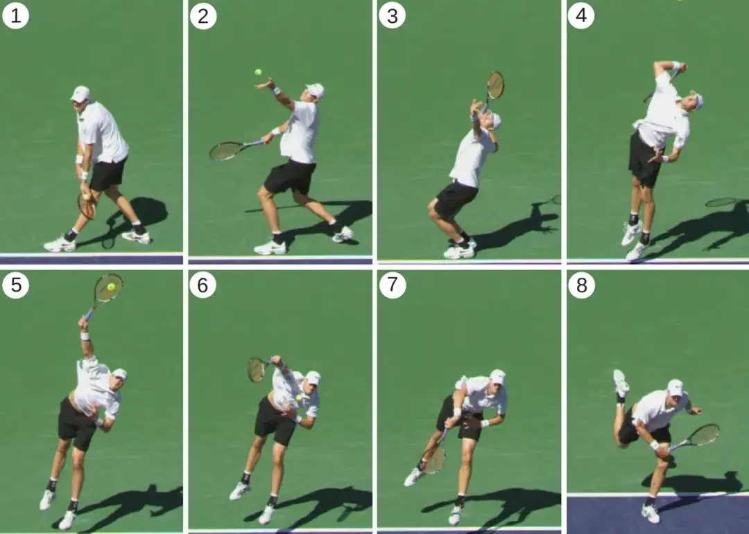 5)动作验证 网球运动中的发球作为力量极限的动作参考,可以看出动作中包含了上述三种发力的融合态,而羽毛球并非属于追求极限发力的运动,更多的需要合理分配体能,故极限的发力方式往往用于致命一击。