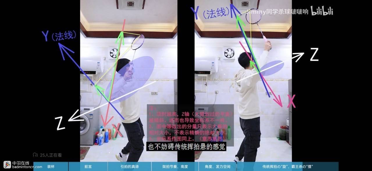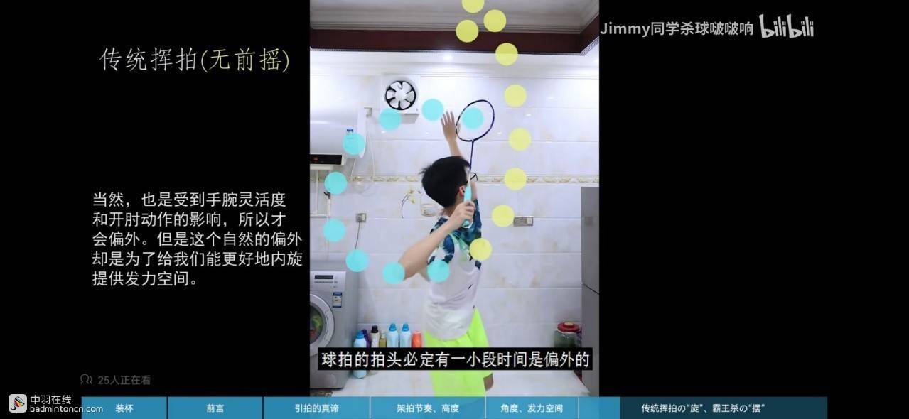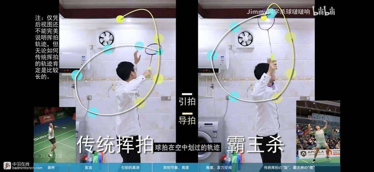 也正是因为“旋”的惯性的存在,所以,当我们在采用传统挥拍的过程中,球拍的拍头必定有一小段时间是偏外的。【而针对上一期视频中的这个片段,有位中羽球友评论道“就没有哪个职业选手杀球有这一帧”,emmm我的回答是:当时这个片段所演示的是单纯的顶肘引拍拆解动作,而非连贯的挥拍动作,所以,这就是矛盾所在。不过确实,上期视频对于引拍部分的解释过于疏忽了,没有考虑周全,造成矛盾,不过问题不大,我们继续往下】