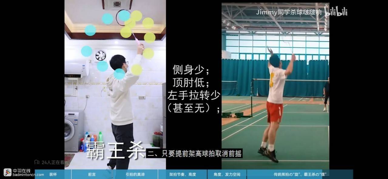 补充:一、由于霸王杀引拍过程中“旋”的惯性比较少,所以在挥拍过程中球拍偏外的幅度也就少了很多。二、只要提前架高球拍,取消前摇,都能找到霸王杀的感觉。侧身少、顶肘低、左手拉转少,这种感觉就比较接近于谌龙(但是矮个子要是不顶肘的话,估计得球下网);侧身多、顶肘高、左手拉转多,这种感觉就比较接近安塞龙魏楠