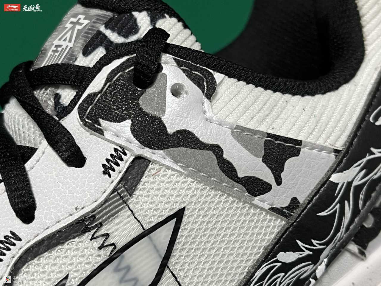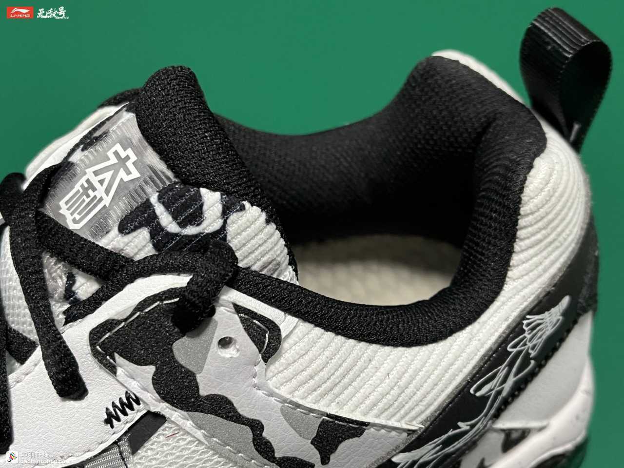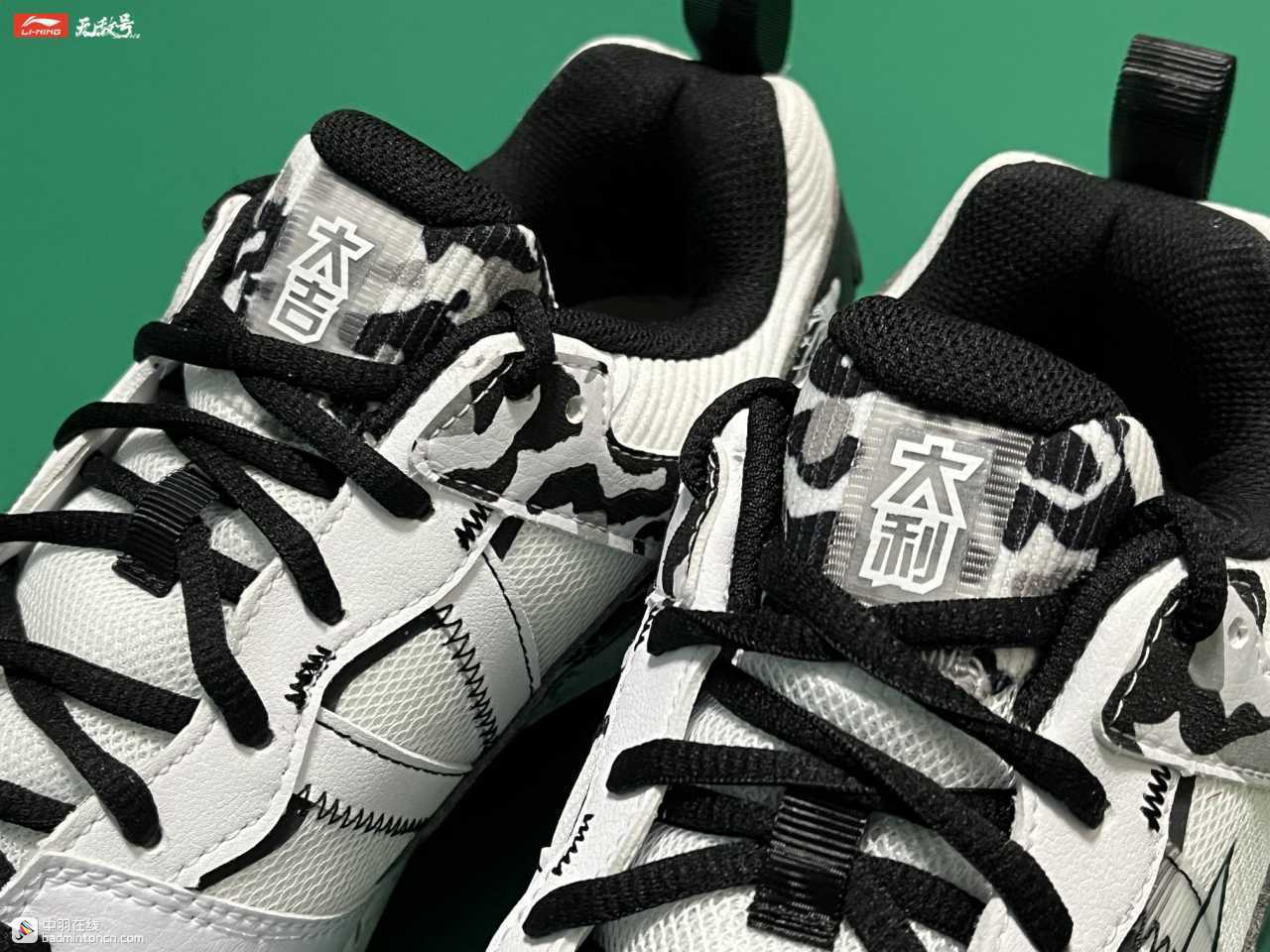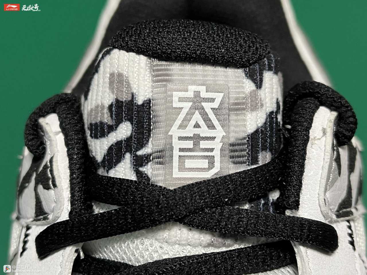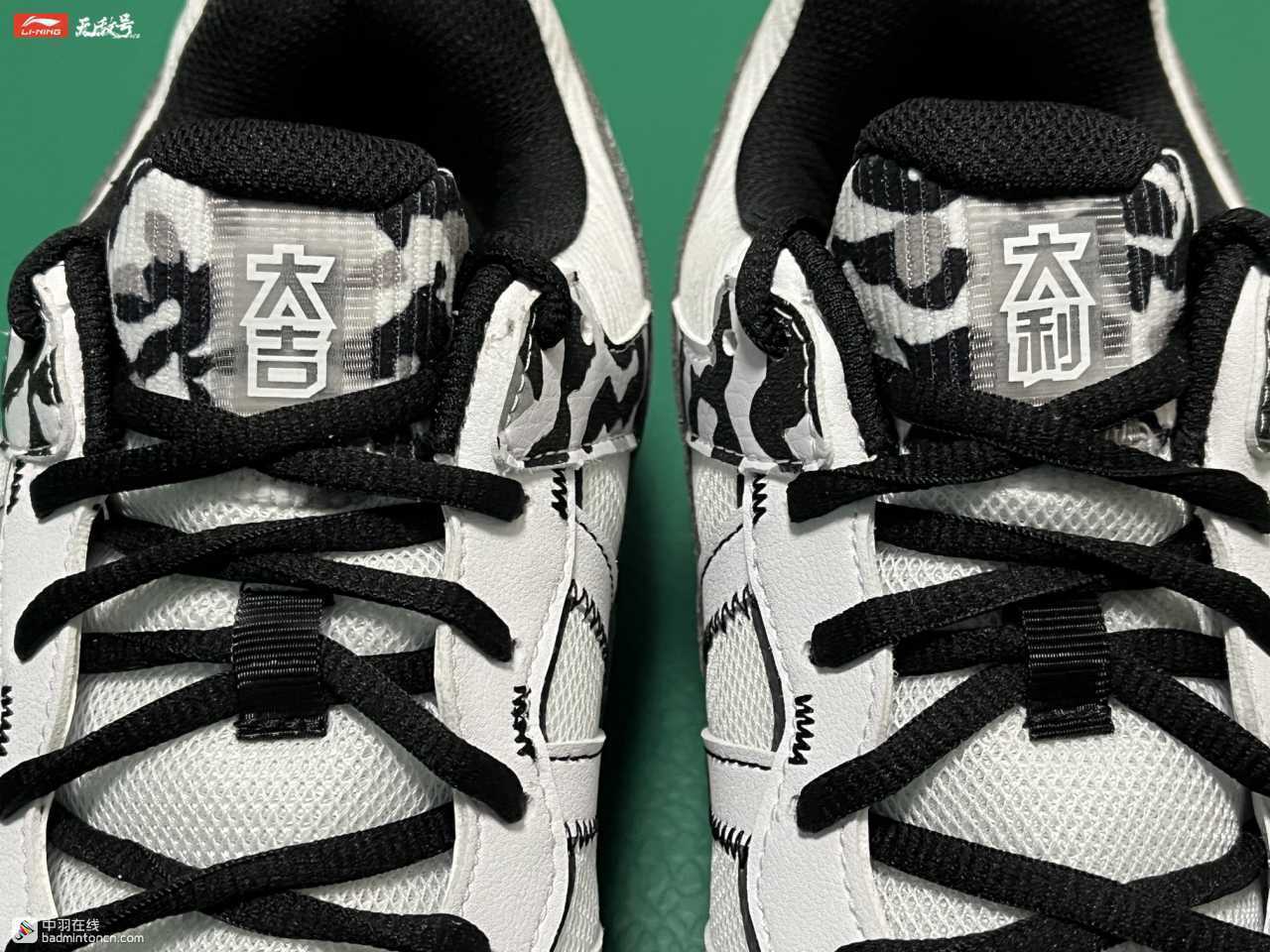最后来看鞋舌部分,其下半部分为纯白色,仅在最靠顶部的地方采用了迷彩色,灰色和黑色的迷彩图案簇拥着中央硕大的两个汉字,左右脚的汉字不同,右脚为“大吉”,左脚则是“大利”。“大吉大利”——一句中国人传统的美好祝福,彰显品牌精神与文化。