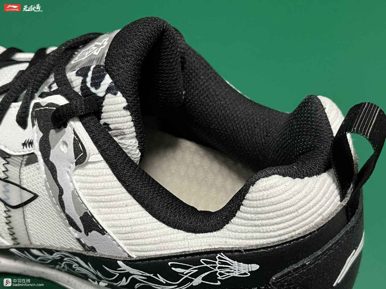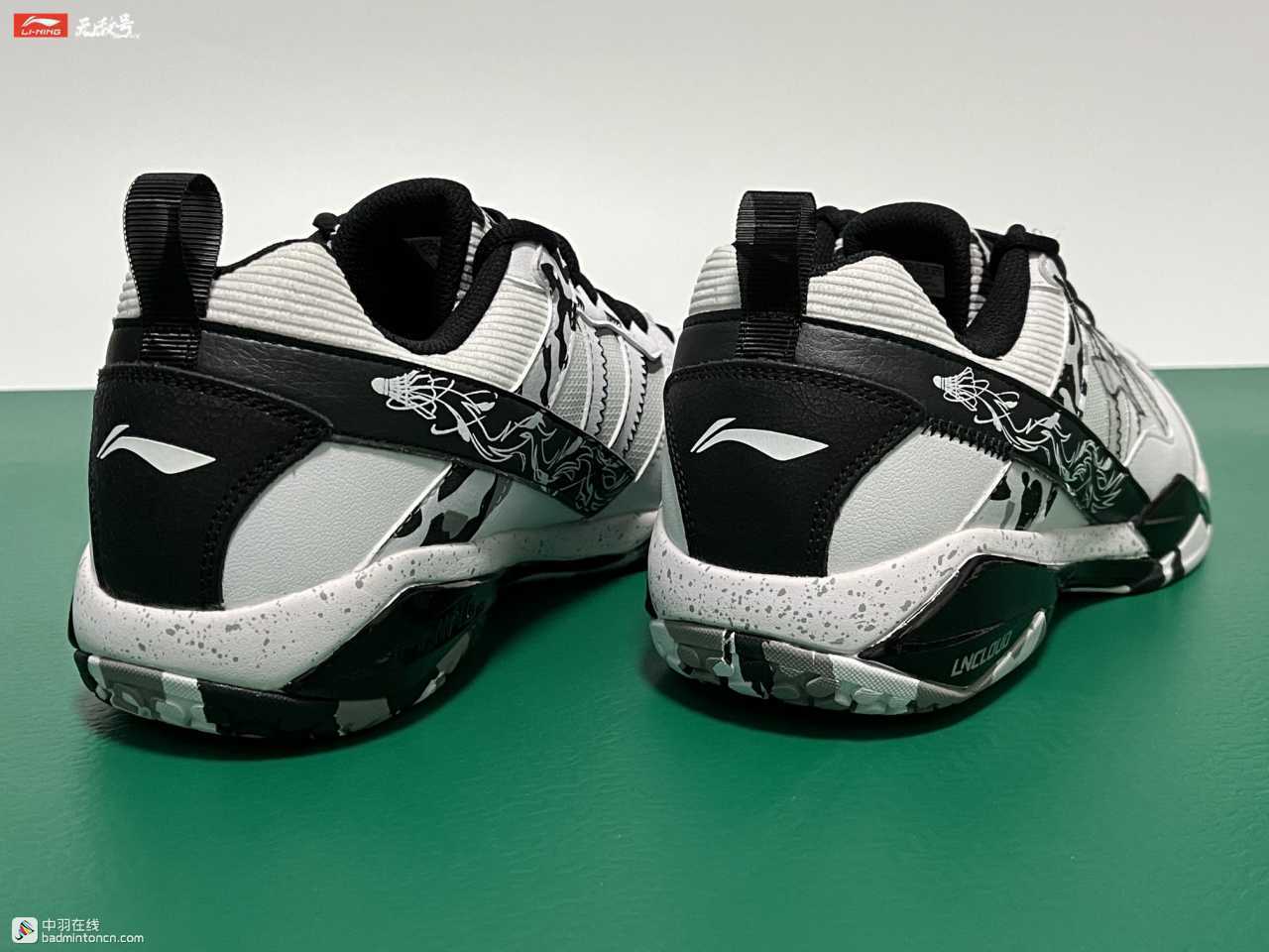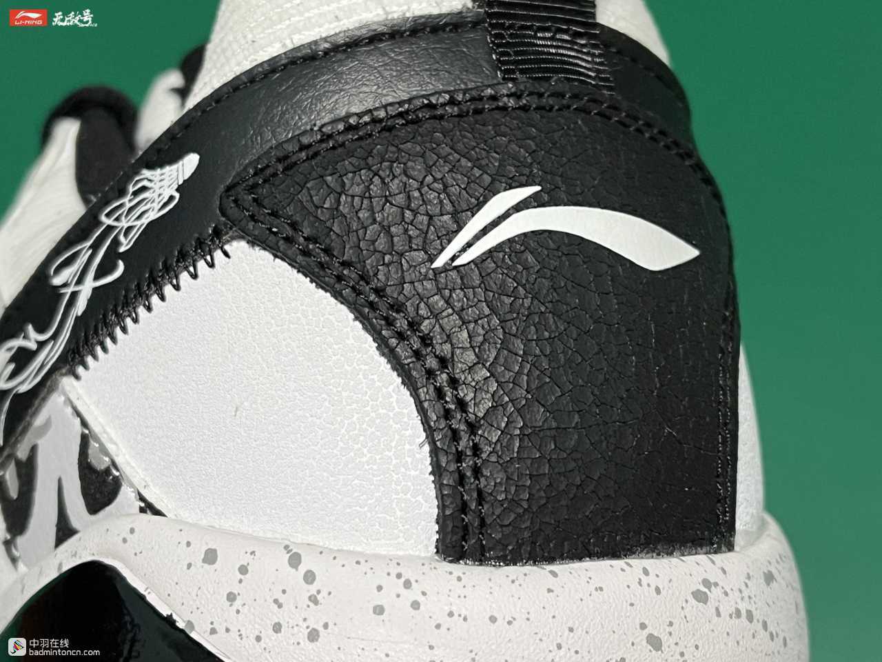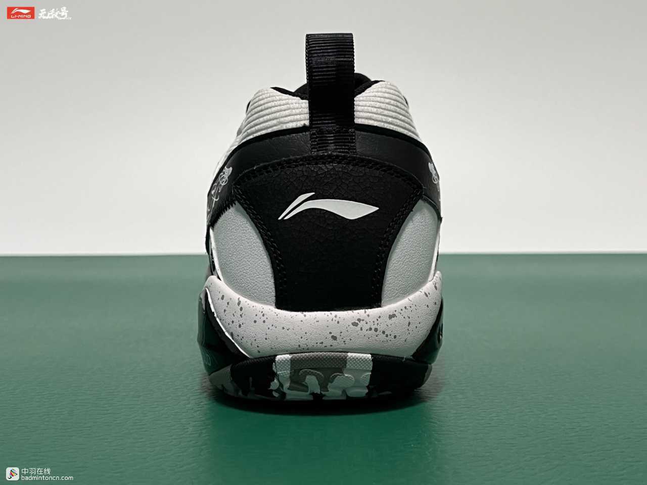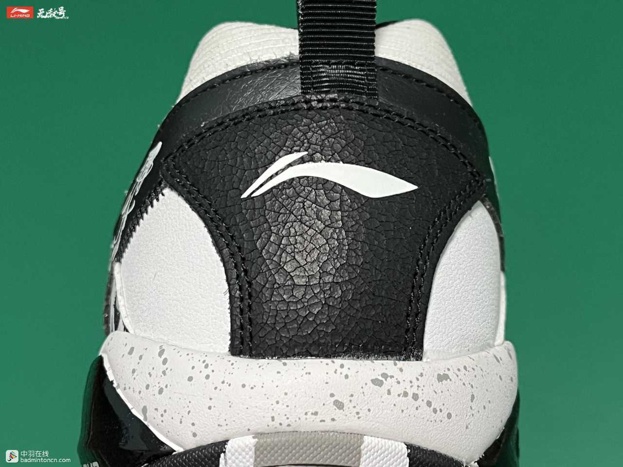 两道黑色皮革自中底中部而起,向鞋跟顶部延伸,两颗羽毛球腾空而起,直冲云霄,会聚于顶点。下方一大块黑色皮革上印着白色的李宁LOGO,非常醒目,也对鞋的整体设计起到了很好的修饰作用。