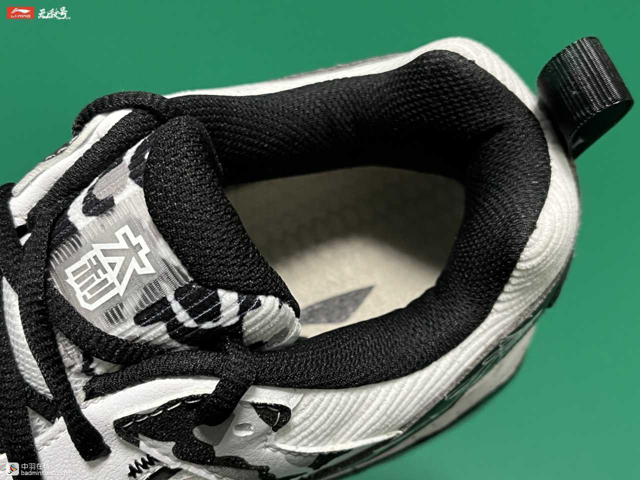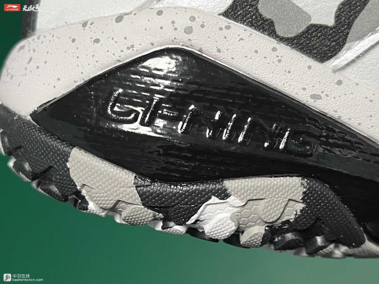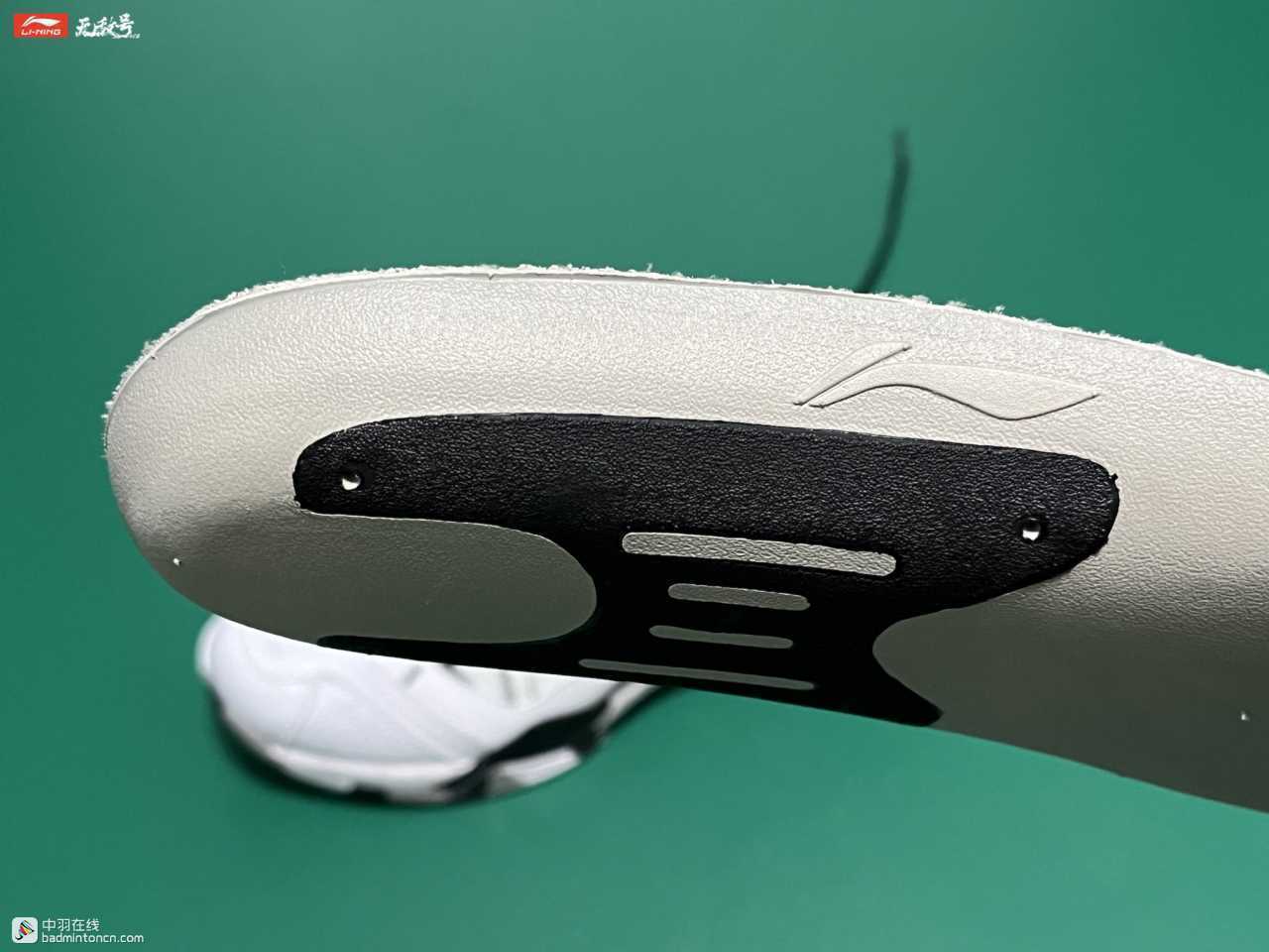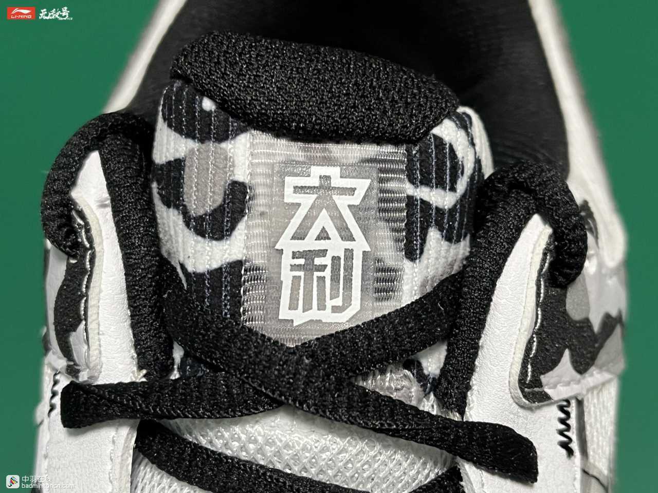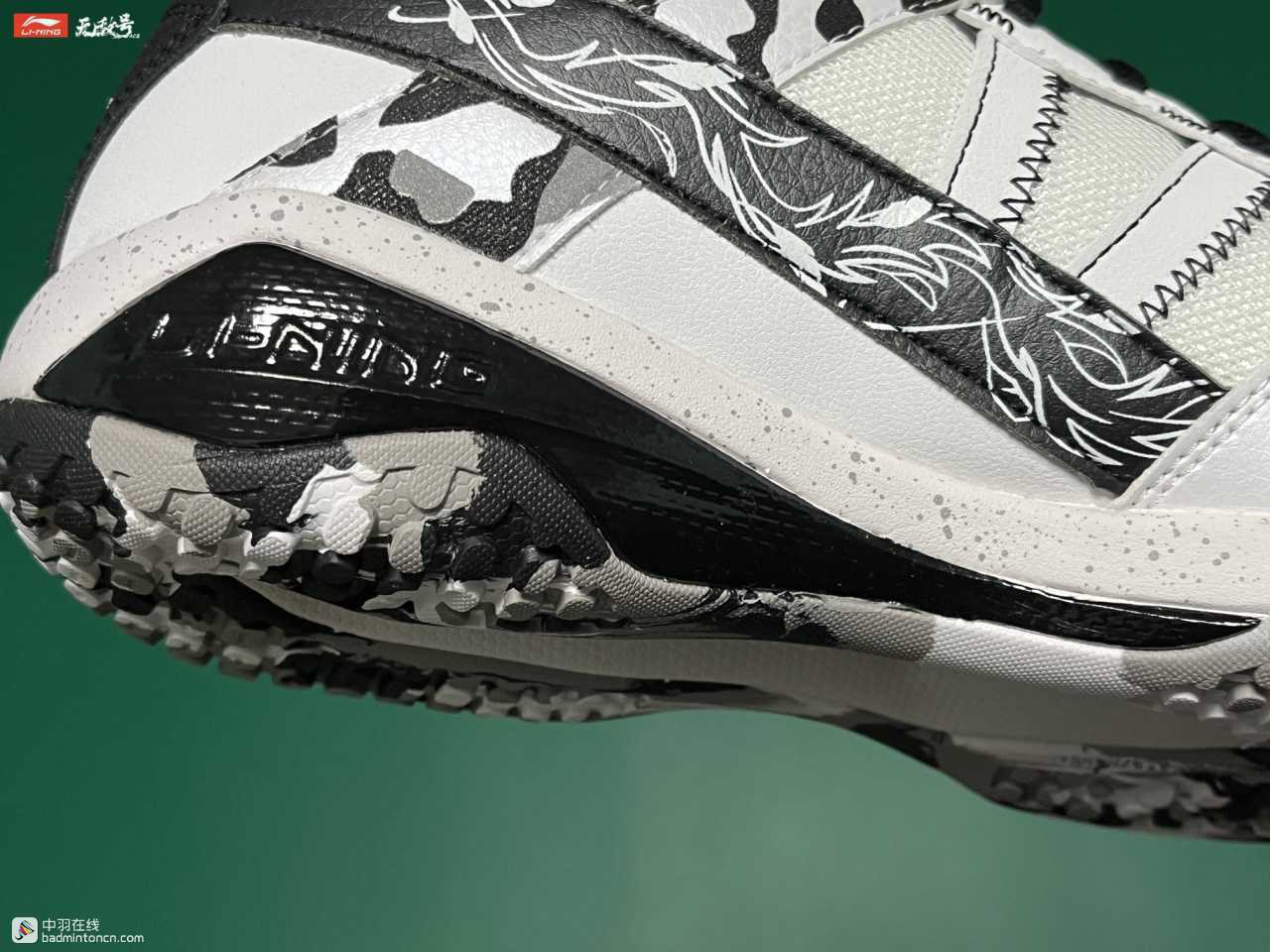两道黑色皮革自中底中部而起,向鞋跟顶部延伸,两颗羽毛球腾空而起,直冲云霄,会聚于顶点。下方一大块黑色皮革上印着白色的李宁LOGO,非常醒目,也对鞋的整体设计起到了很好的修饰作用。