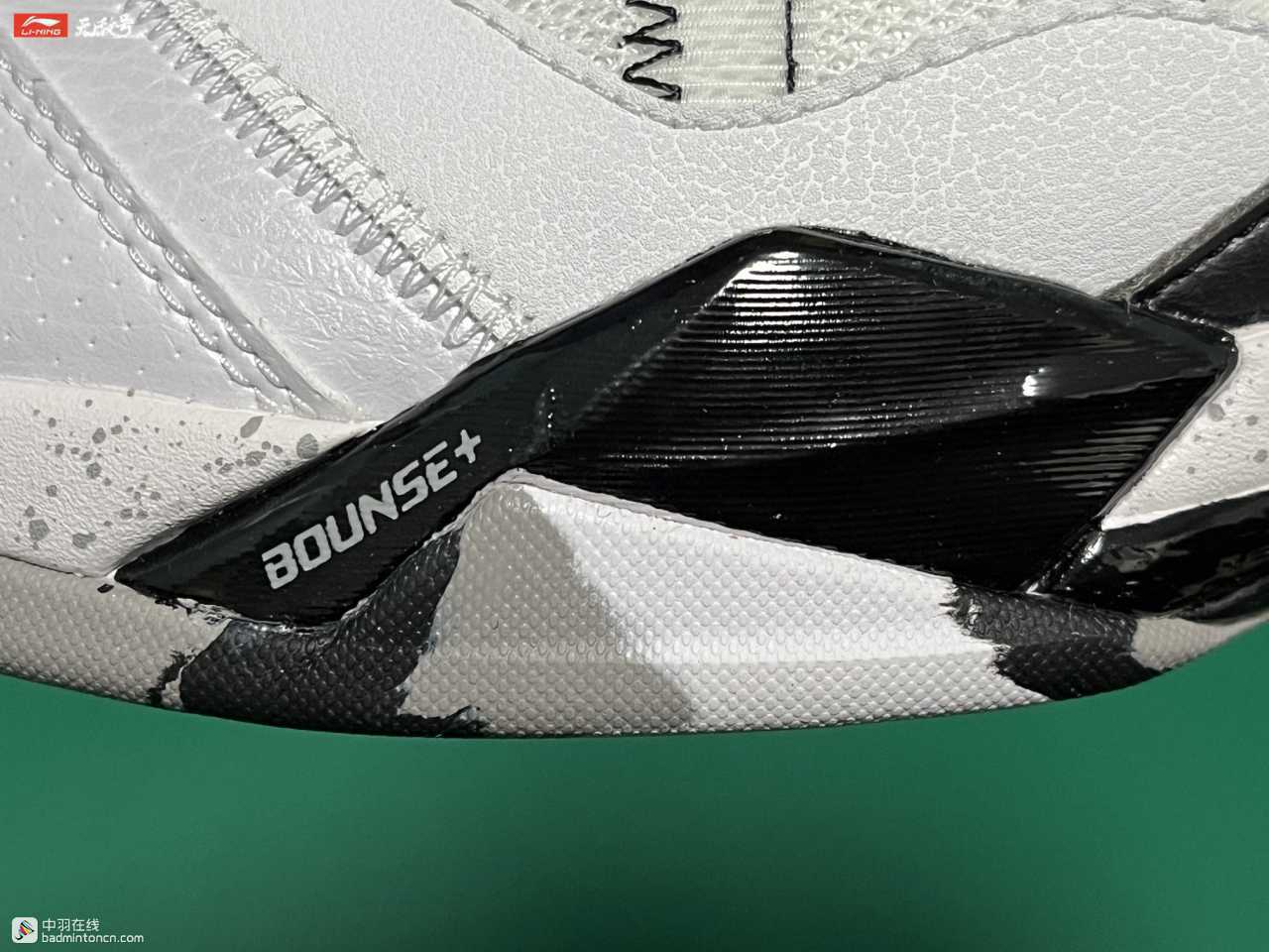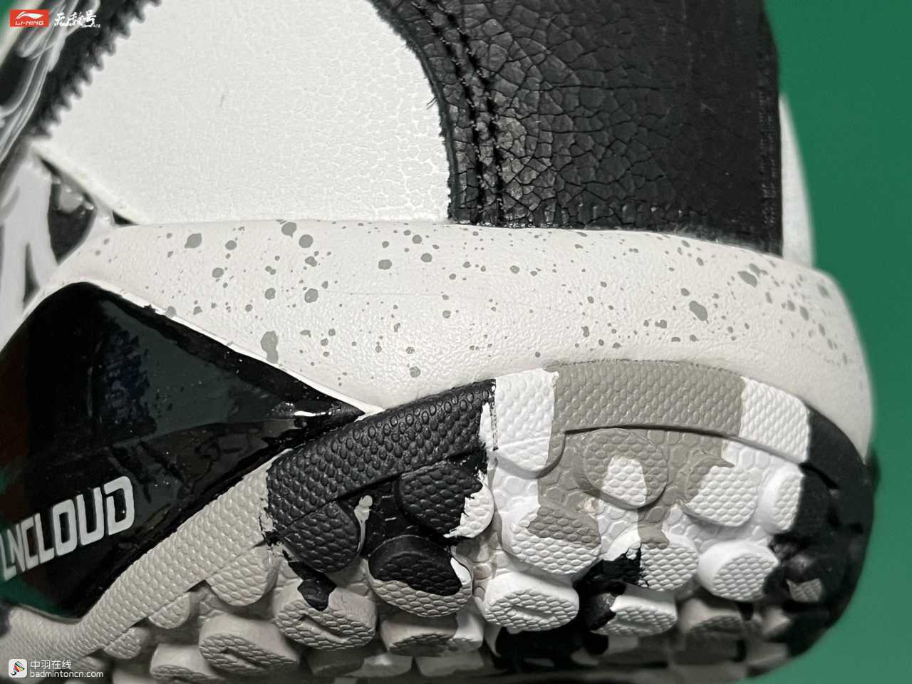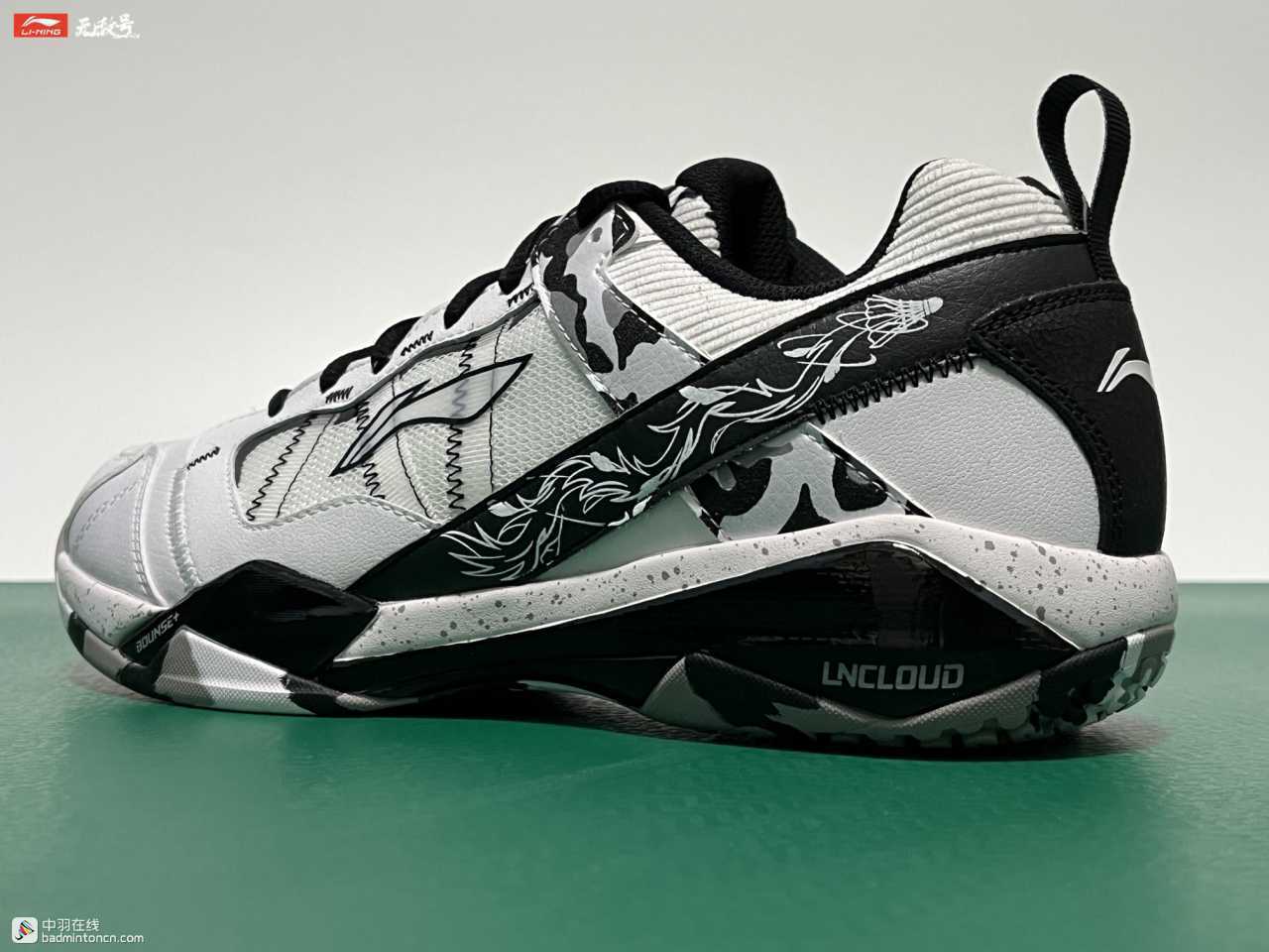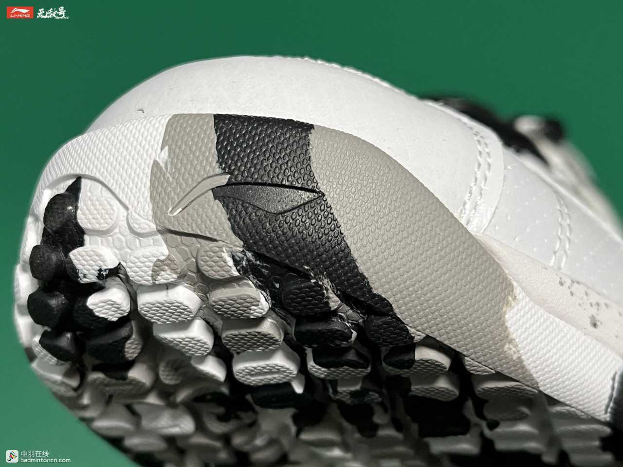 两道黑色皮革自中底中部而起,向鞋跟顶部延伸,两颗羽毛球腾空而起,直冲云霄,会聚于顶点。下方一大块黑色皮革上印着白色的李宁LOGO,非常醒目,也对鞋的整体设计起到了很好的修饰作用。