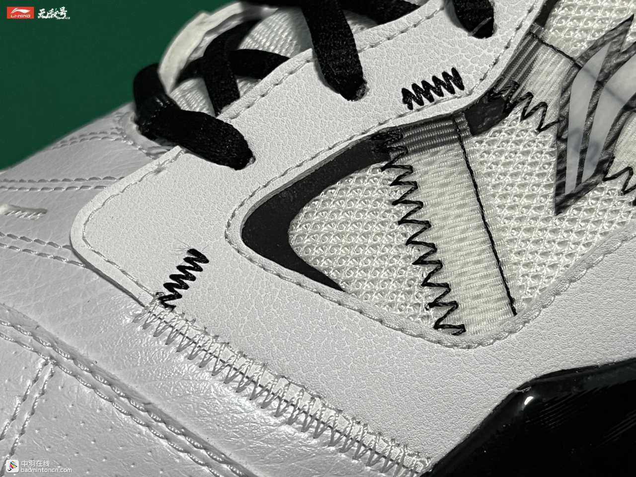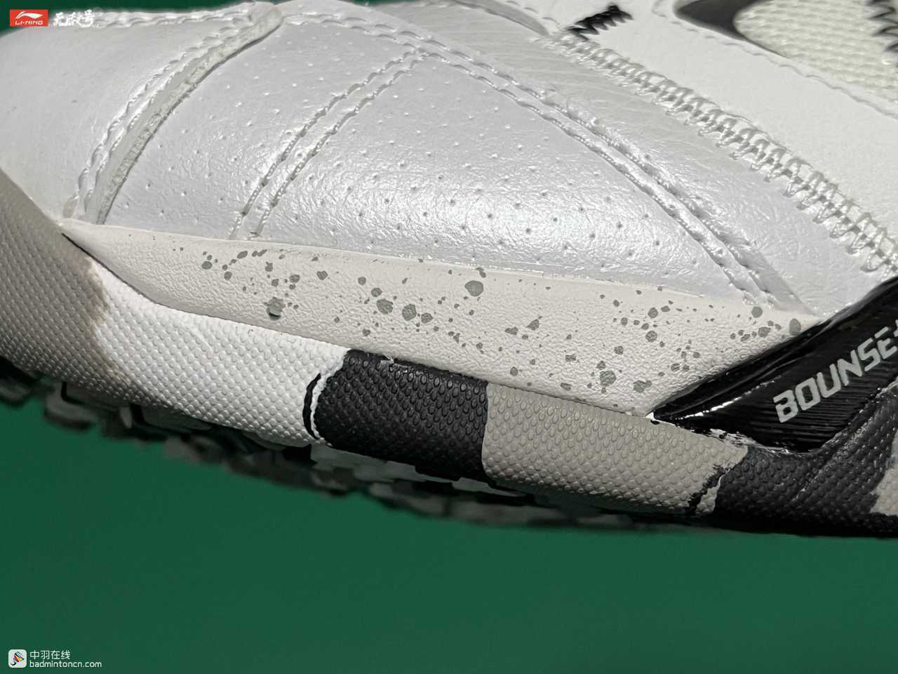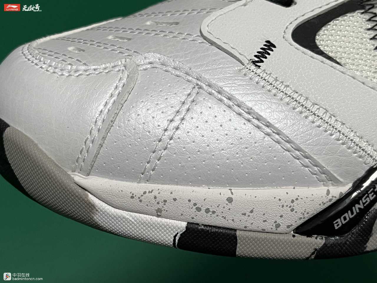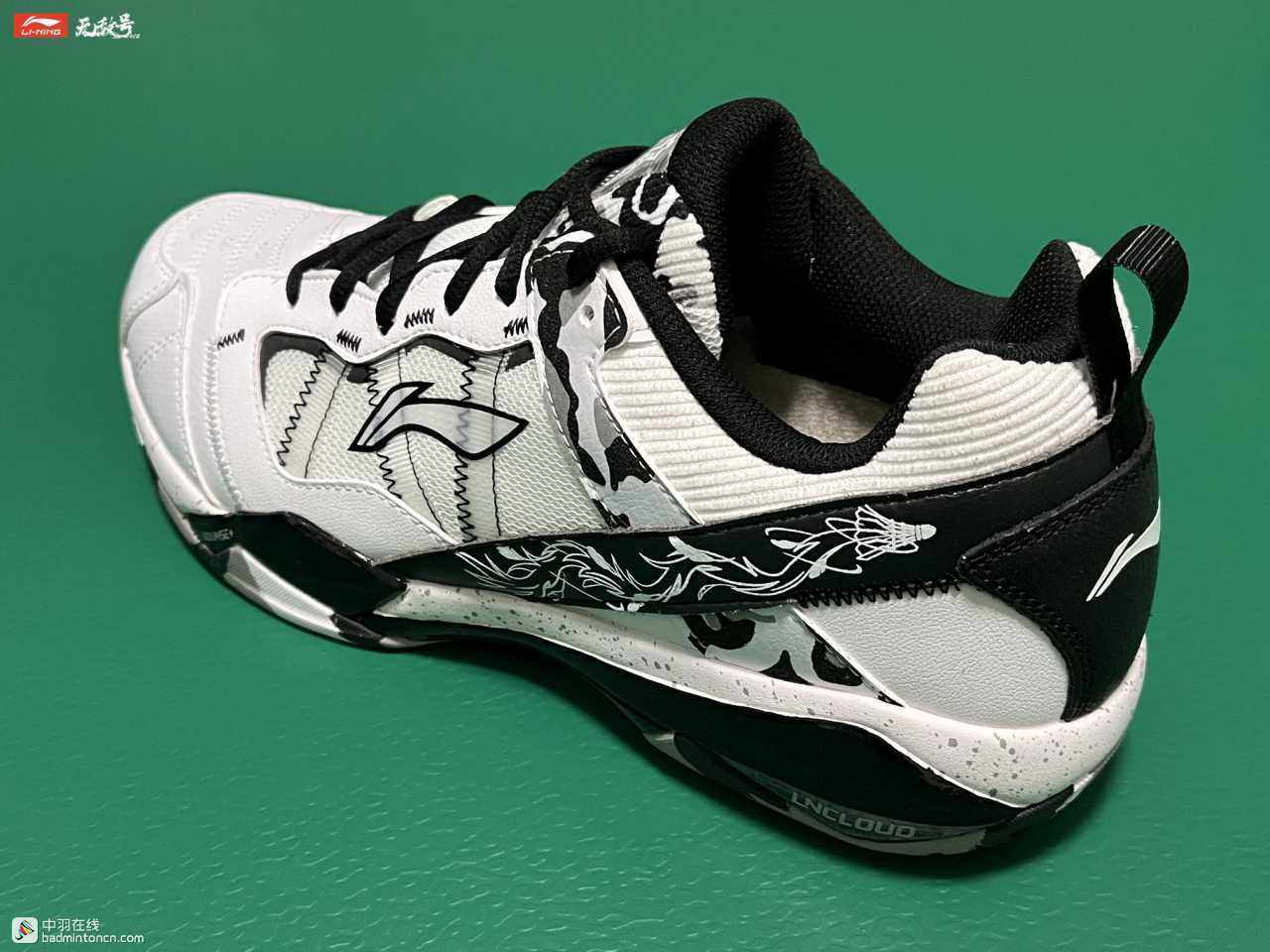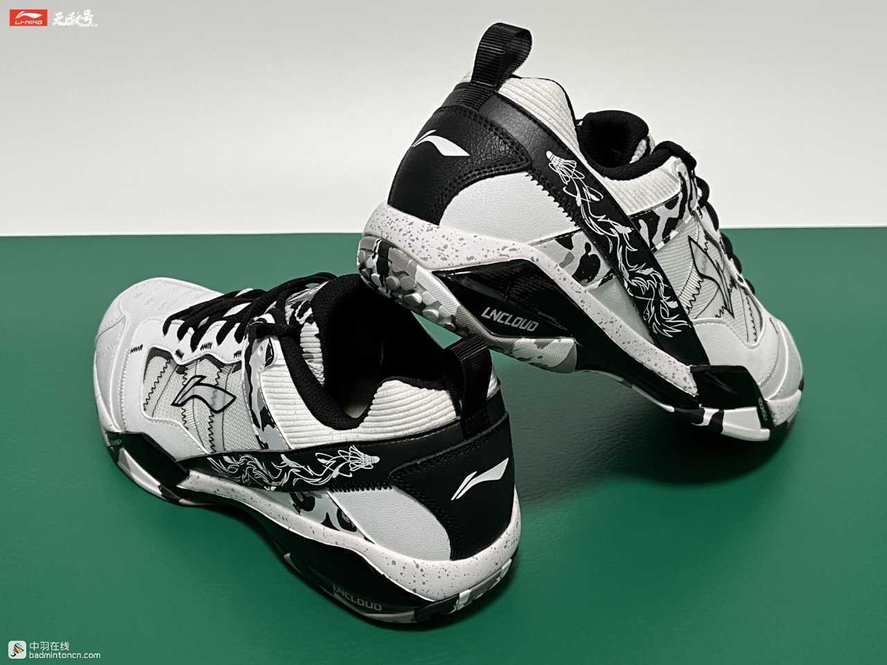 两道黑色皮革自中底中部而起,向鞋跟顶部延伸,两颗羽毛球腾空而起,直冲云霄,会聚于顶点。下方一大块黑色皮革上印着白色的李宁LOGO,非常醒目,也对鞋的整体设计起到了很好的修饰作用。