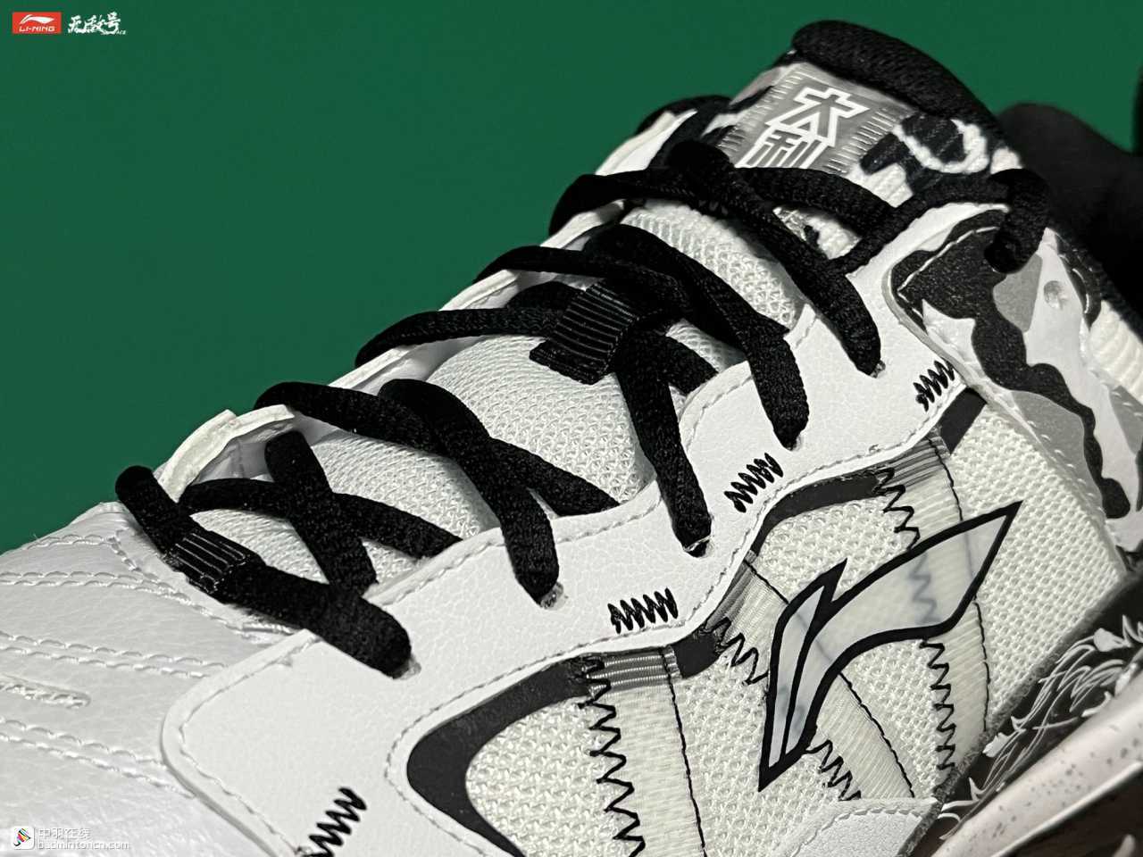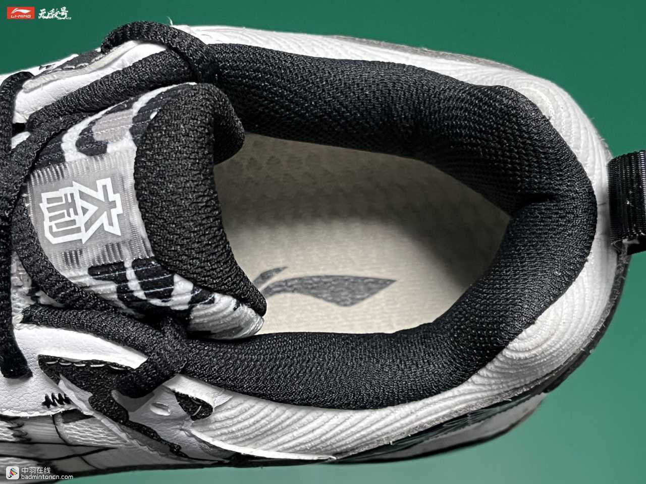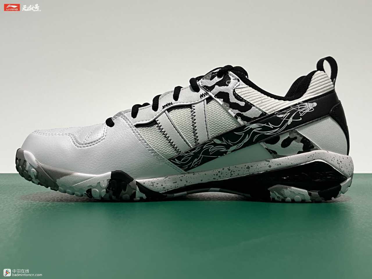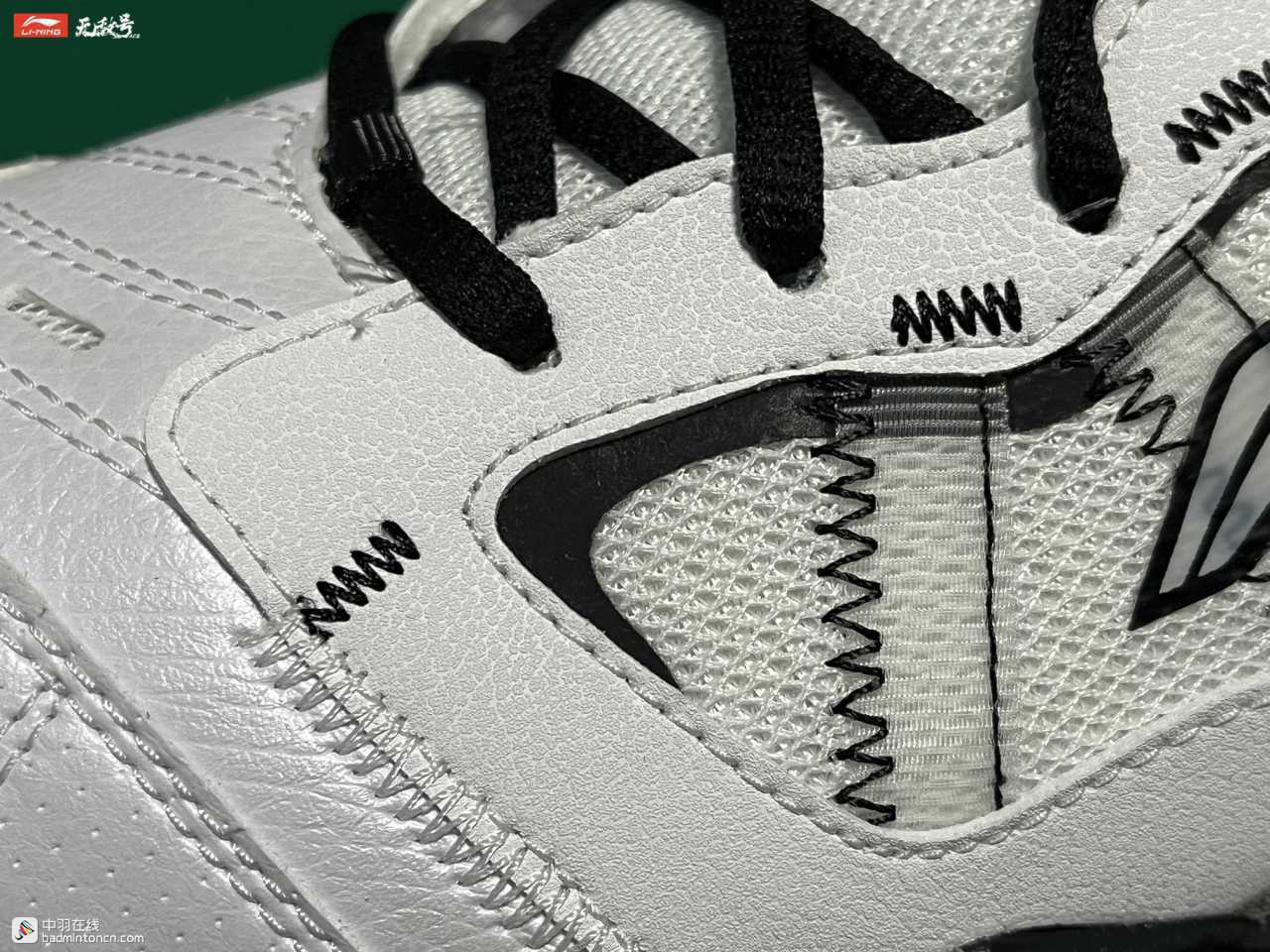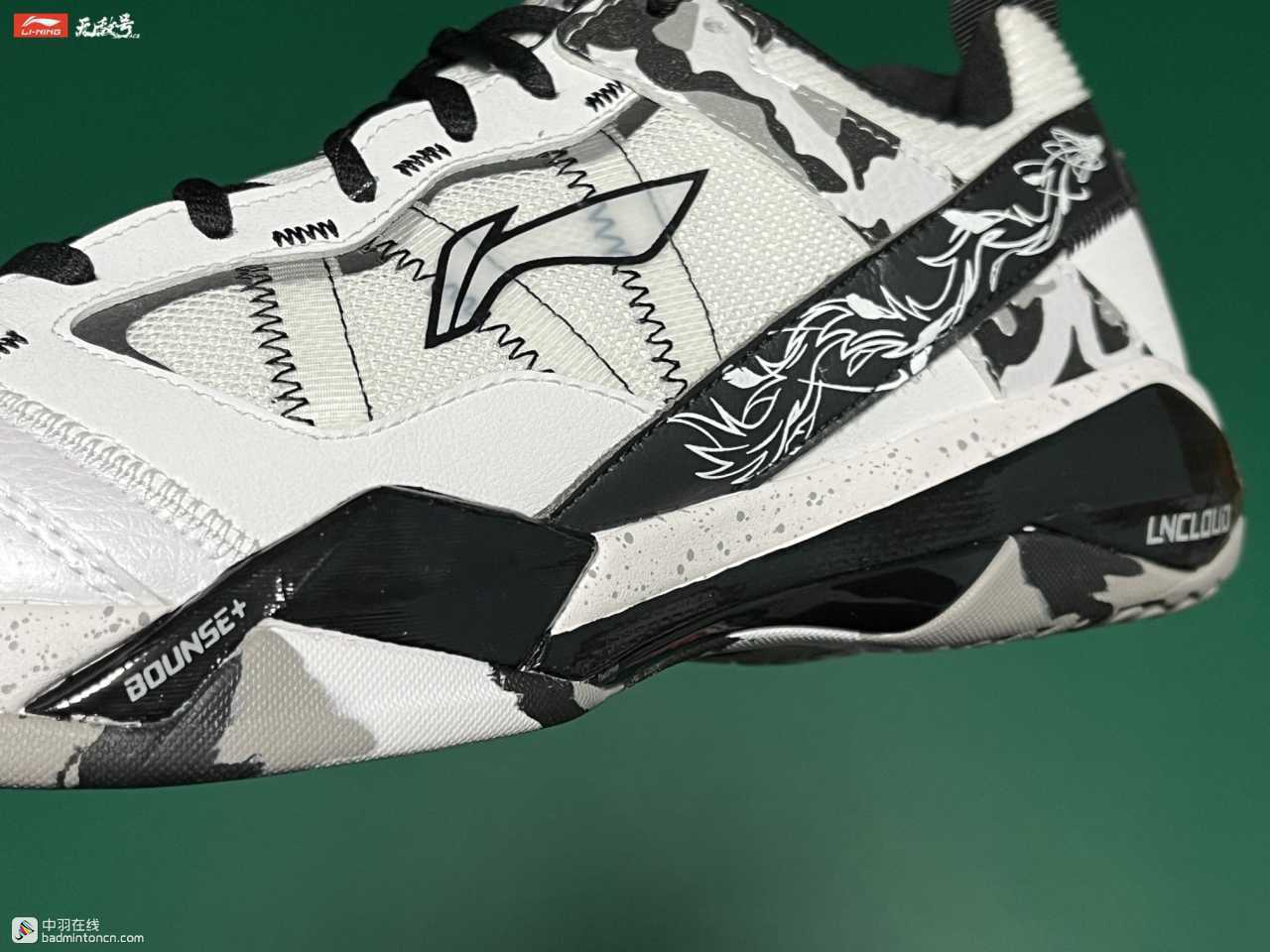 两道黑色皮革自中底中部而起,向鞋跟顶部延伸,两颗羽毛球腾空而起,直冲云霄,会聚于顶点。下方一大块黑色皮革上印着白色的李宁LOGO,非常醒目,也对鞋的整体设计起到了很好的修饰作用。