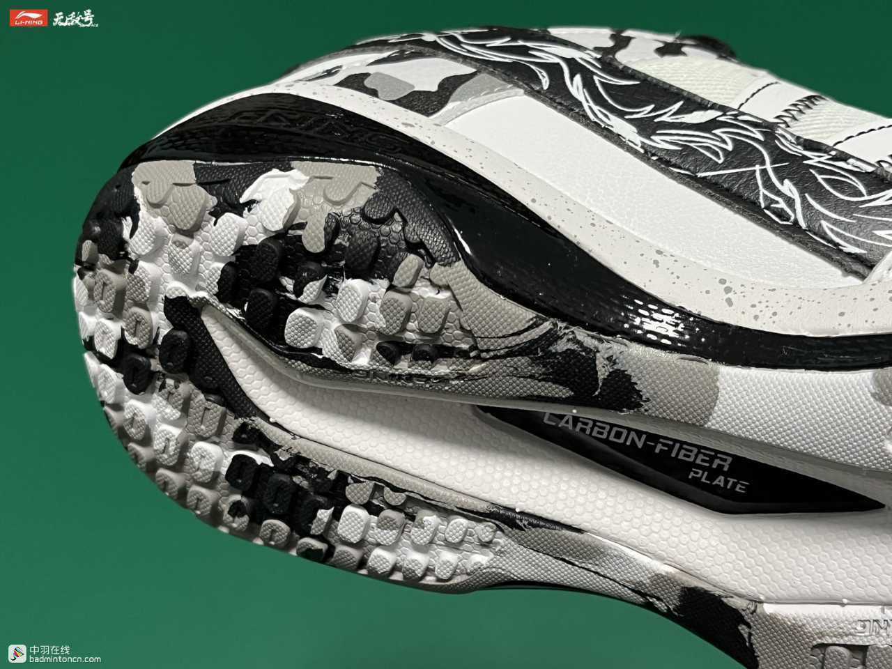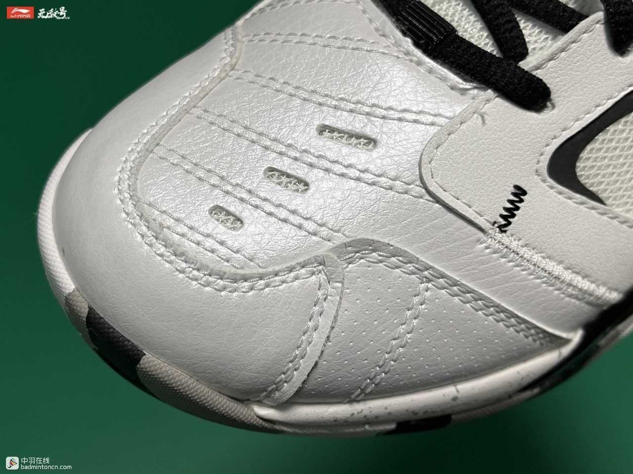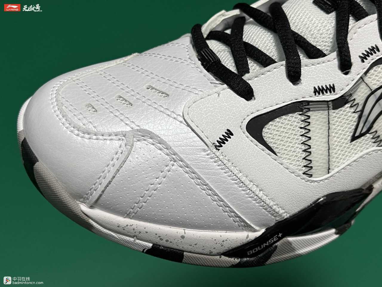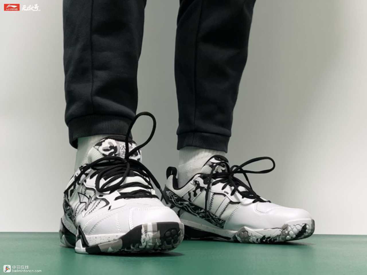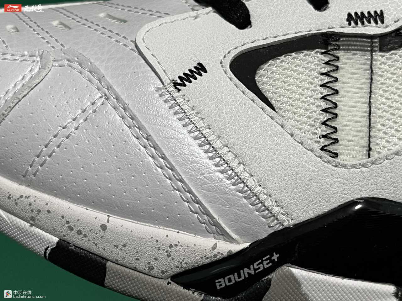 两道黑色皮革自中底中部而起,向鞋跟顶部延伸,两颗羽毛球腾空而起,直冲云霄,会聚于顶点。下方一大块黑色皮革上印着白色的李宁LOGO,非常醒目,也对鞋的整体设计起到了很好的修饰作用。
