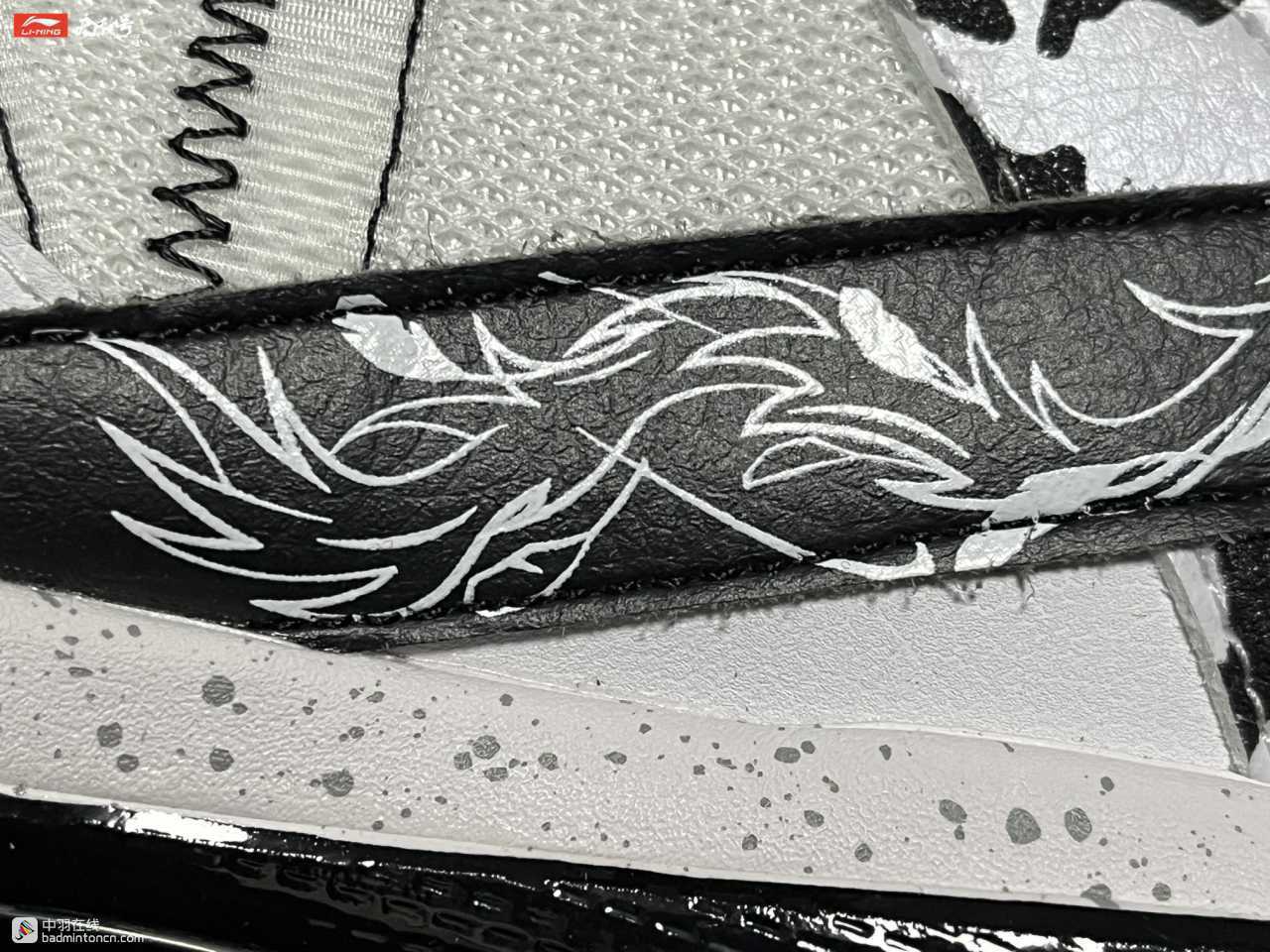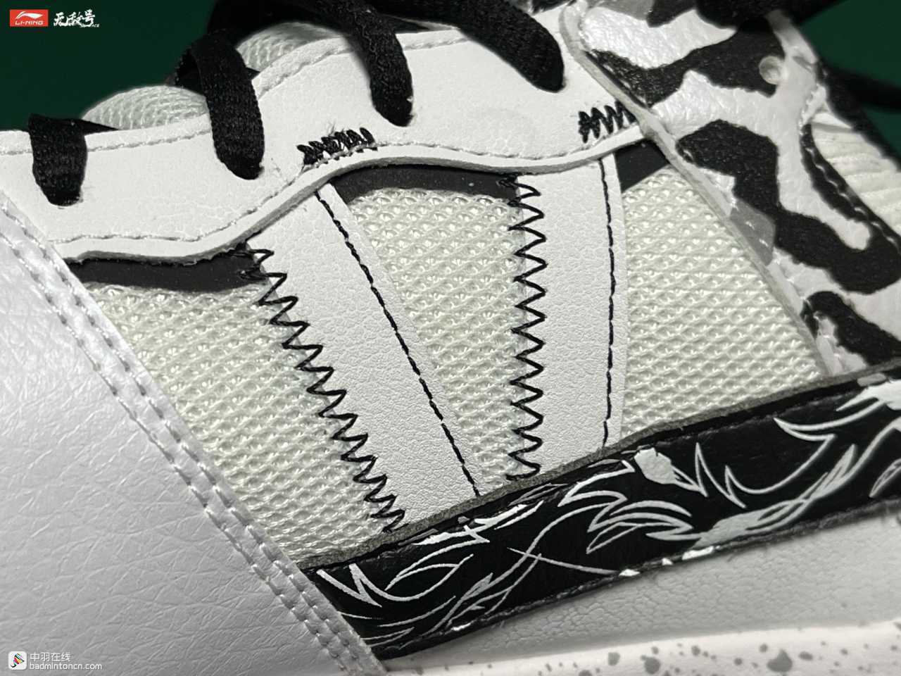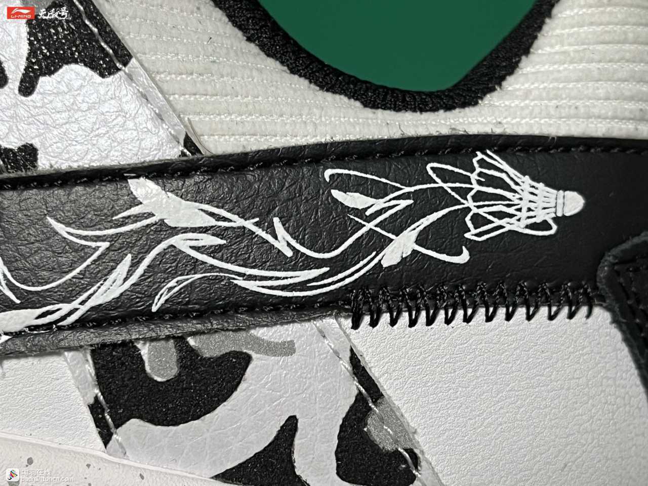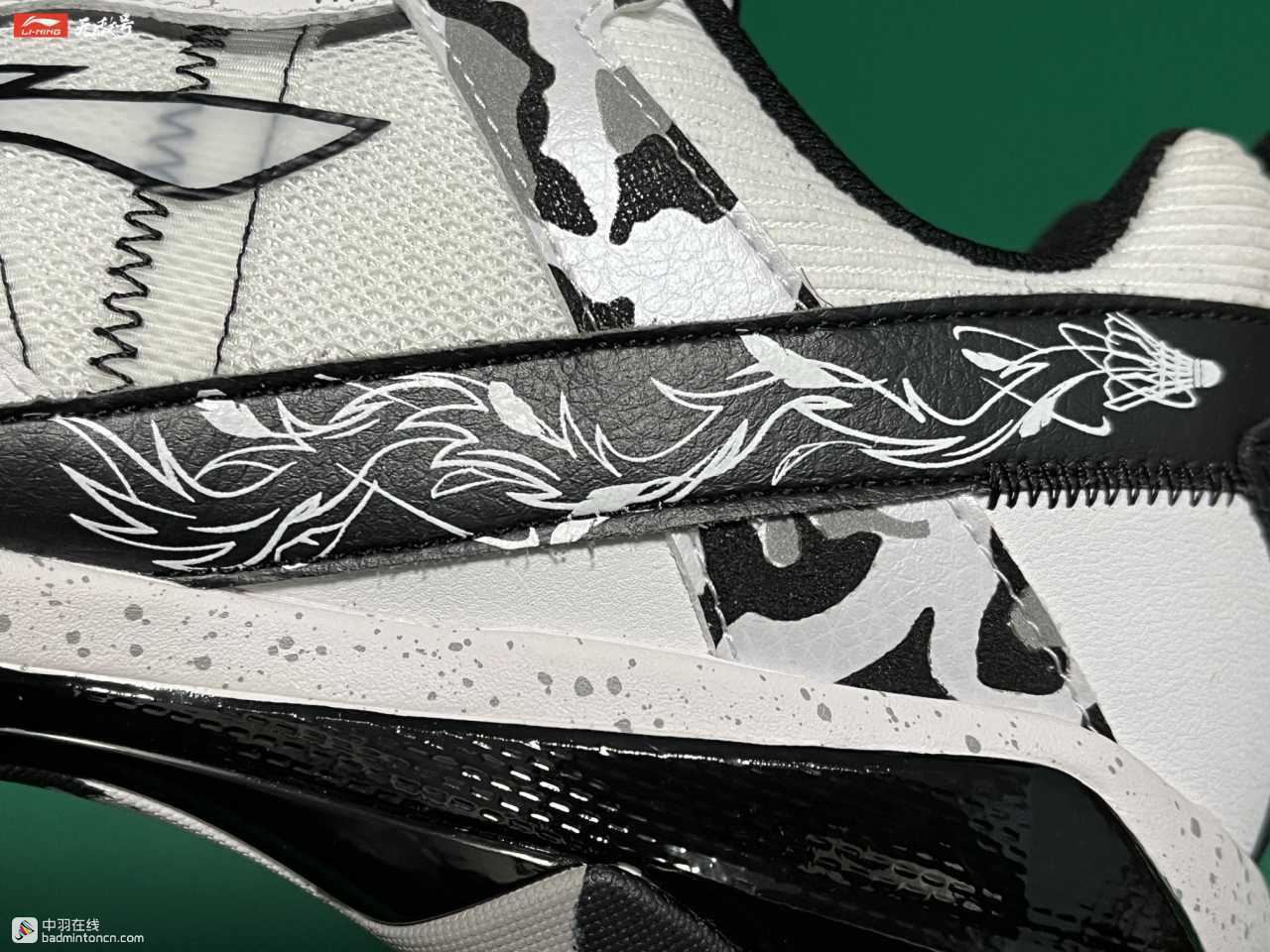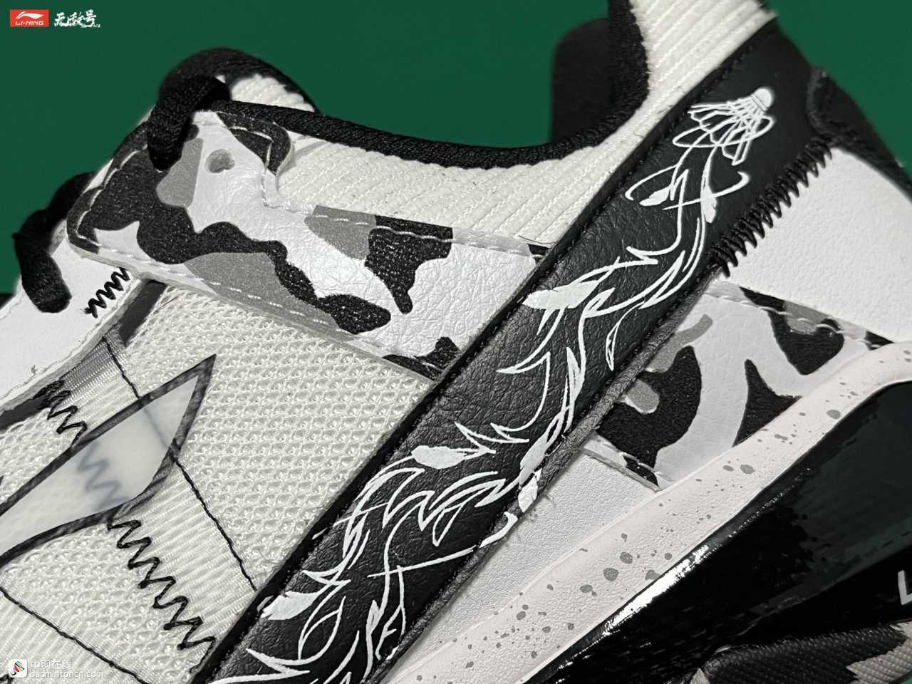而侧面与迷彩皮革相交错的黑色皮革上,用简笔画的形式,勾勒出一颗羽毛球的图案及其飞行的轨迹,很有现代艺术感。得益于此,在以复古外观为设计风格的无敌号ACE雪地迷彩上,也平添了几分现代的气息。