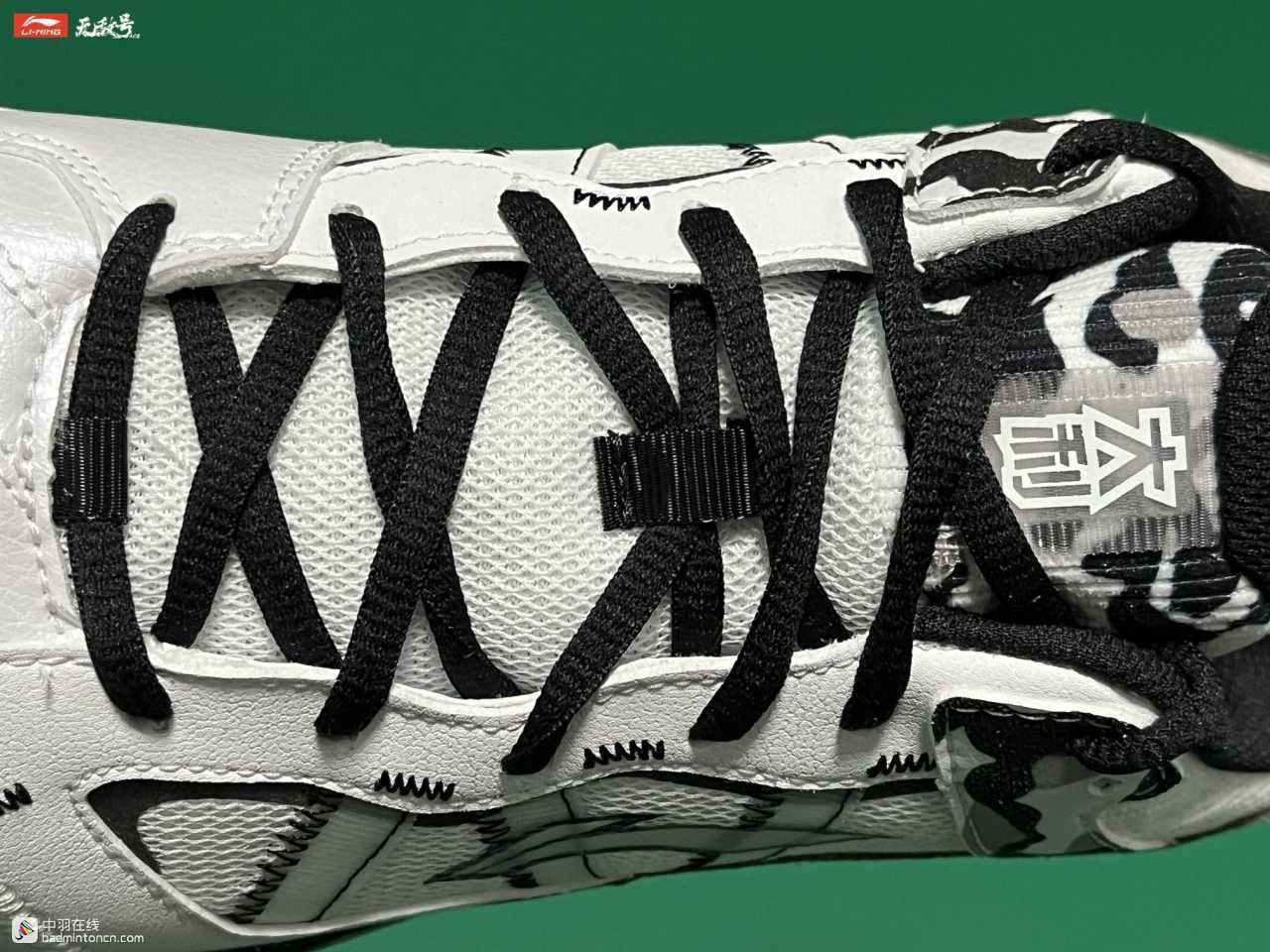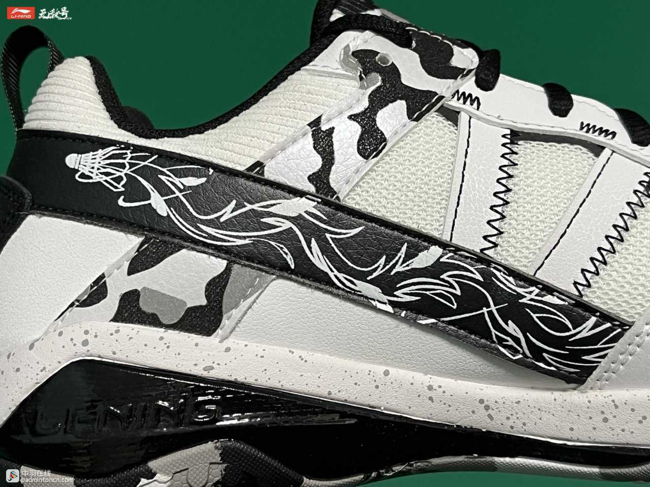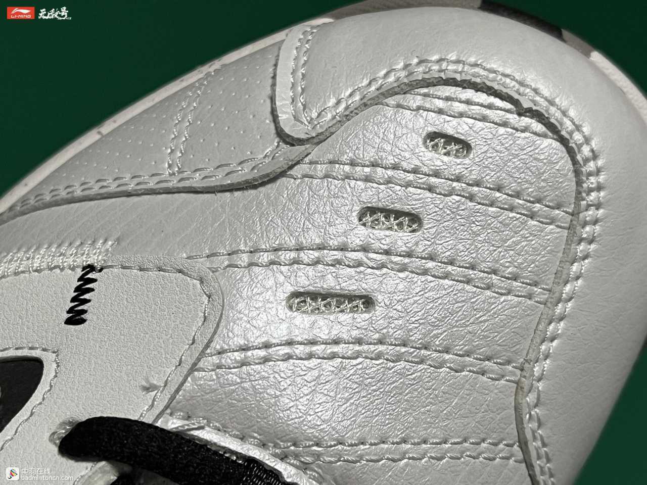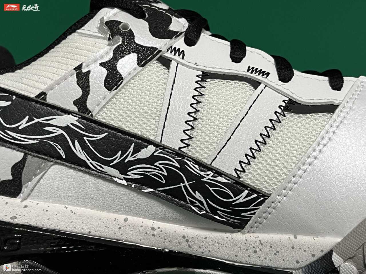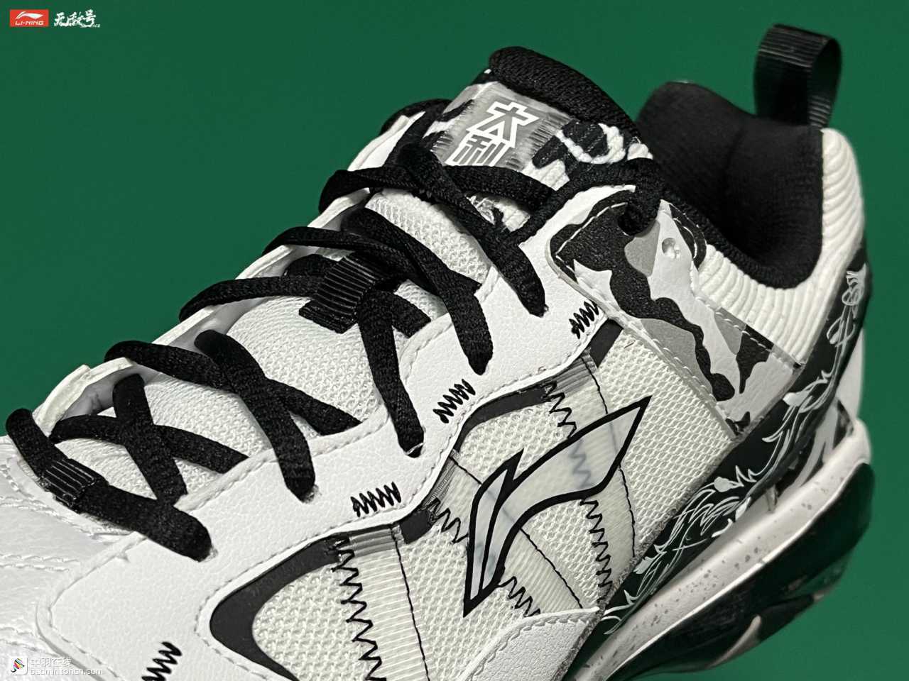 而侧面与迷彩皮革相交错的黑色皮革上,用简笔画的形式,勾勒出一颗羽毛球的图案及其飞行的轨迹,很有现代艺术感。得益于此,在以复古外观为设计风格的无敌号ACE雪地迷彩上,也平添了几分现代的气息。
