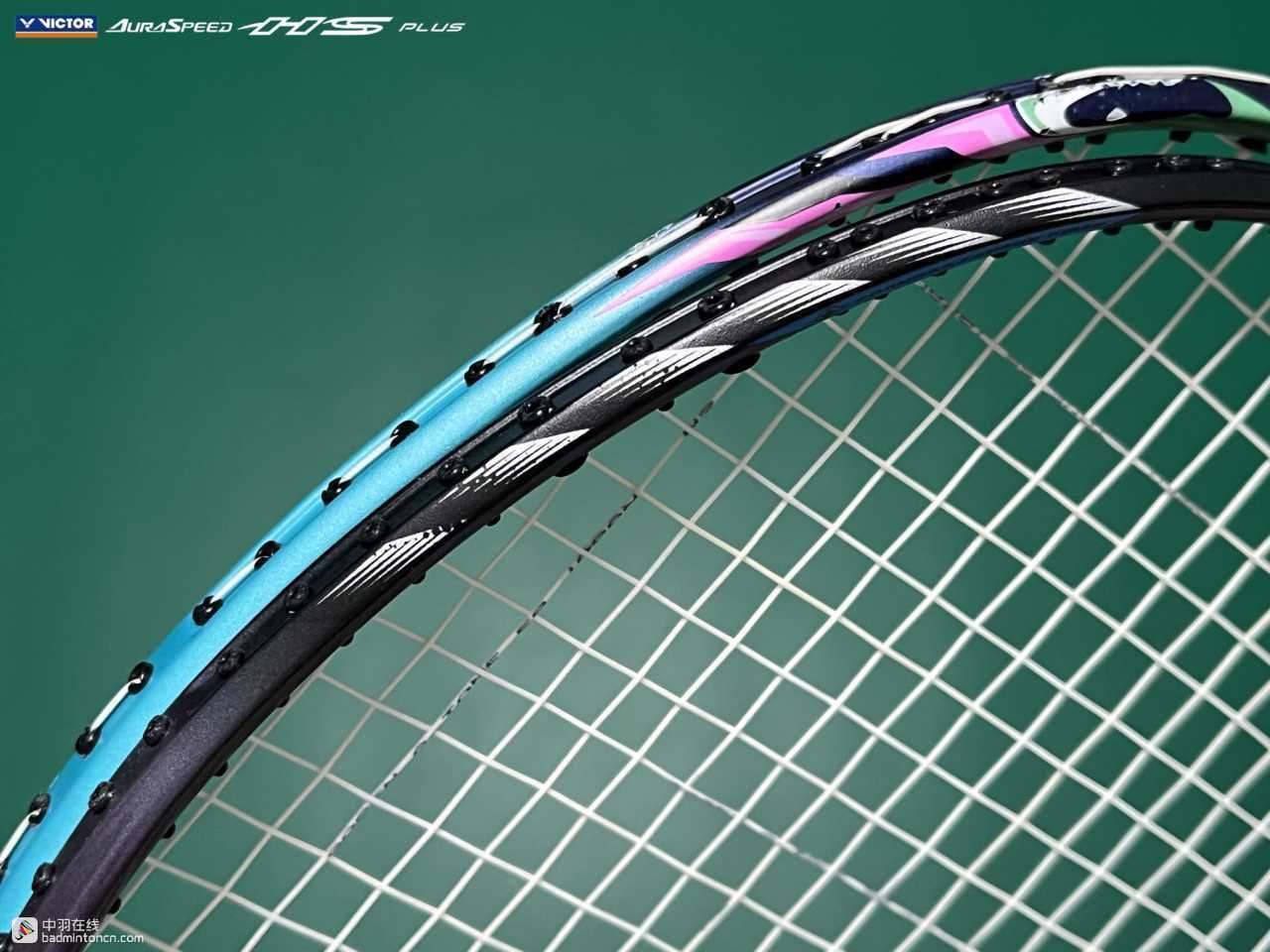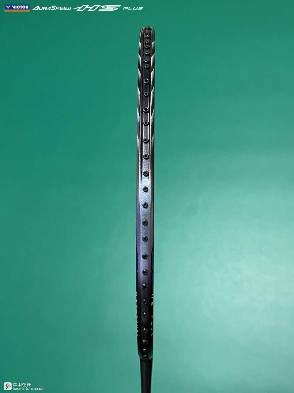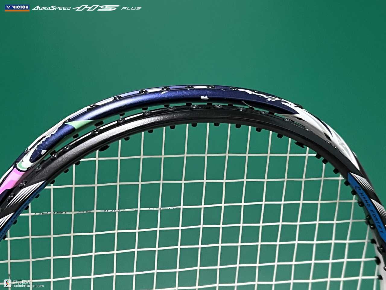 ARS-HS PLUS的拍框采用左右对称式设计,三通处以及拍框上半部分为黑色,而两侧大约3点至4点、8点至9点的部分采用带有磨砂质感的变色龙漆,正看为绿色,而侧看则为紫色,显露出一种低调的奢华。