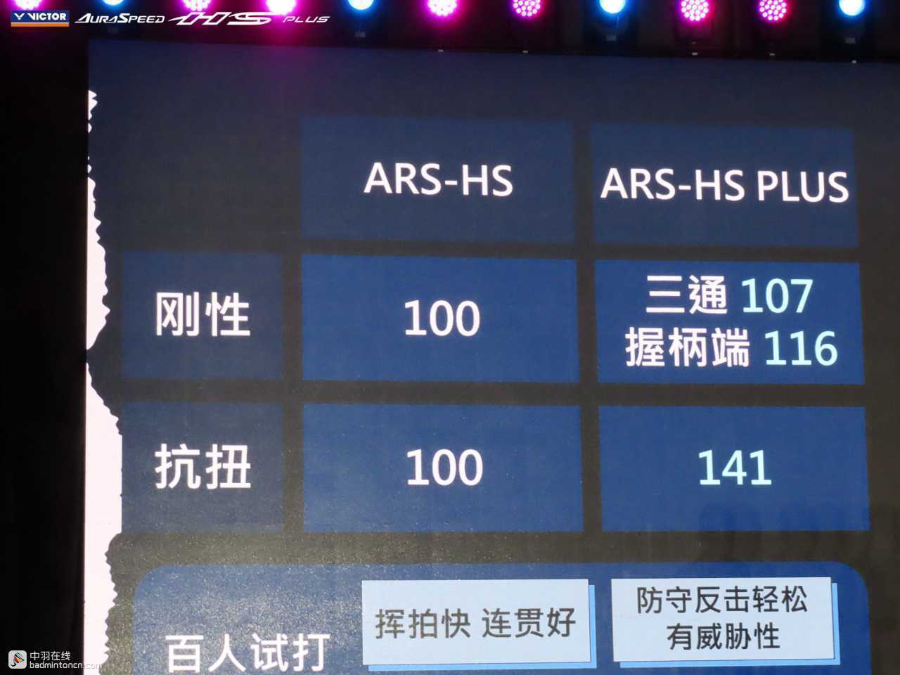 到了击球的过程中,ARS-HS PLUS极致的硬弹与干脆反馈淋漓尽致地体现了出来。和空挥时的印象一样,ARS-HS PLUS的挥重比ARS-HS小,挥速更快,挥拍过程中头重感不明显,再加上中杆硬度高、较难打出形变,整体来说拍头的借力感并不明显,因此在回击高远球时需要较多主动发力,才能够打出足够扎实的挥球,这一点和中杆韧弹、容易借力并打出鞭击感的ARS-HS是截然不同的。