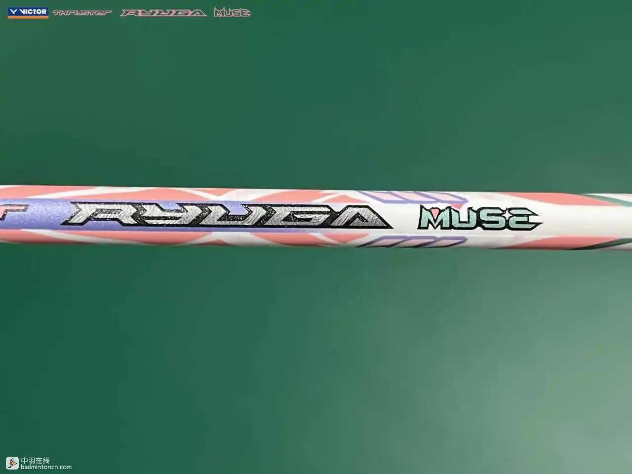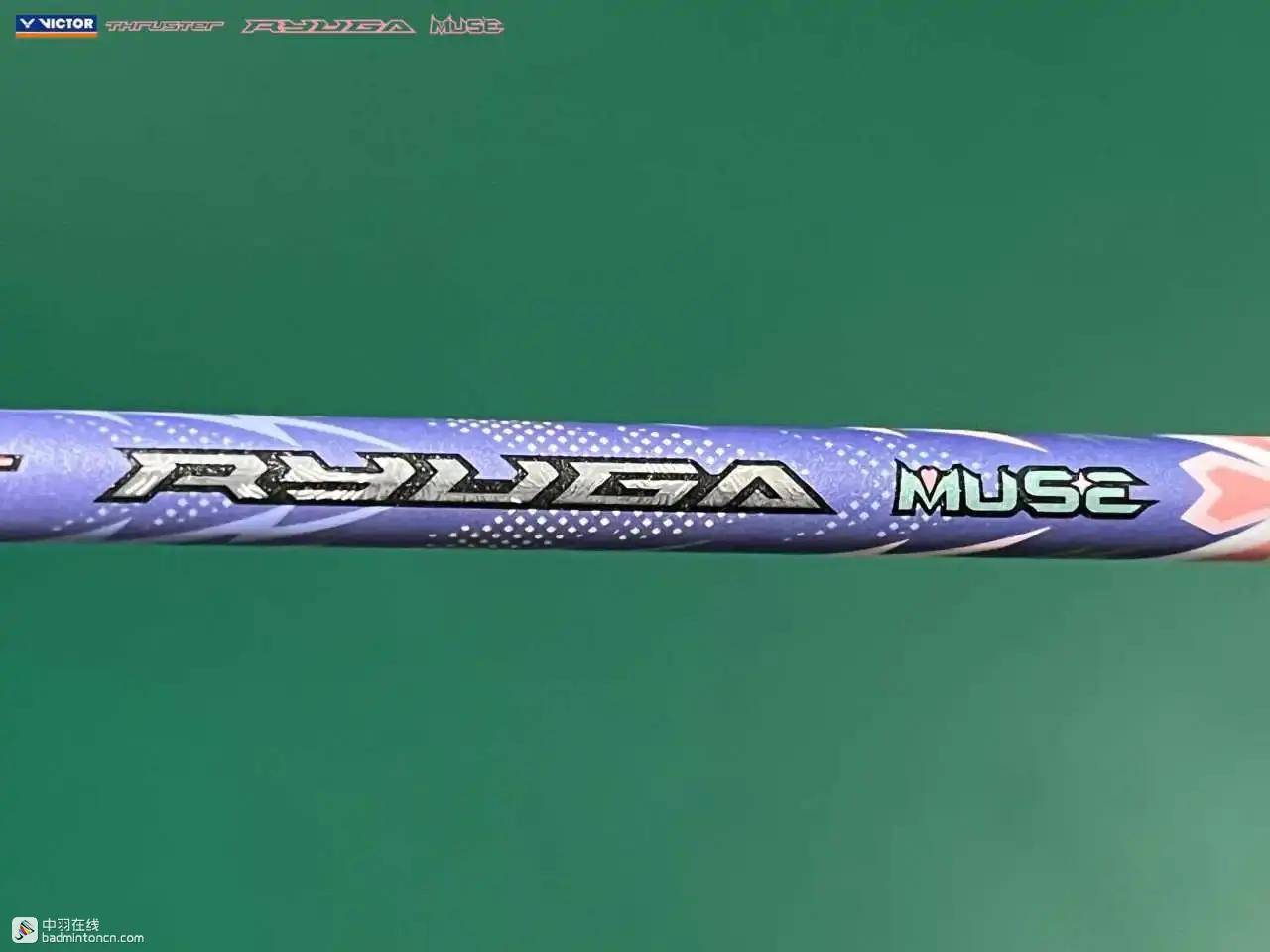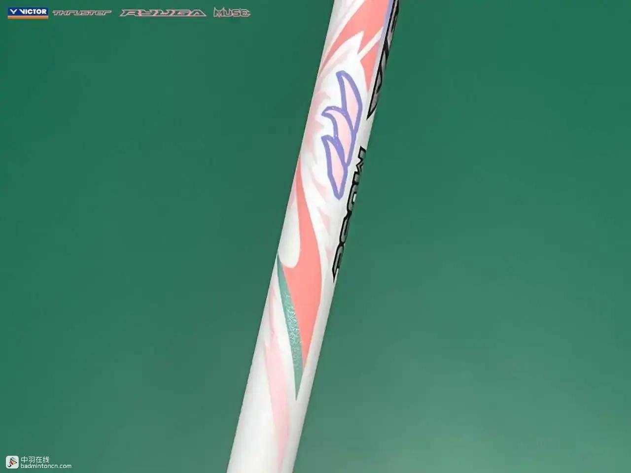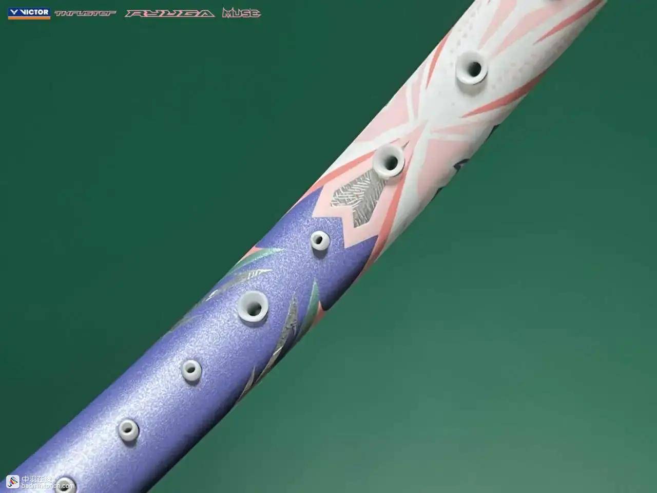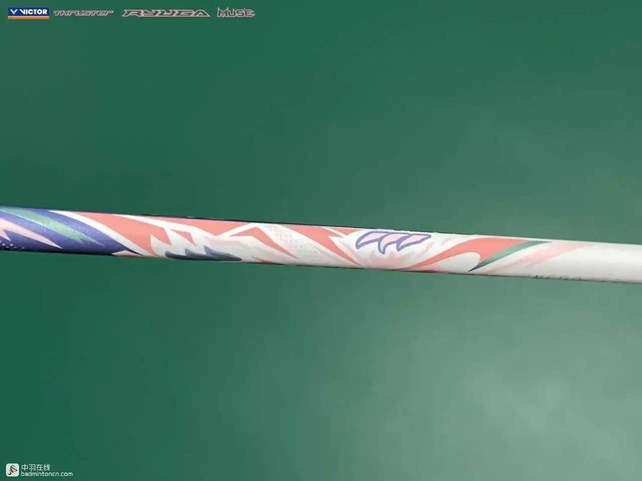 型号名称印于中杆两侧,一侧位置偏上靠近三通,另一侧则位置偏下靠近锥盖,不对称的设计也对应了拍框的左右撞色。“THRUSTER”和“MUSE”分别采用粉色和绿色,中央的“RUYGA”采用了和TK-龙牙上相同的字体以及银色龙纹的表面质感,黑色轮廓让字体更加显眼和有立体感。