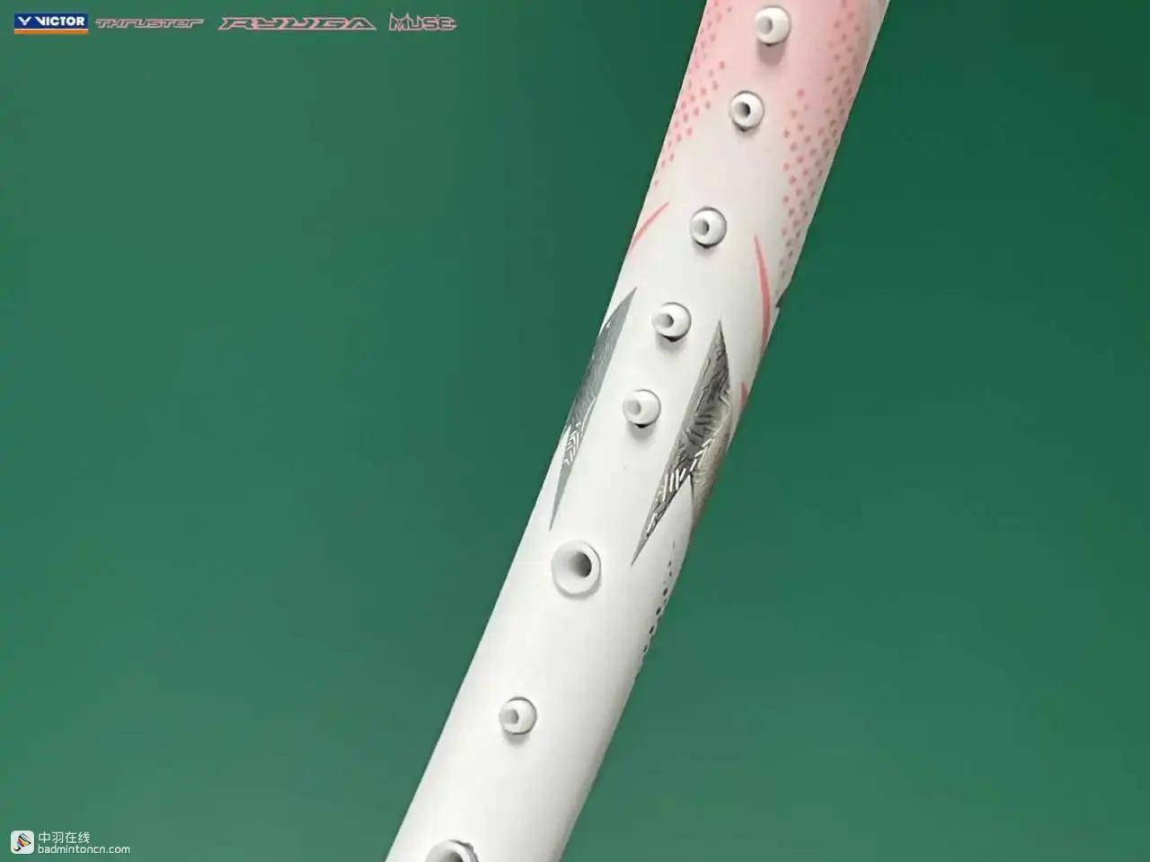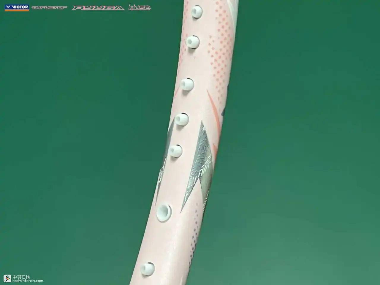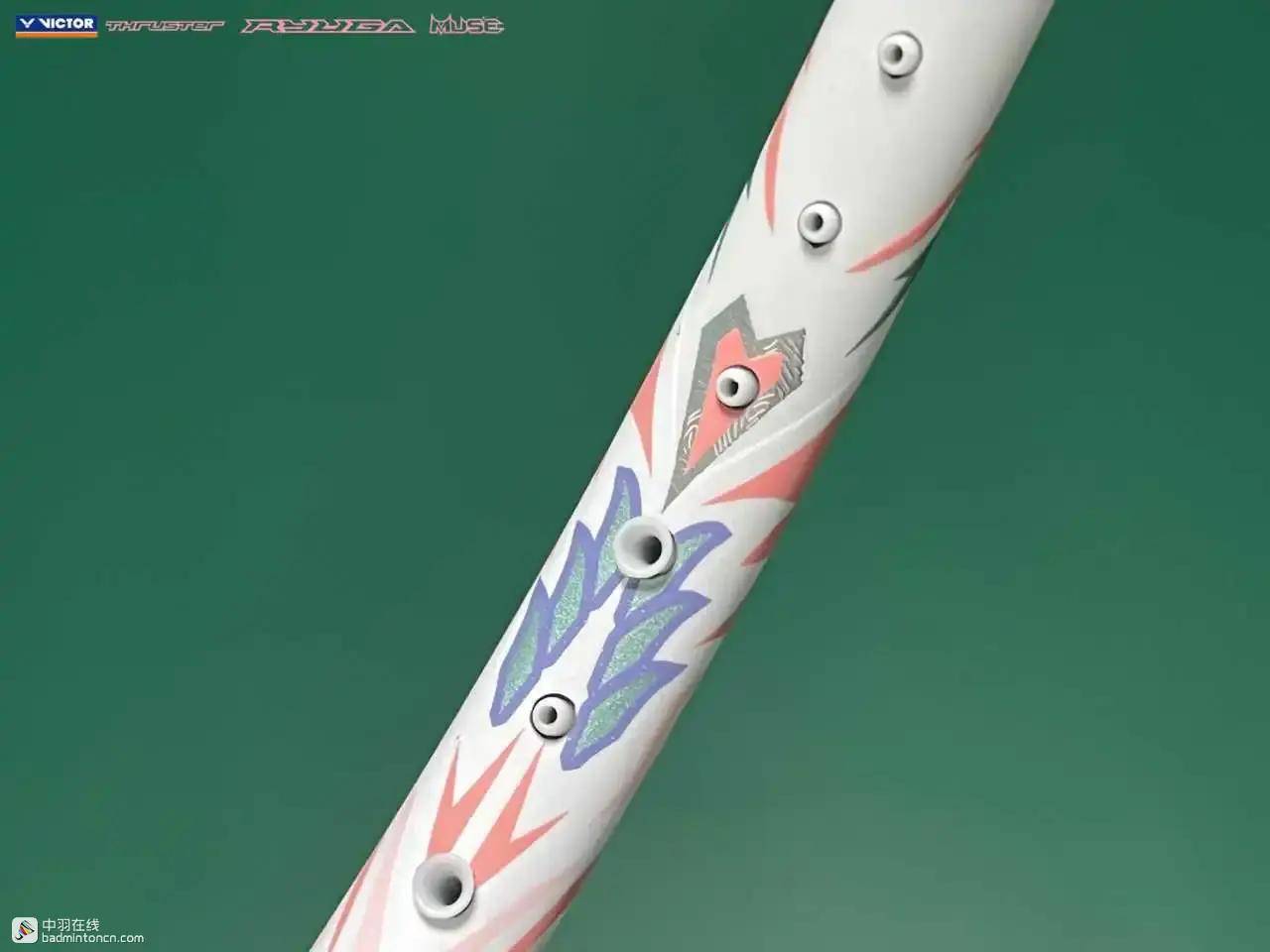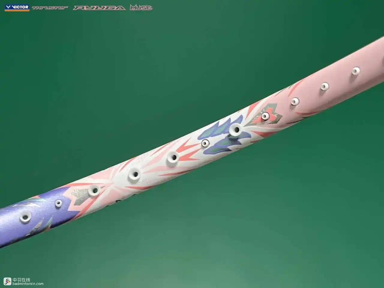 型号名称印于中杆两侧,一侧位置偏上靠近三通,另一侧则位置偏下靠近锥盖,不对称的设计也对应了拍框的左右撞色。“THRUSTER”和“MUSE”分别采用粉色和绿色,中央的“RUYGA”采用了和TK-龙牙上相同的字体以及银色龙纹的表面质感,黑色轮廓让字体更加显眼和有立体感。