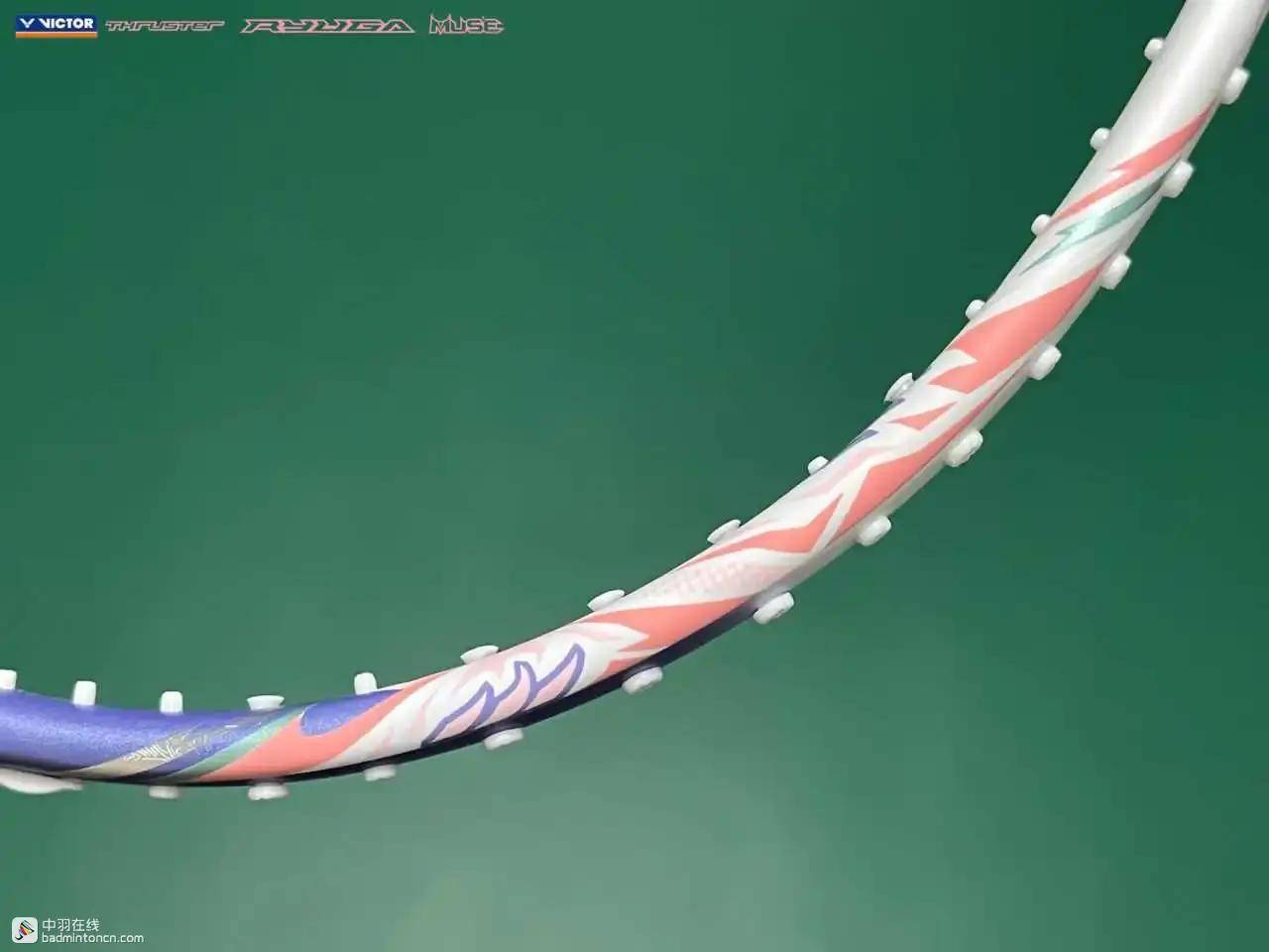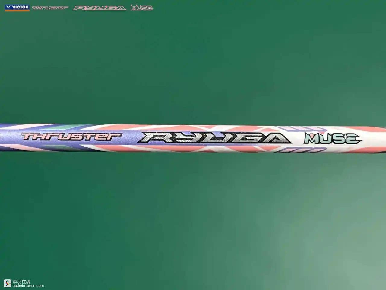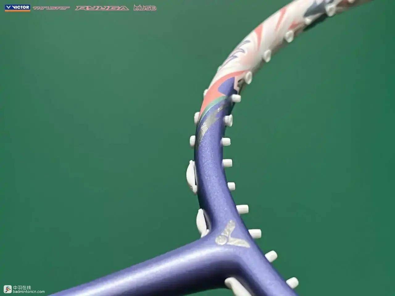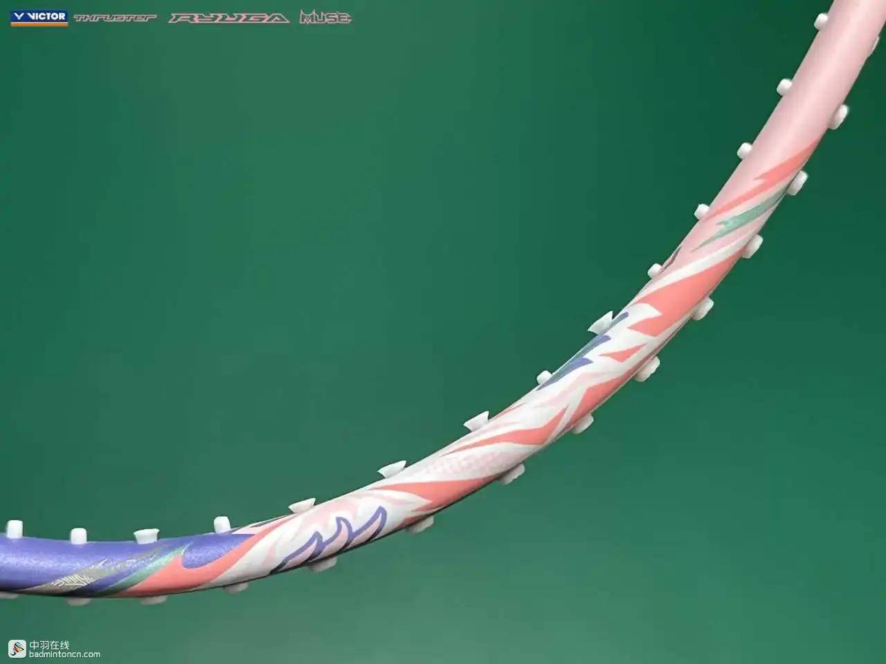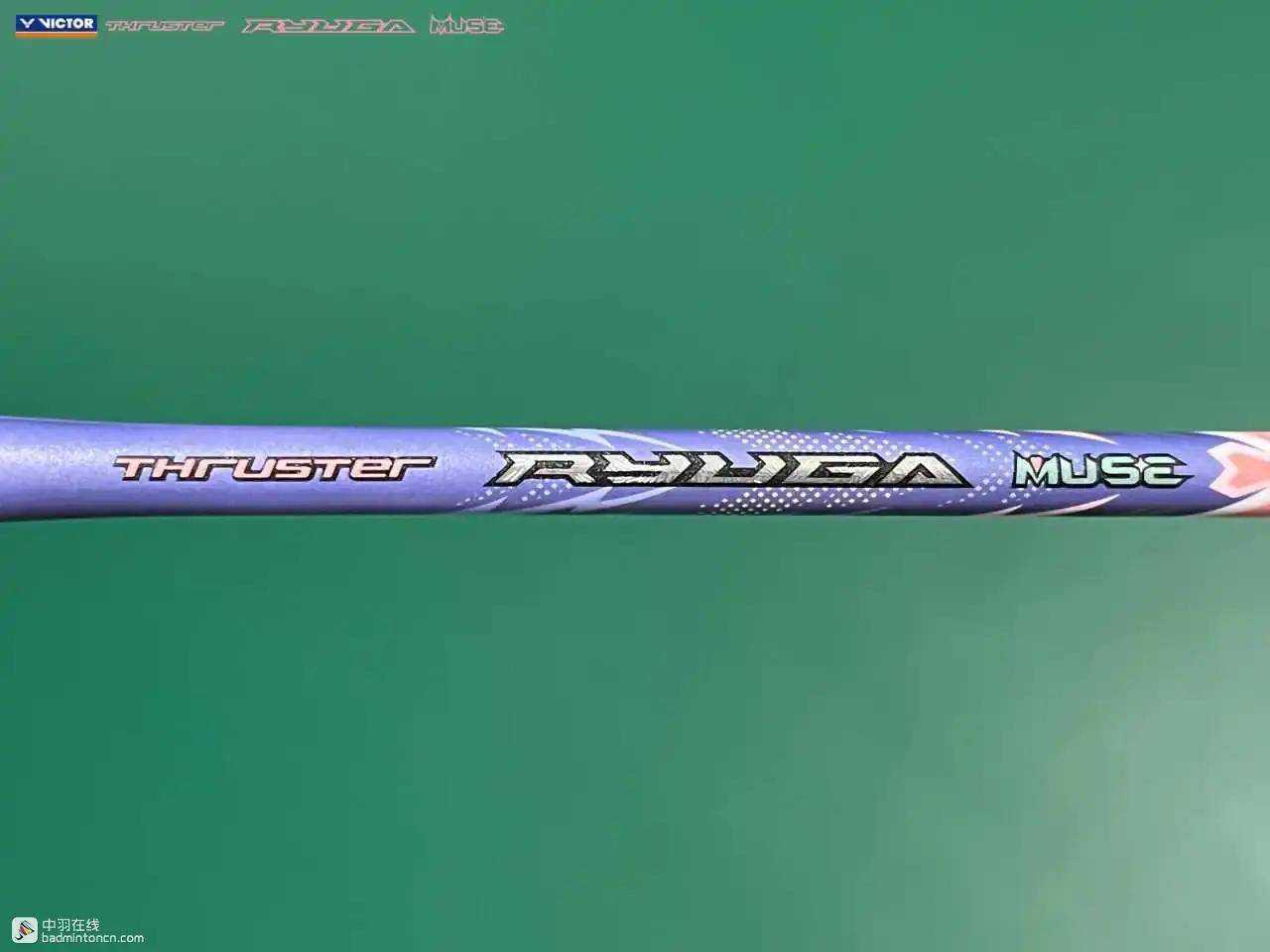型号名称印于中杆两侧,一侧位置偏上靠近三通,另一侧则位置偏下靠近锥盖,不对称的设计也对应了拍框的左右撞色。“THRUSTER”和“MUSE”分别采用粉色和绿色,中央的“RUYGA”采用了和TK-龙牙上相同的字体以及银色龙纹的表面质感,黑色轮廓让字体更加显眼和有立体感。