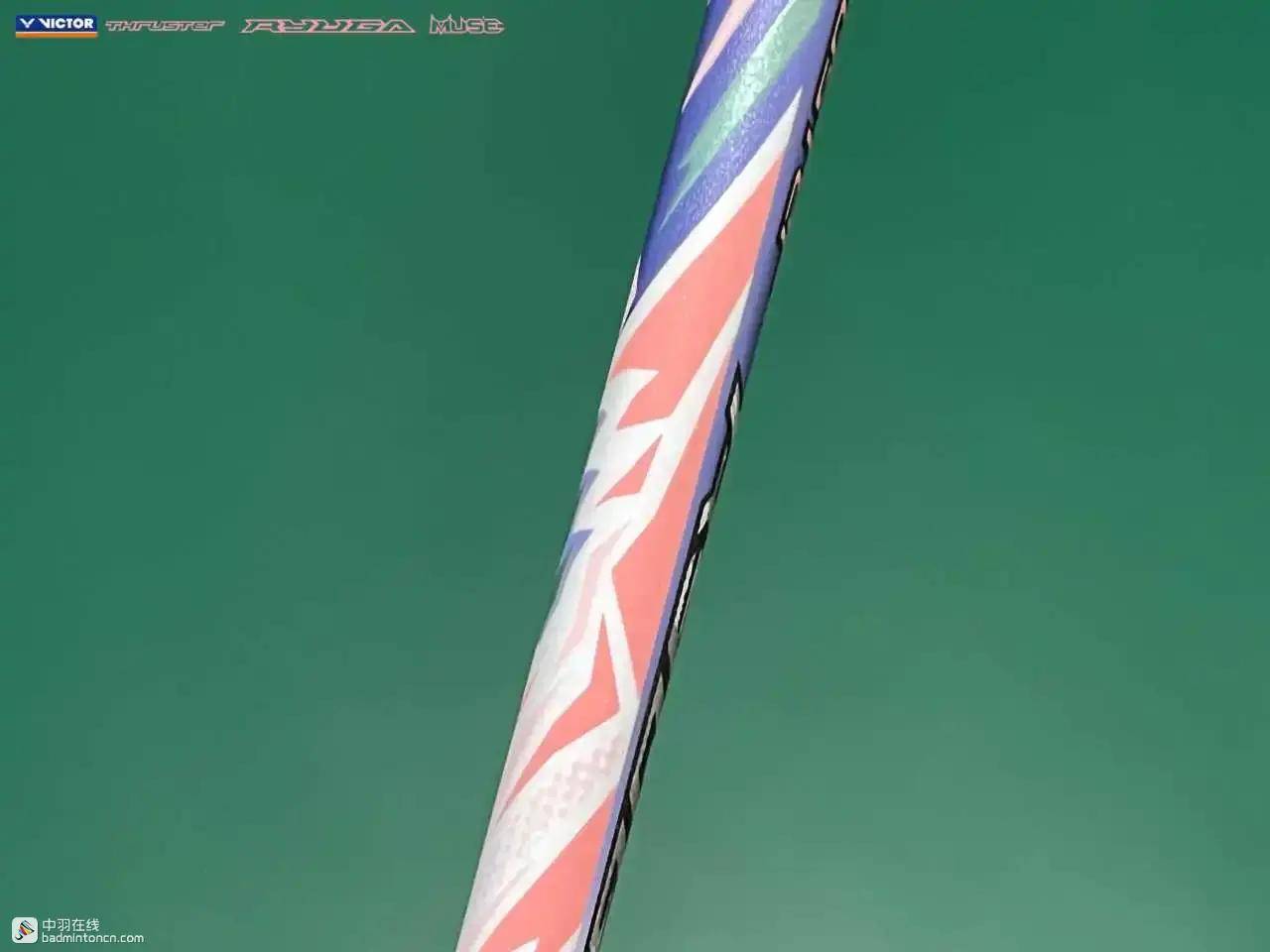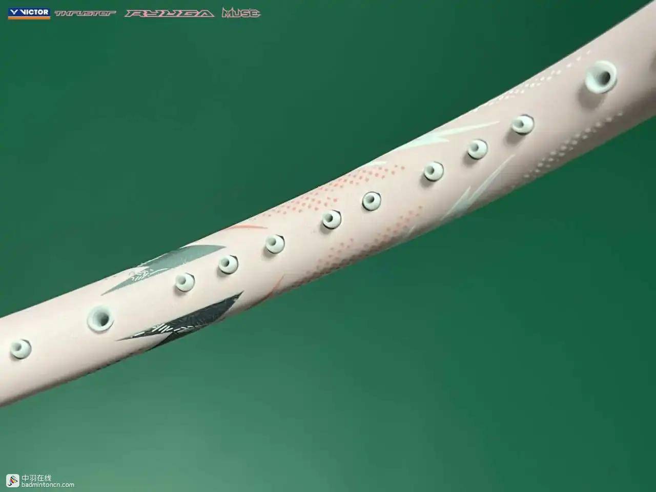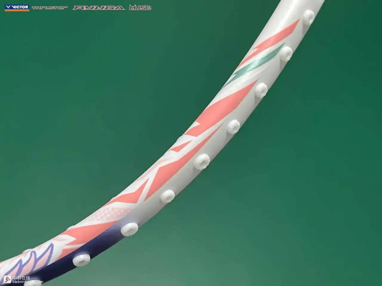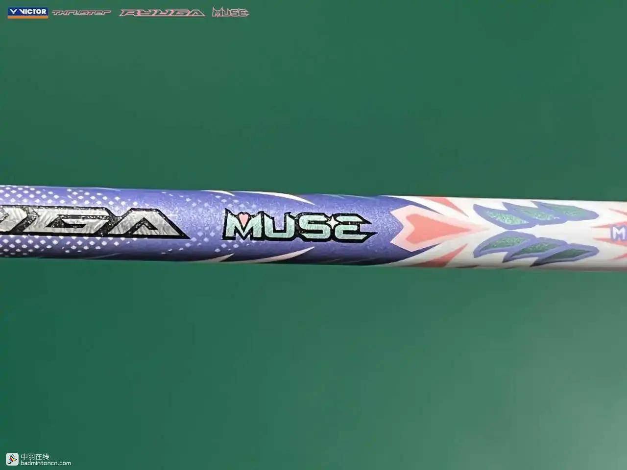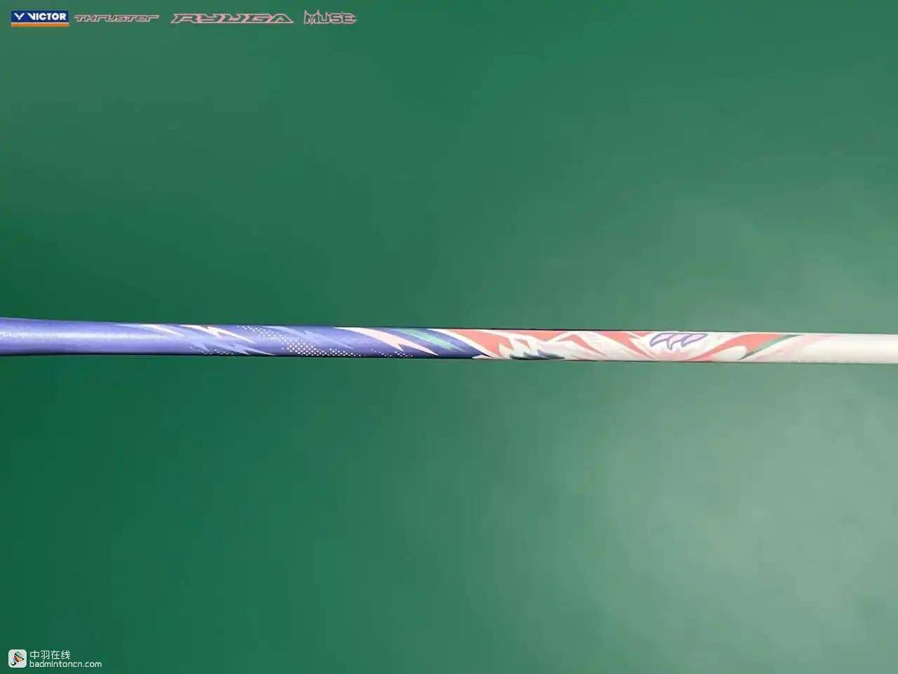 型号名称印于中杆两侧,一侧位置偏上靠近三通,另一侧则位置偏下靠近锥盖,不对称的设计也对应了拍框的左右撞色。“THRUSTER”和“MUSE”分别采用粉色和绿色,中央的“RUYGA”采用了和TK-龙牙上相同的字体以及银色龙纹的表面质感,黑色轮廓让字体更加显眼和有立体感。