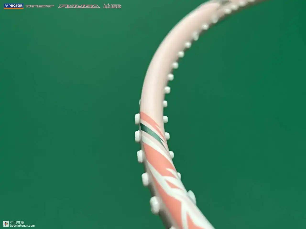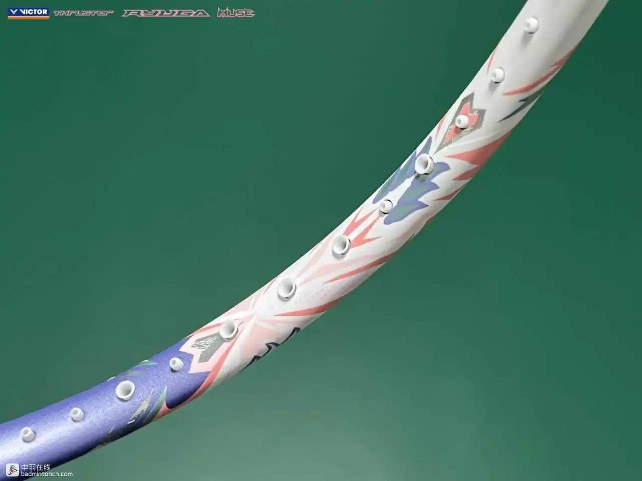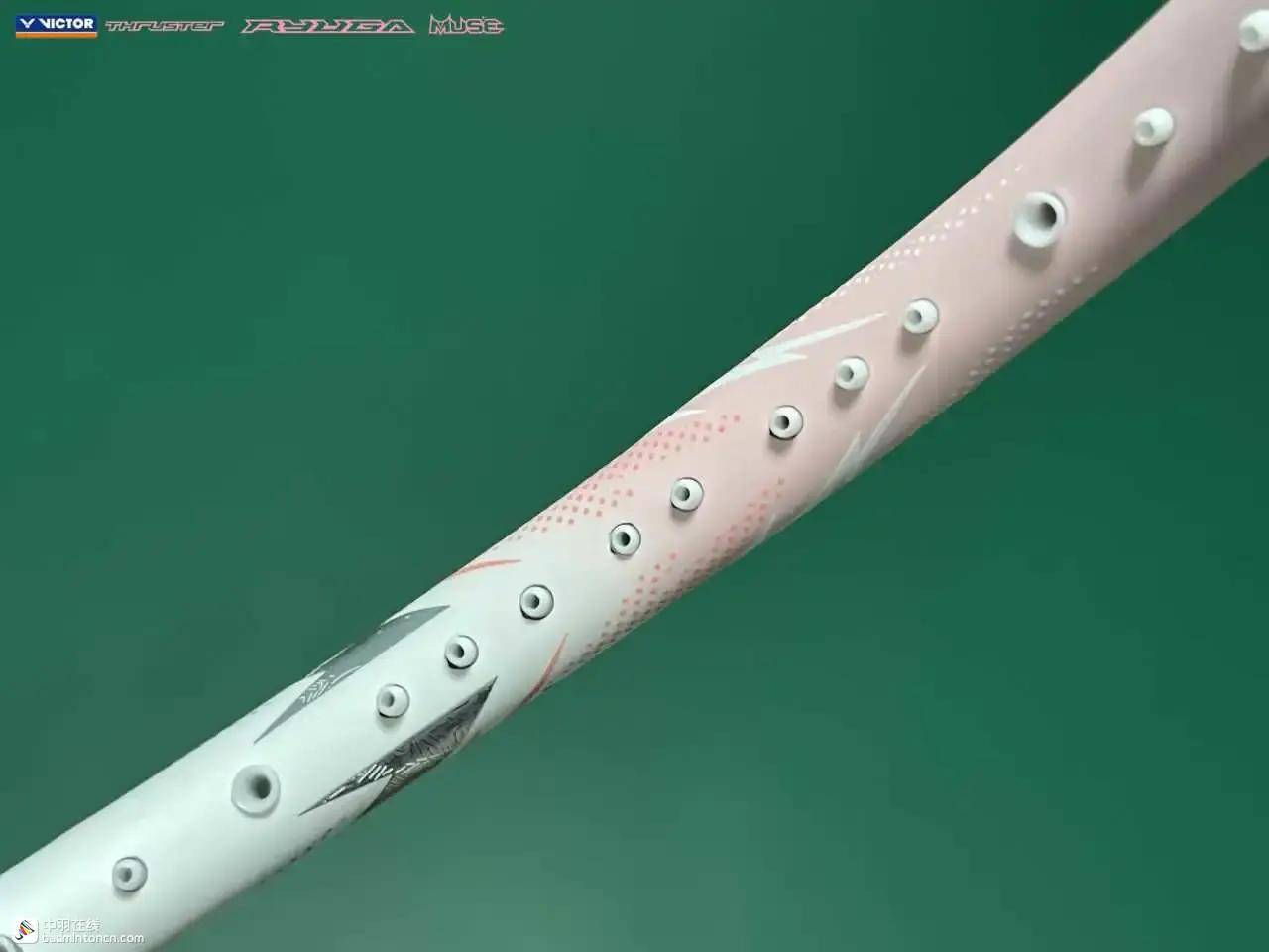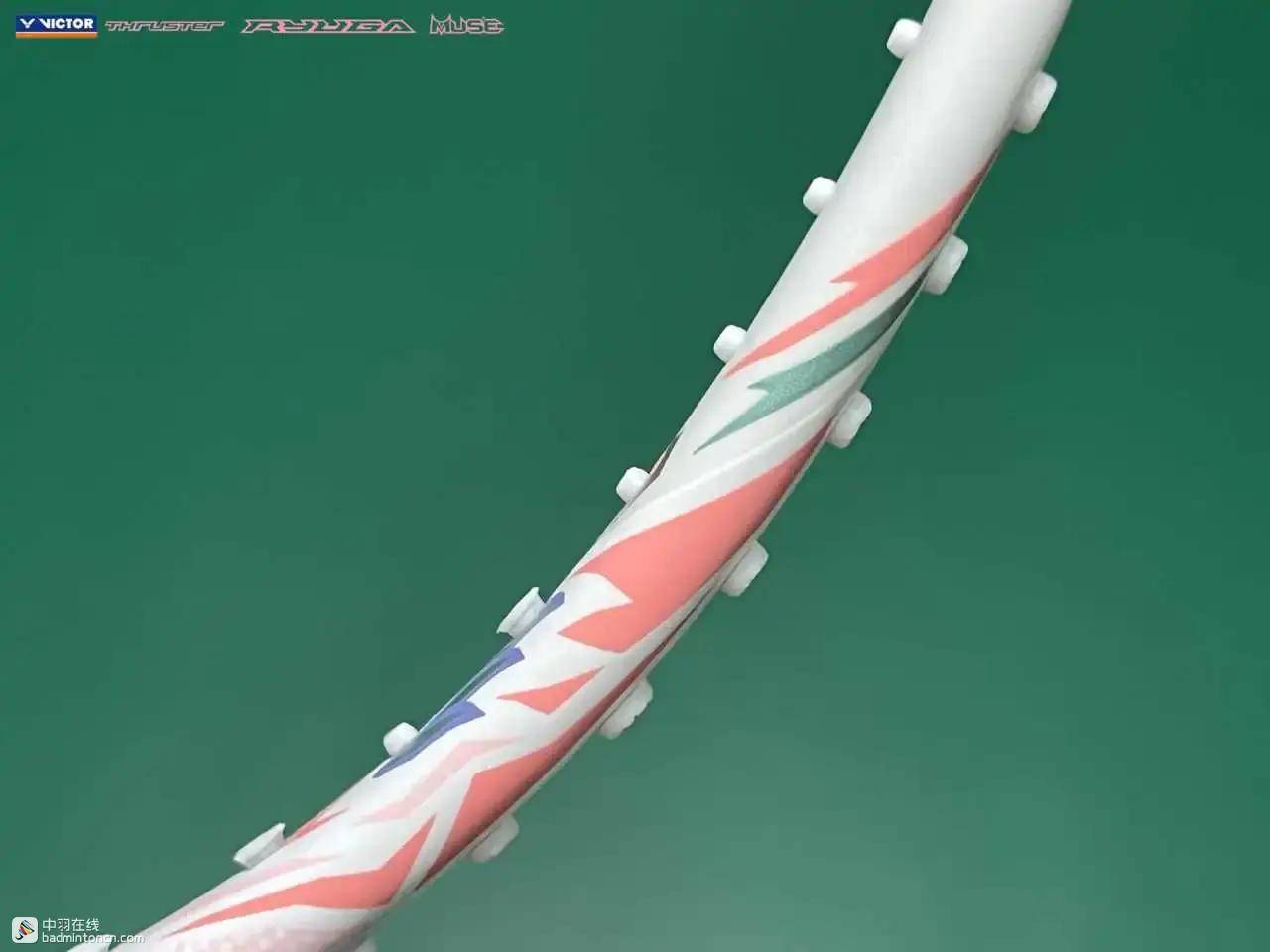 型号名称印于中杆两侧,一侧位置偏上靠近三通,另一侧则位置偏下靠近锥盖,不对称的设计也对应了拍框的左右撞色。“THRUSTER”和“MUSE”分别采用粉色和绿色,中央的“RUYGA”采用了和TK-龙牙上相同的字体以及银色龙纹的表面质感,黑色轮廓让字体更加显眼和有立体感。