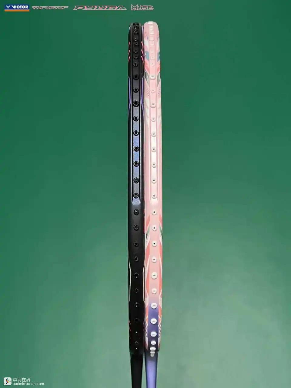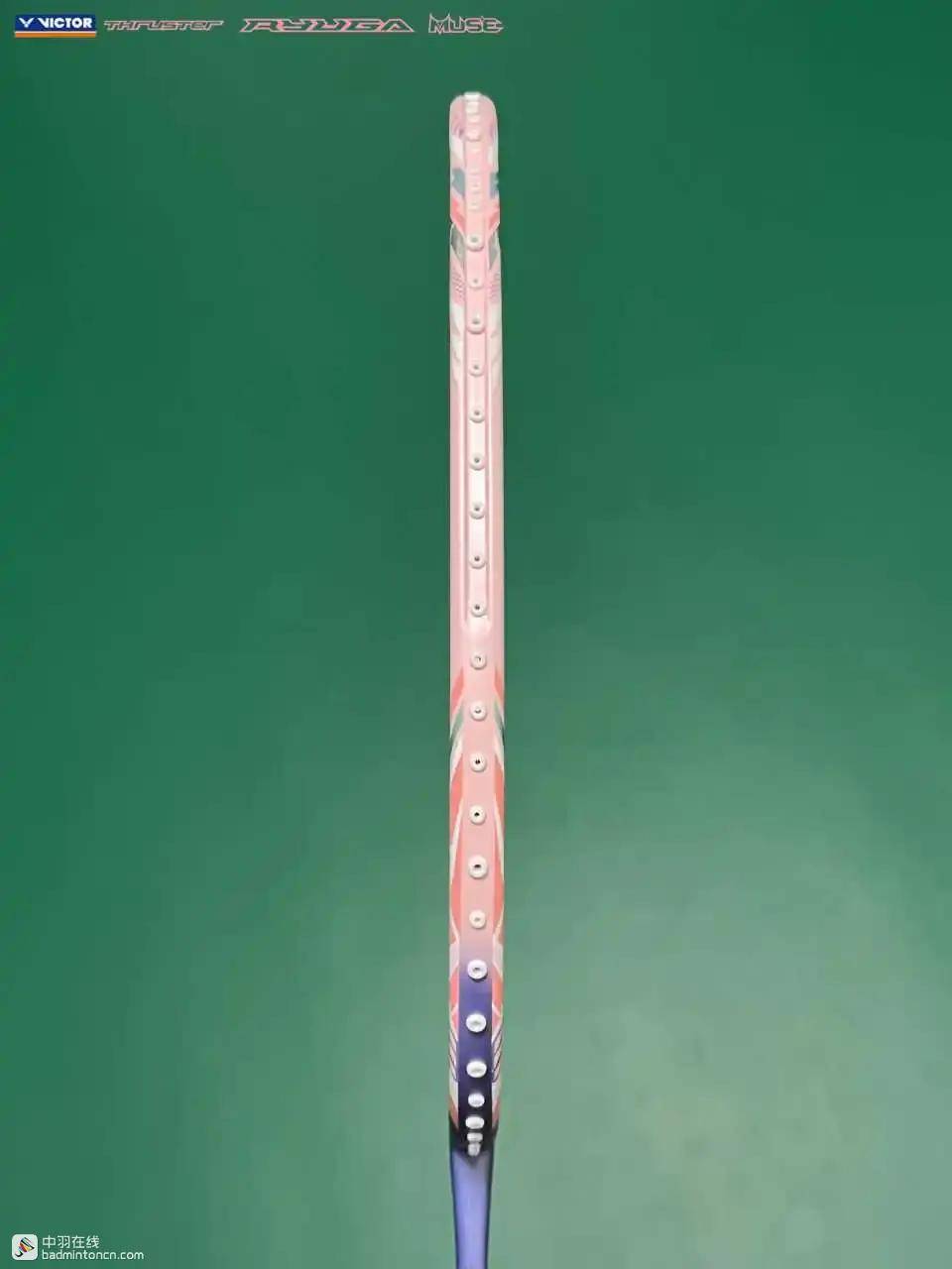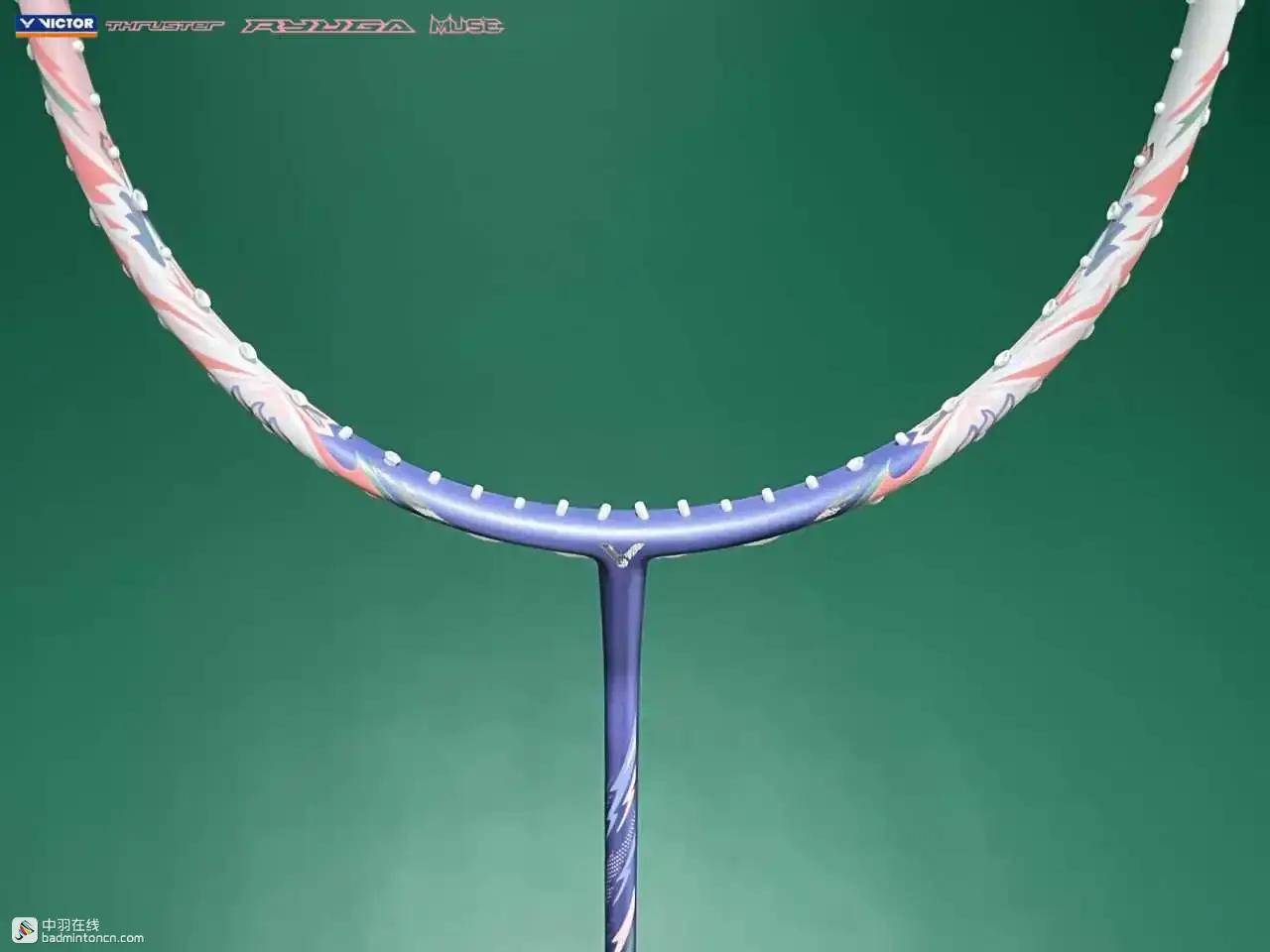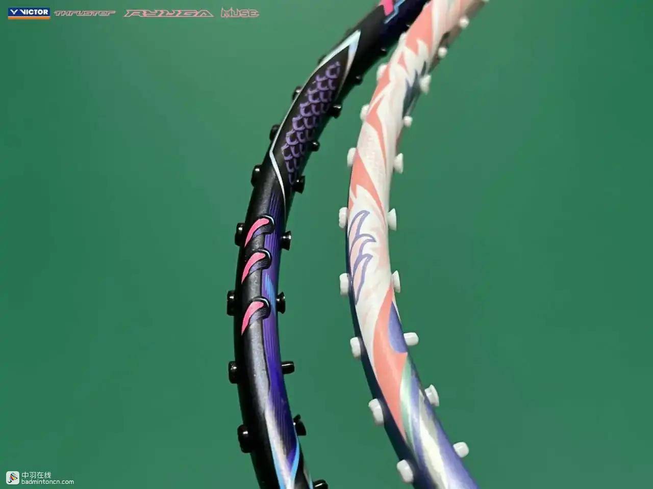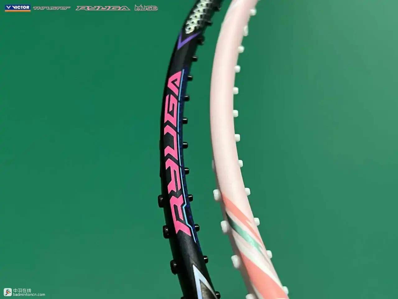 型号名称印于中杆两侧,一侧位置偏上靠近三通,另一侧则位置偏下靠近锥盖,不对称的设计也对应了拍框的左右撞色。“THRUSTER”和“MUSE”分别采用粉色和绿色,中央的“RUYGA”采用了和TK-龙牙上相同的字体以及银色龙纹的表面质感,黑色轮廓让字体更加显眼和有立体感。