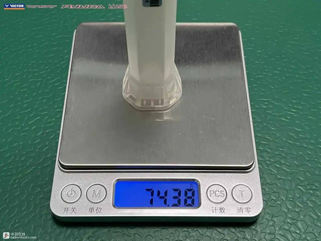 TK-龙牙MUSE只有5U/G6一种规格,由于是运用了悬浮科技手柄的球拍,因此原装状态下是无底胶的,去除热缩膜之后空拍重量约为74.38g,平衡点约为329mm。