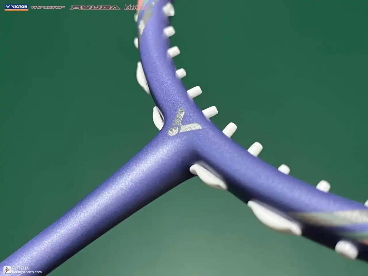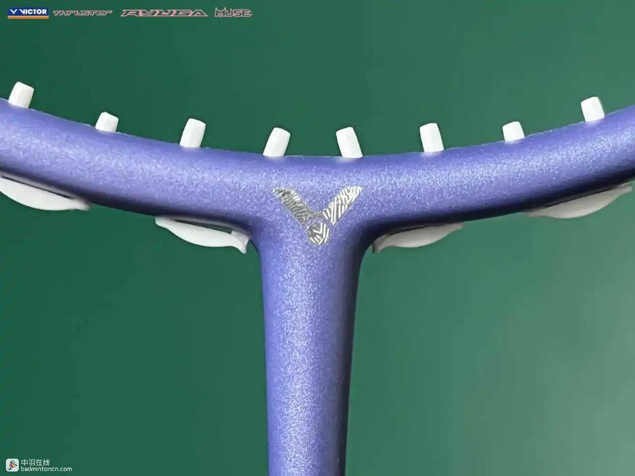 拍框大约7点、5点处以下直至三通处采用紫色,哑光漆水表面做了磨砂质感的处理,显得很有层次感。T头正中央的威克多LOGO采用银色的镭射水标,更加亮眼,且细看之下表面分布着类似指纹般的“龙纹”,细节满满。