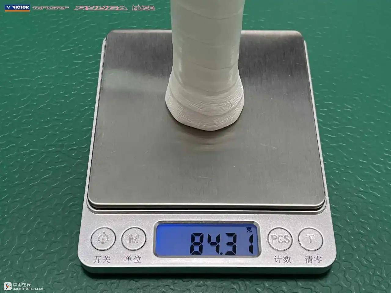 上线(威克多VBS-61线,26磅)和手胶(缓震膜+威克多GR233手胶)后,重约84.31g,平衡点约为314mm。