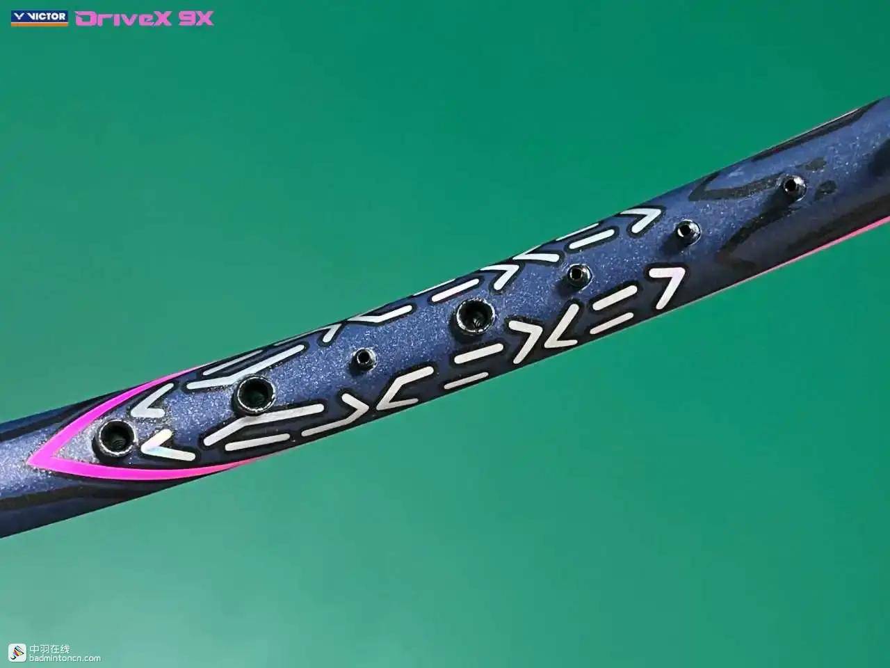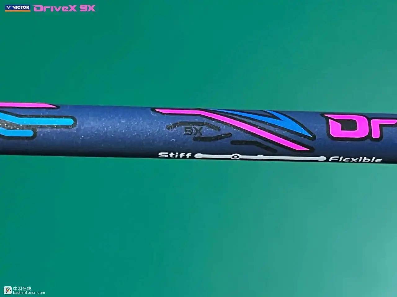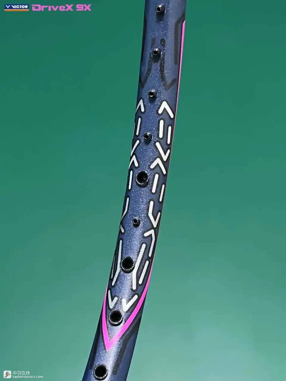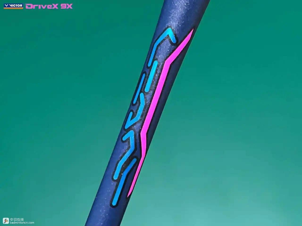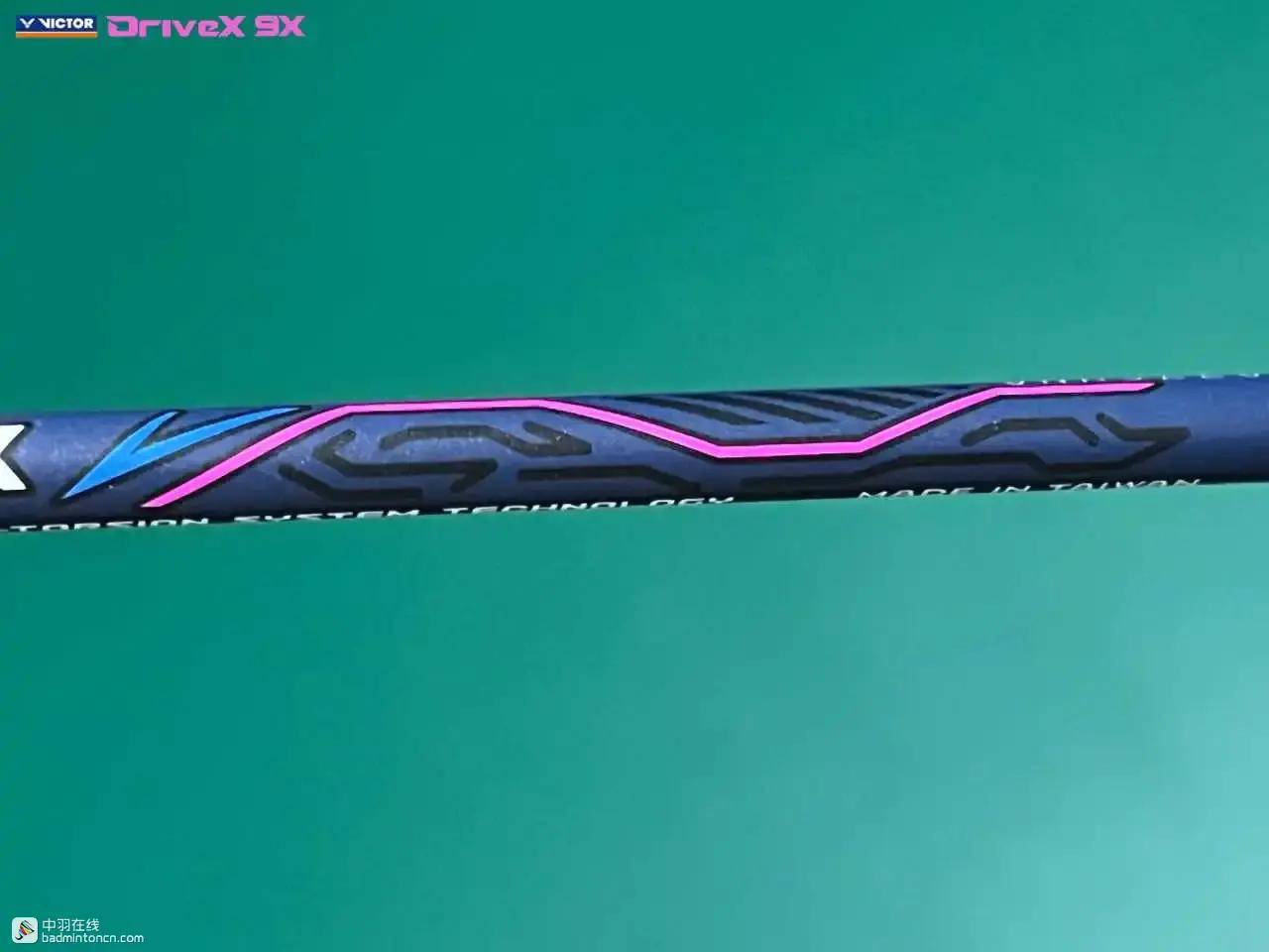 DX-9X的中杆采用两面相同的设计,型号名称“DRIVEX 9X”位于正中央,“DRIVEX”采用粉色而“9X”则为白色,且都有黑色轮廓环绕,硕大的字体颇为显眼。另外,细看之下,在型号名称的左侧还有黑色的“9X”字样,右侧则分布着一些黑色的纹路。