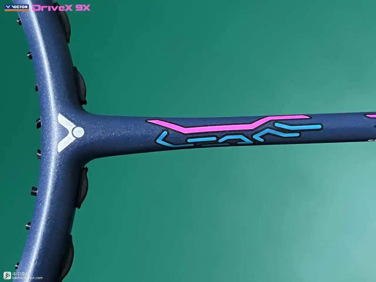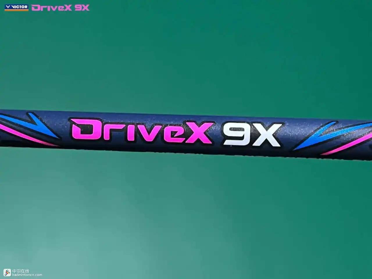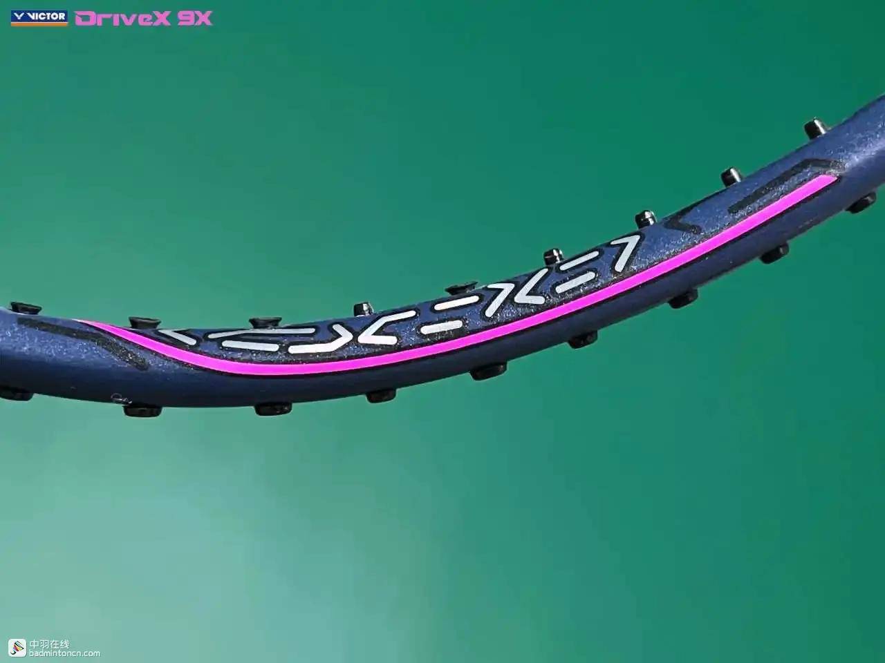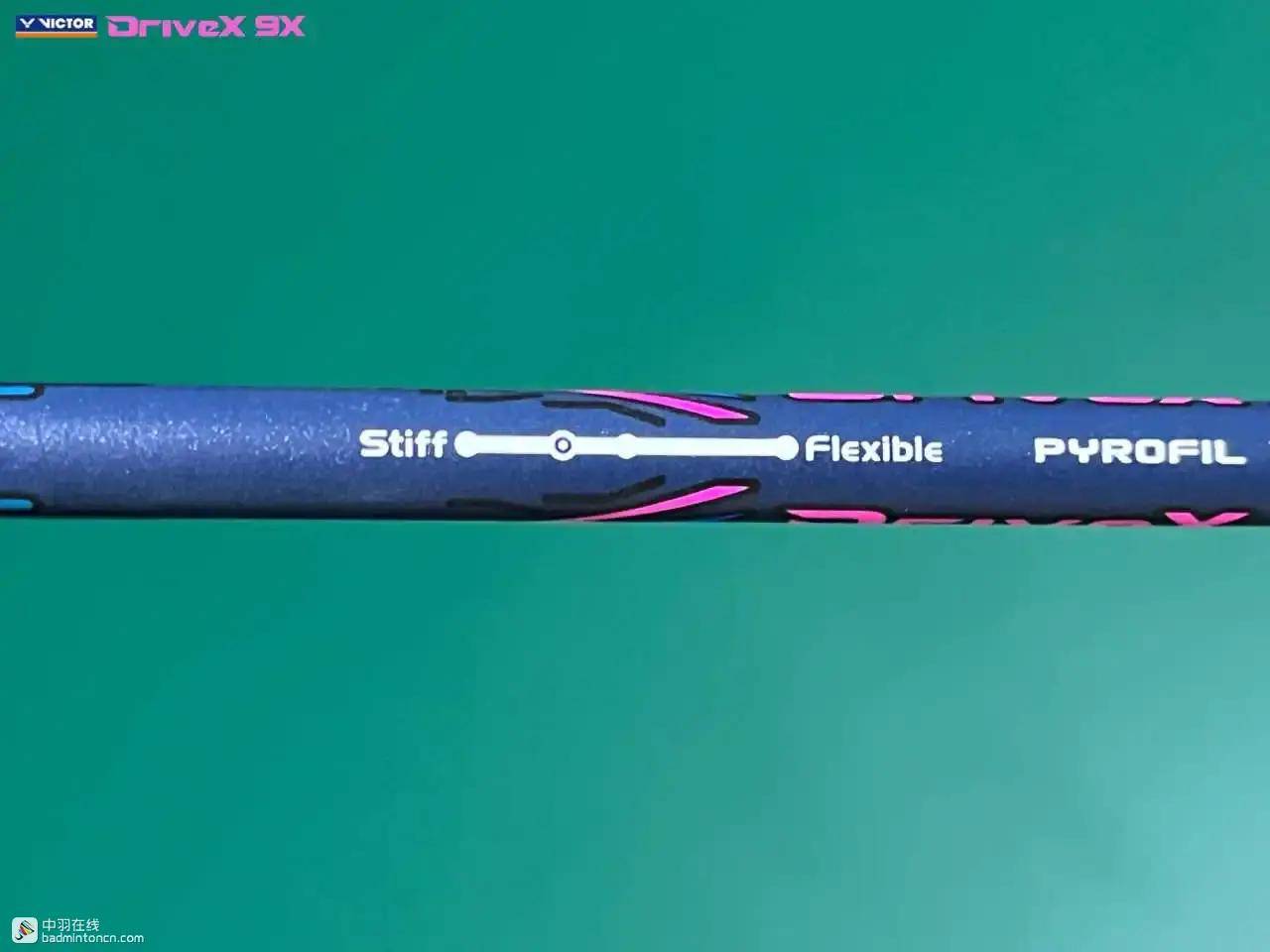 DX-9X的中杆采用两面相同的设计,型号名称“DRIVEX 9X”位于正中央,“DRIVEX”采用粉色而“9X”则为白色,且都有黑色轮廓环绕,硕大的字体颇为显眼。另外,细看之下,在型号名称的左侧还有黑色的“9X”字样,右侧则分布着一些黑色的纹路。