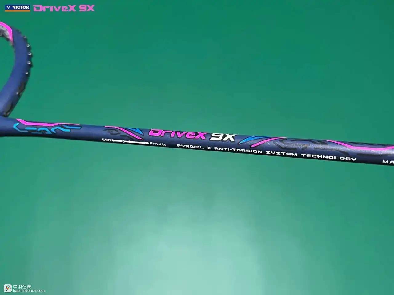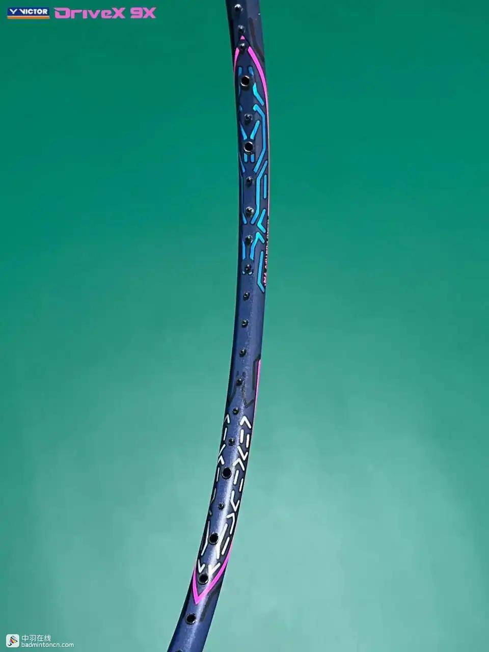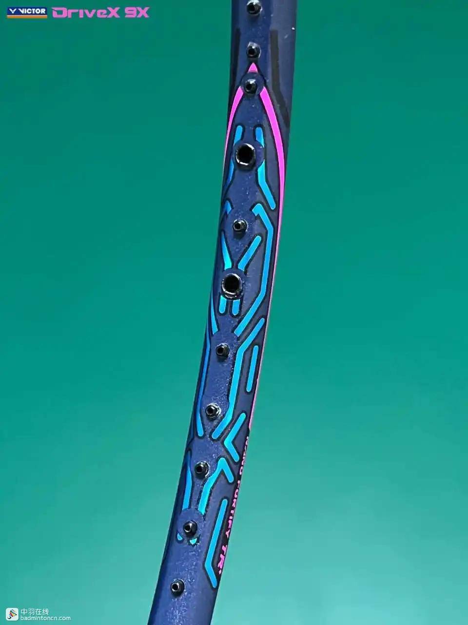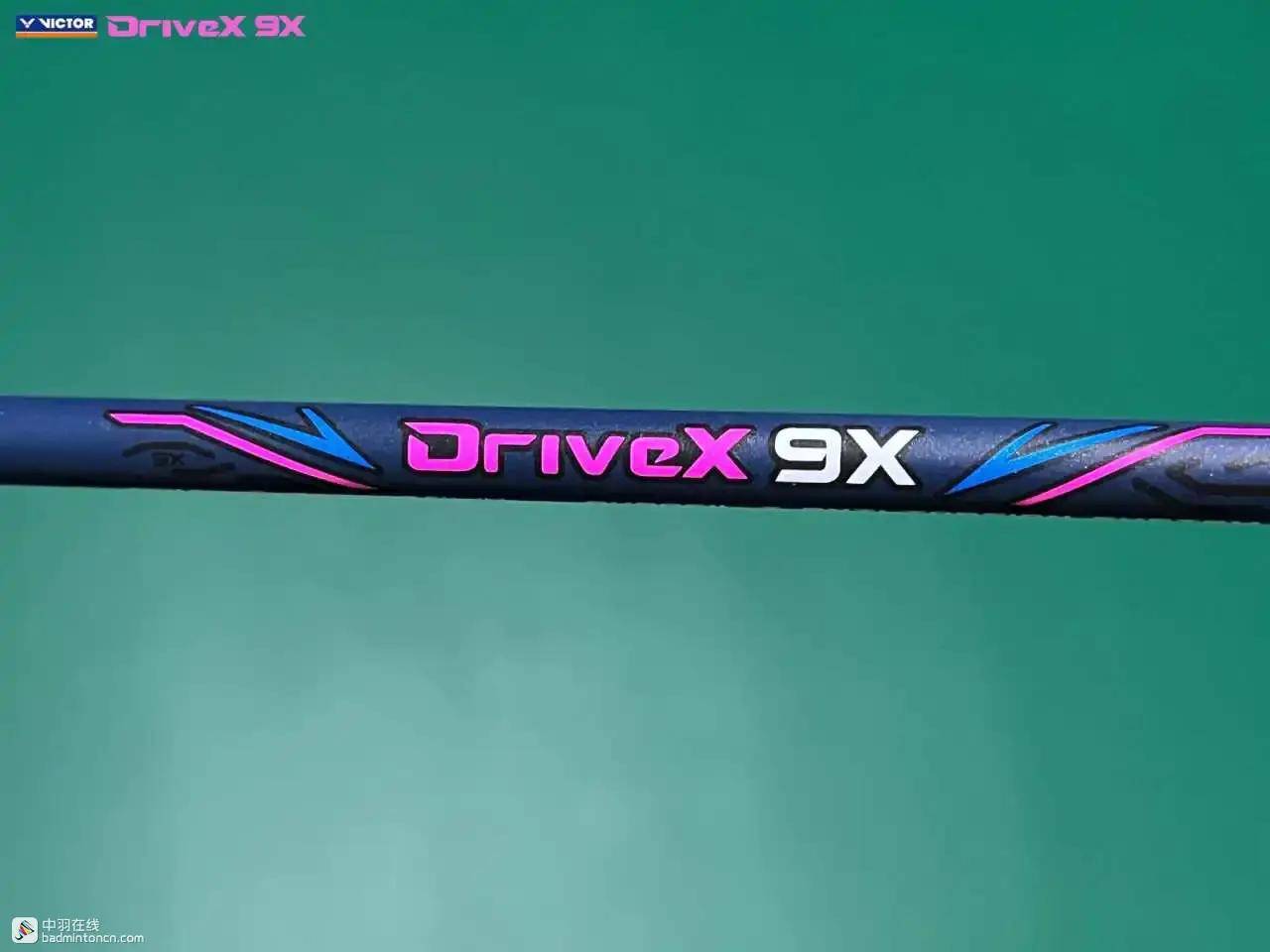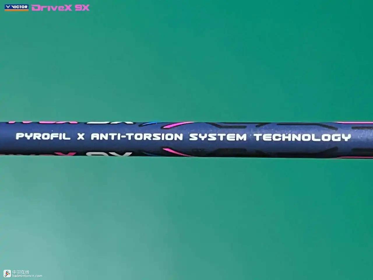 DX-9X的中杆采用两面相同的设计,型号名称“DRIVEX 9X”位于正中央,“DRIVEX”采用粉色而“9X”则为白色,且都有黑色轮廓环绕,硕大的字体颇为显眼。另外,细看之下,在型号名称的左侧还有黑色的“9X”字样,右侧则分布着一些黑色的纹路。