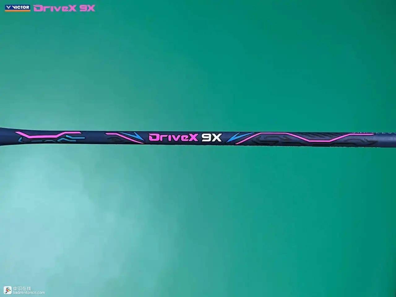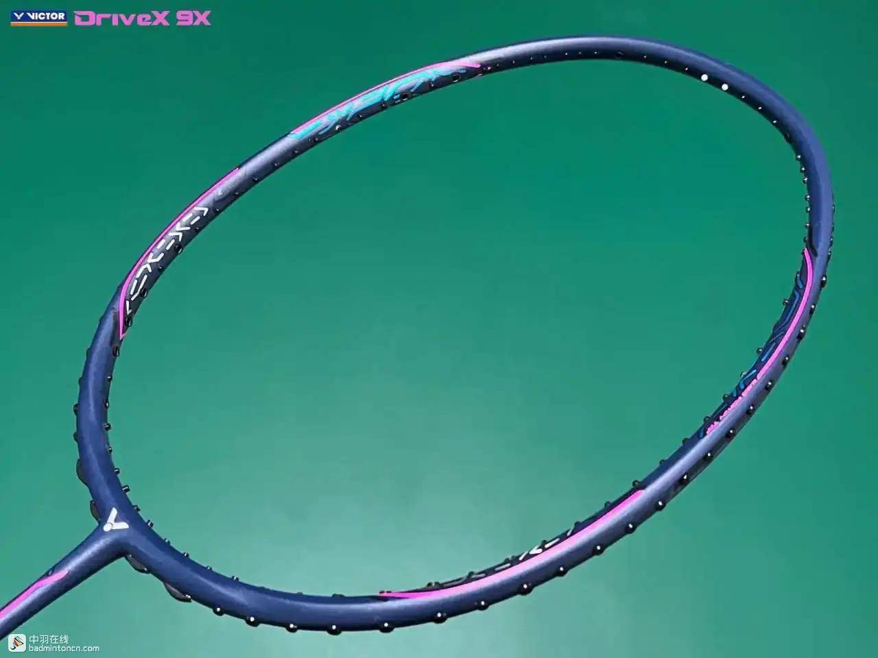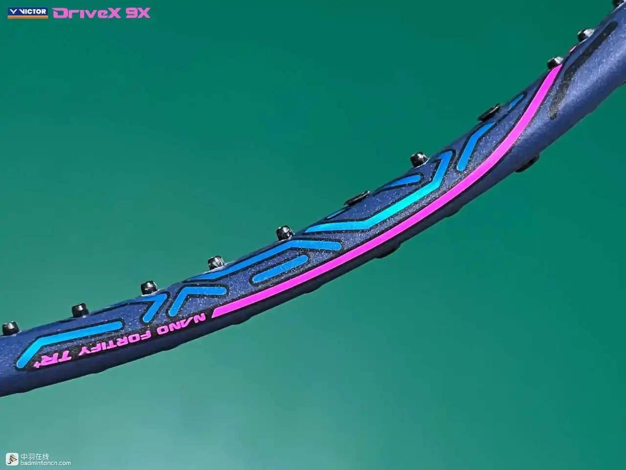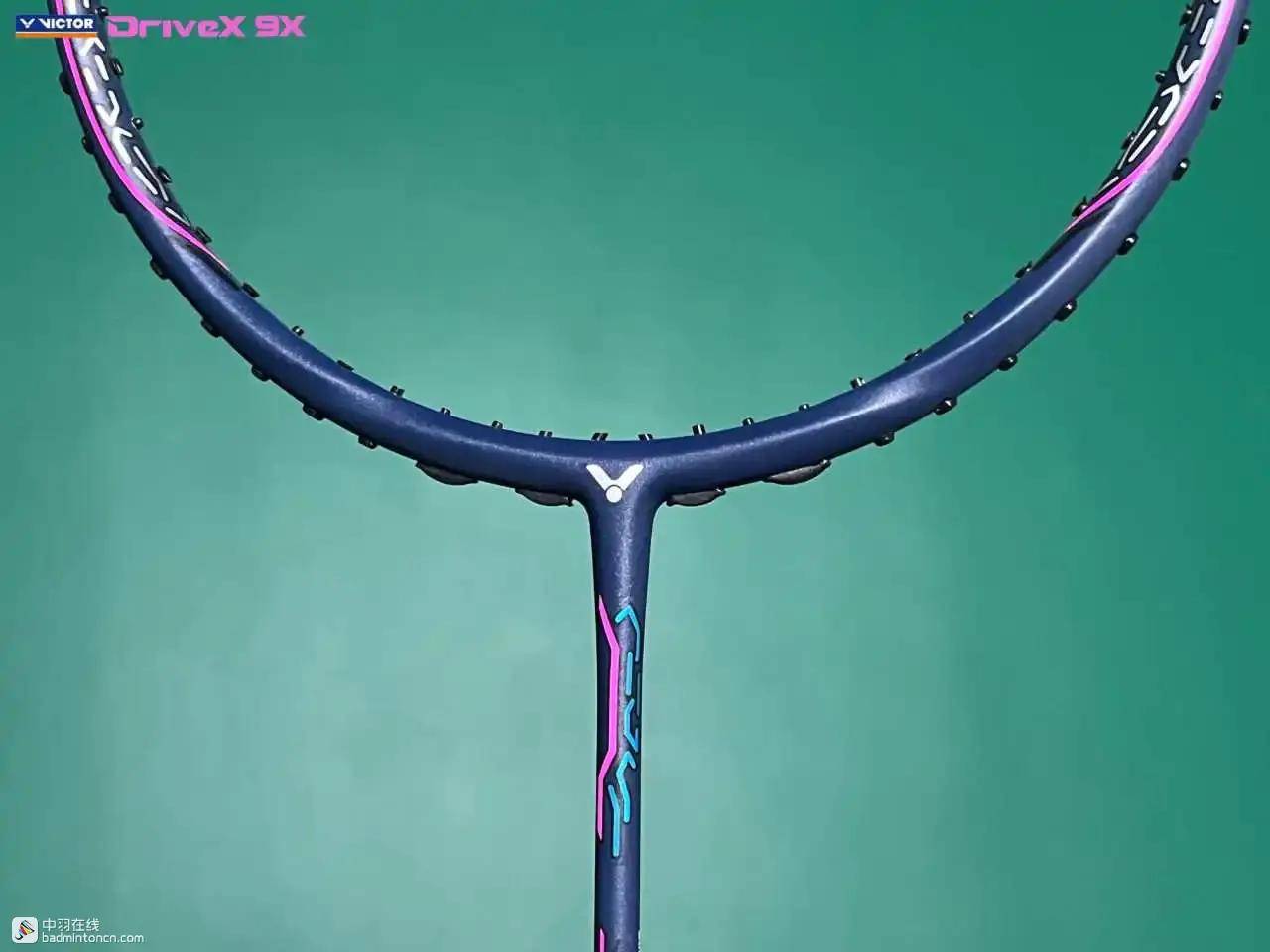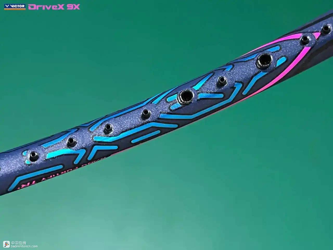 DX-9X的中杆采用两面相同的设计,型号名称“DRIVEX 9X”位于正中央,“DRIVEX”采用粉色而“9X”则为白色,且都有黑色轮廓环绕,硕大的字体颇为显眼。另外,细看之下,在型号名称的左侧还有黑色的“9X”字样,右侧则分布着一些黑色的纹路。