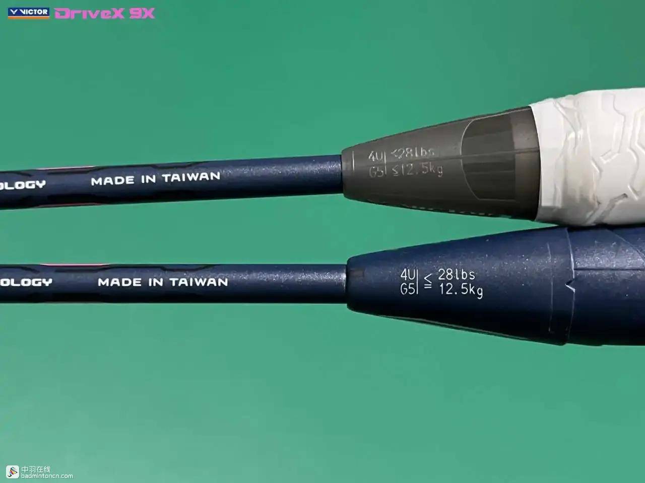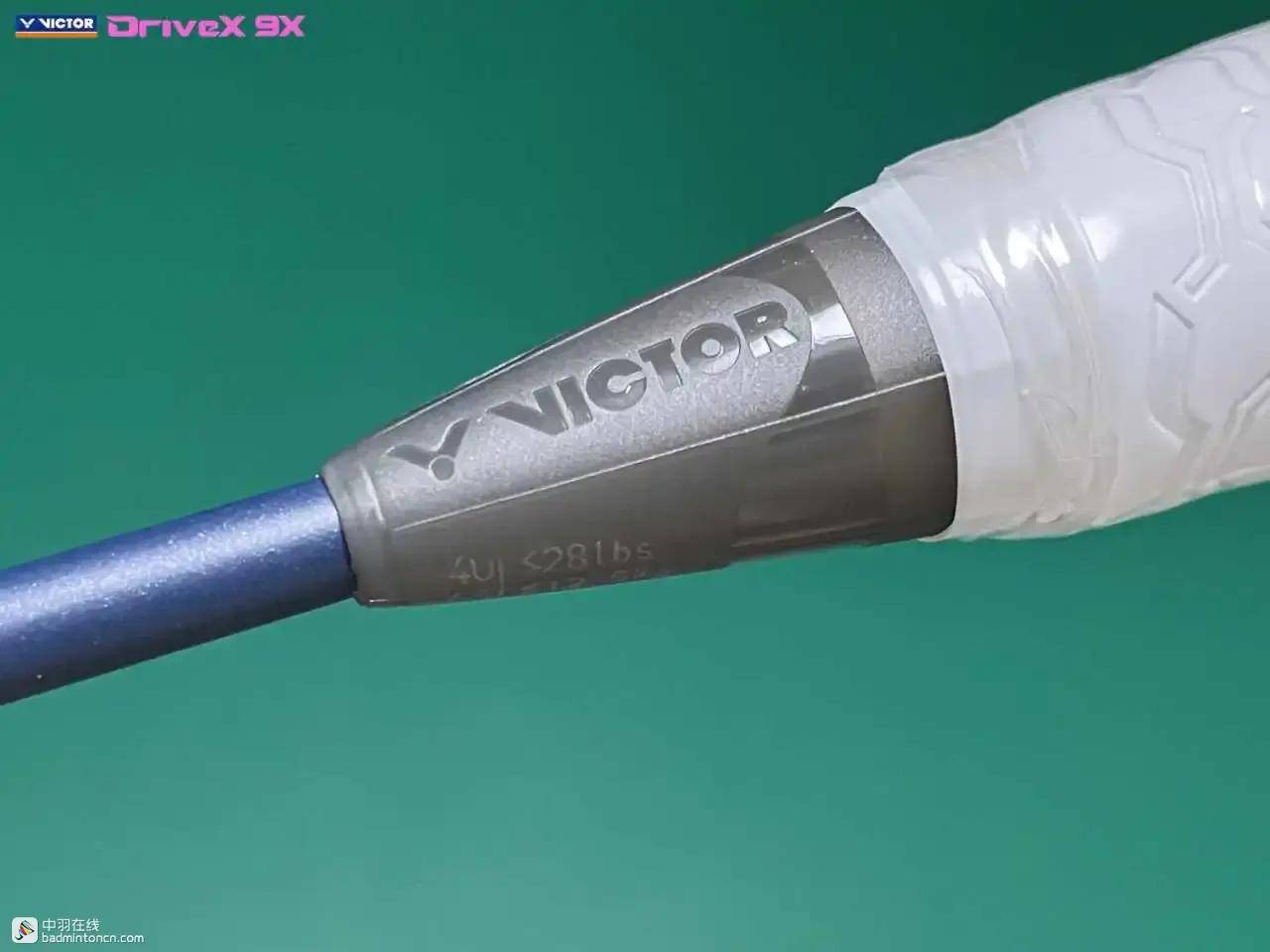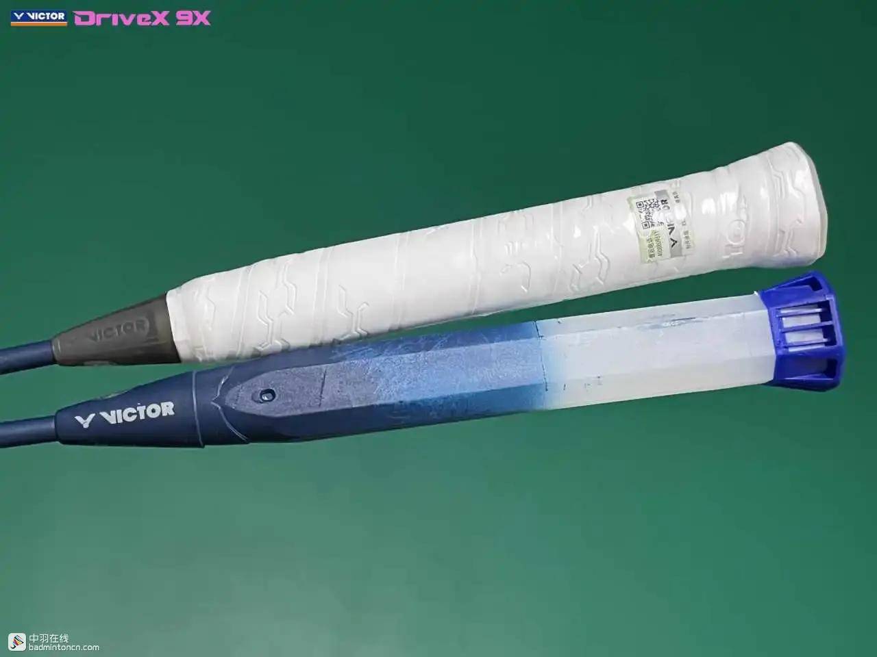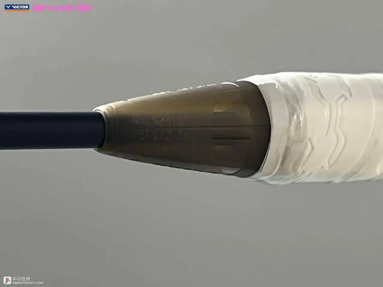 最后值得一提的是DX-9X的手柄。DX-9X开创威克多球拍悬浮科技手柄运用之先河,后来威克多的悬浮科技手柄球拍都开始采用透明锥盖和底盖的设计,因此DX-9X根据生产时间的不同,这两个部分也有所区别,早期批次采用的是藏青色的非透明锥盖,颜色和中杆相同,其上有悬浮科技手柄名称的标识,底盖则是传统的蓝底白LOGO;而后期生产的DX-9X则全部更换为了黑色的半透明锥盖以及透明底盖。