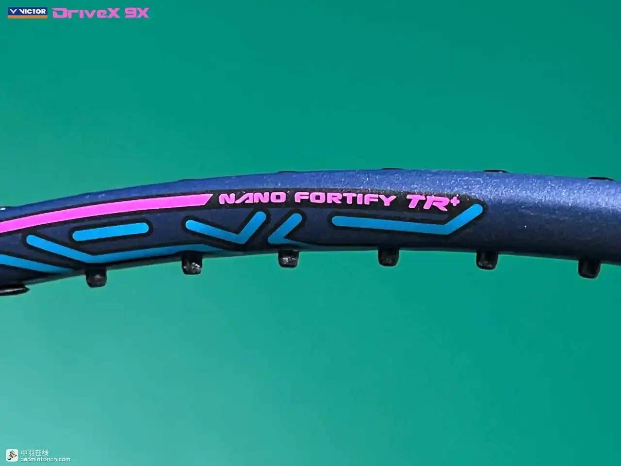 此外,除了上文提到的“HARD CORED TECHNOLOGY”强芯填充技术以外,DX-9X的拍框还运用了弹力盾和TR增韧纳米碳管科技两项科技。弹力盾(REBOUND SHIELD)是指在拍框叠层设计中导入高强韧玻璃纤维,以获得更出色的弹性;TR增韧纳米碳管科技(NANO FORTIFY TR+)则是通过日本东丽公司原厂材料的全面导入,使得拍框的强韧度、耐冲击性、弹性都得到大幅增强。