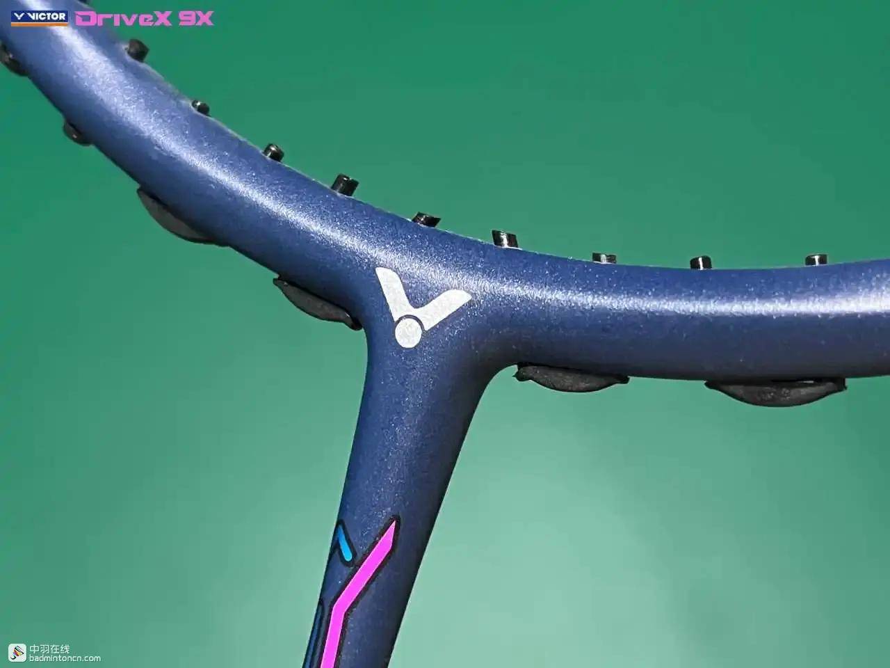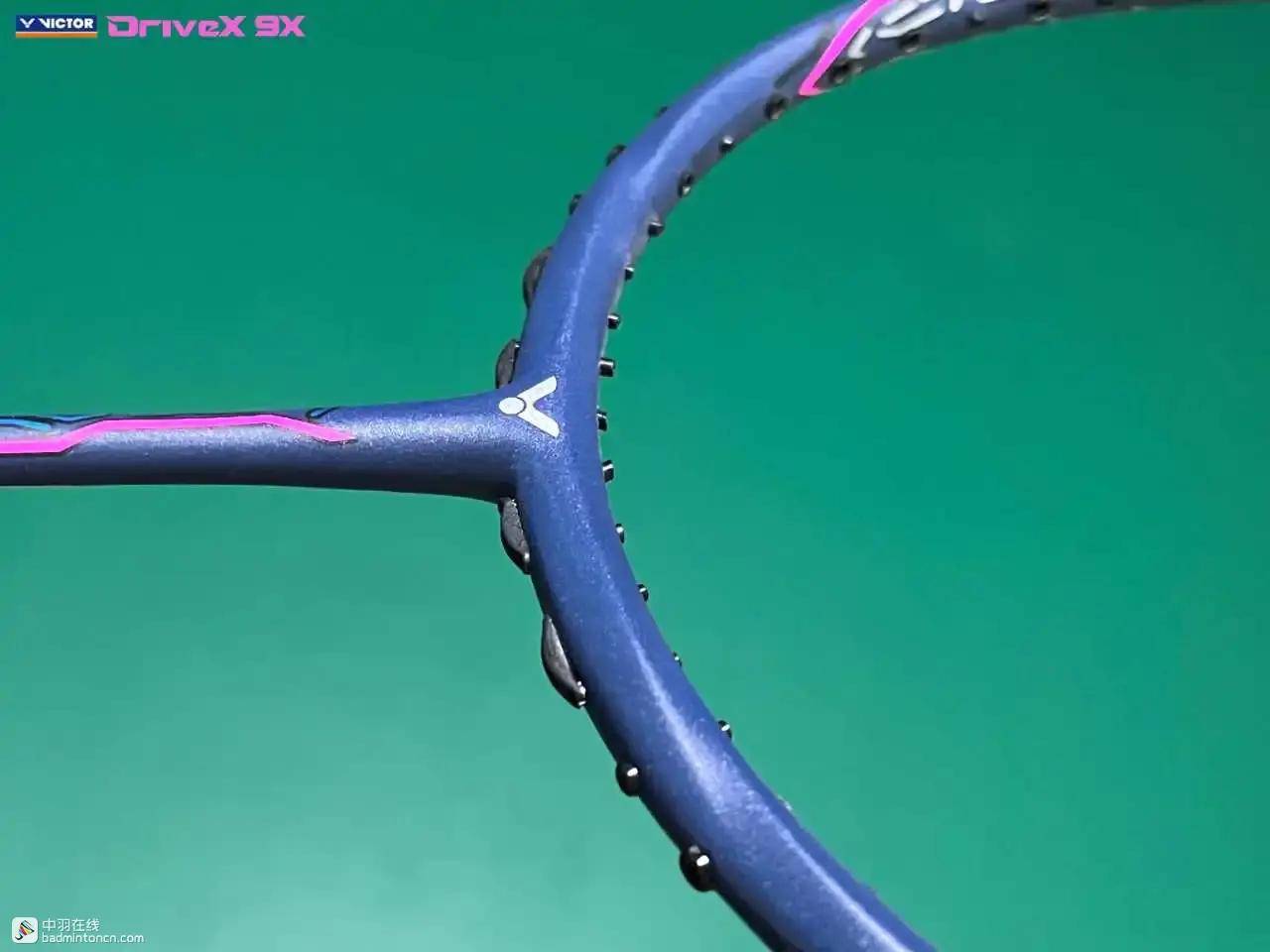 DX-9X的拍框采用传统的对称式设计,这也是驭系列的一贯风格,藏青底色由拍头一直延伸到三通处,简洁而纯粹。藏青色漆水为哑光表面,在光照下仔细观察可以看到细小的星星点点般的反光,有种磨砂质感,低调而深邃。