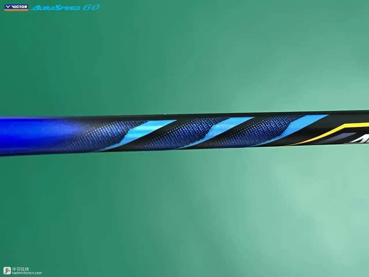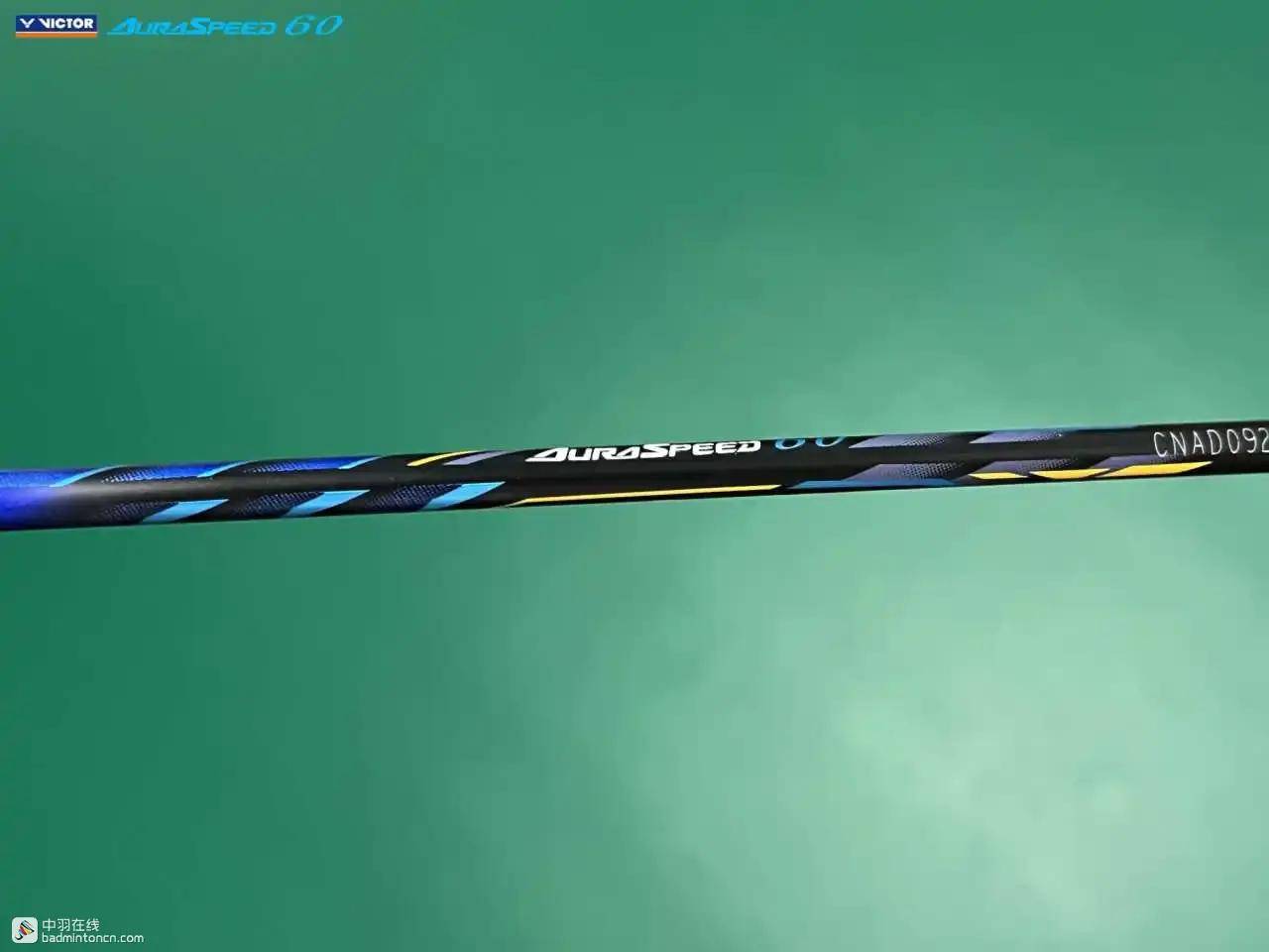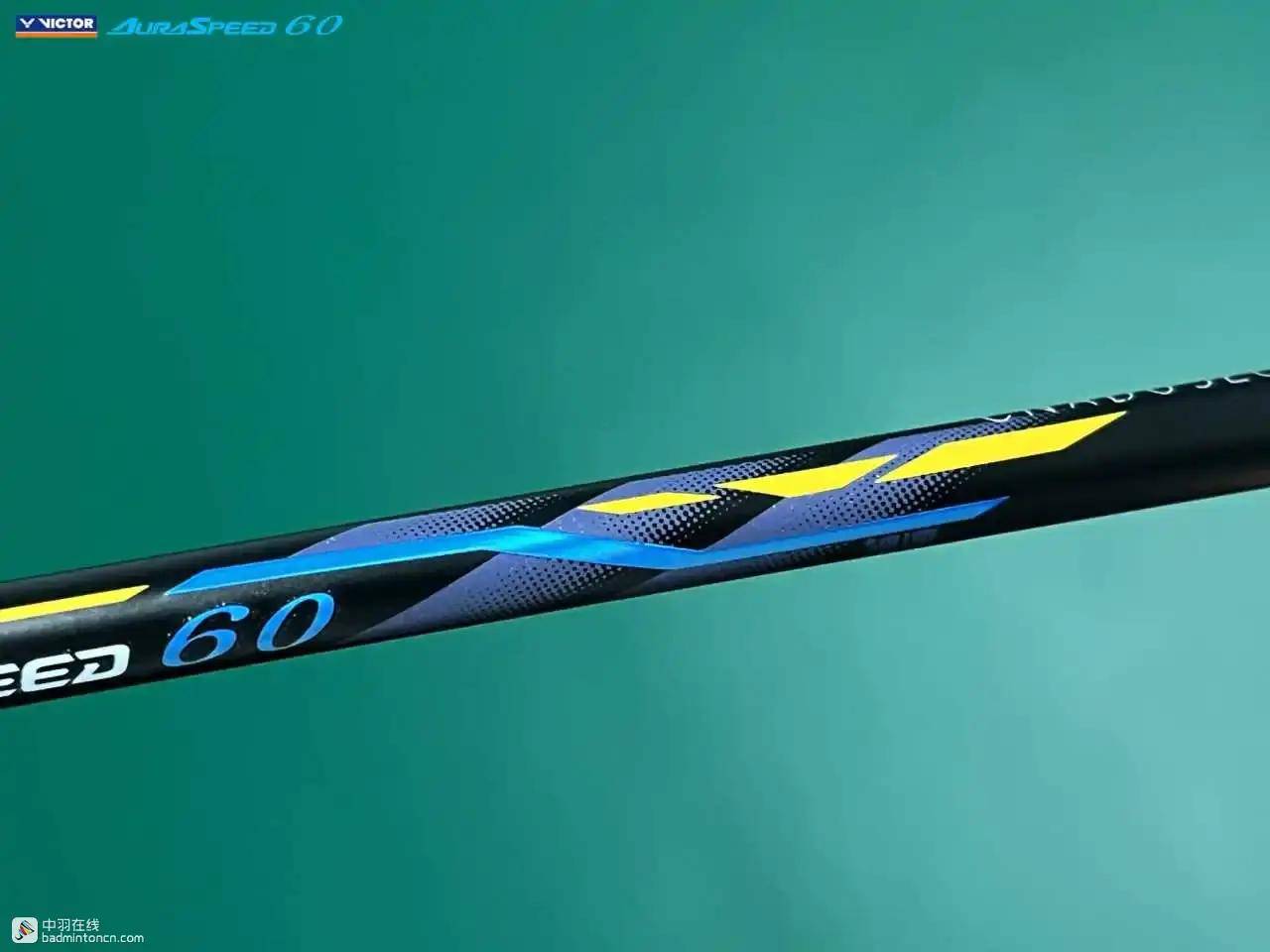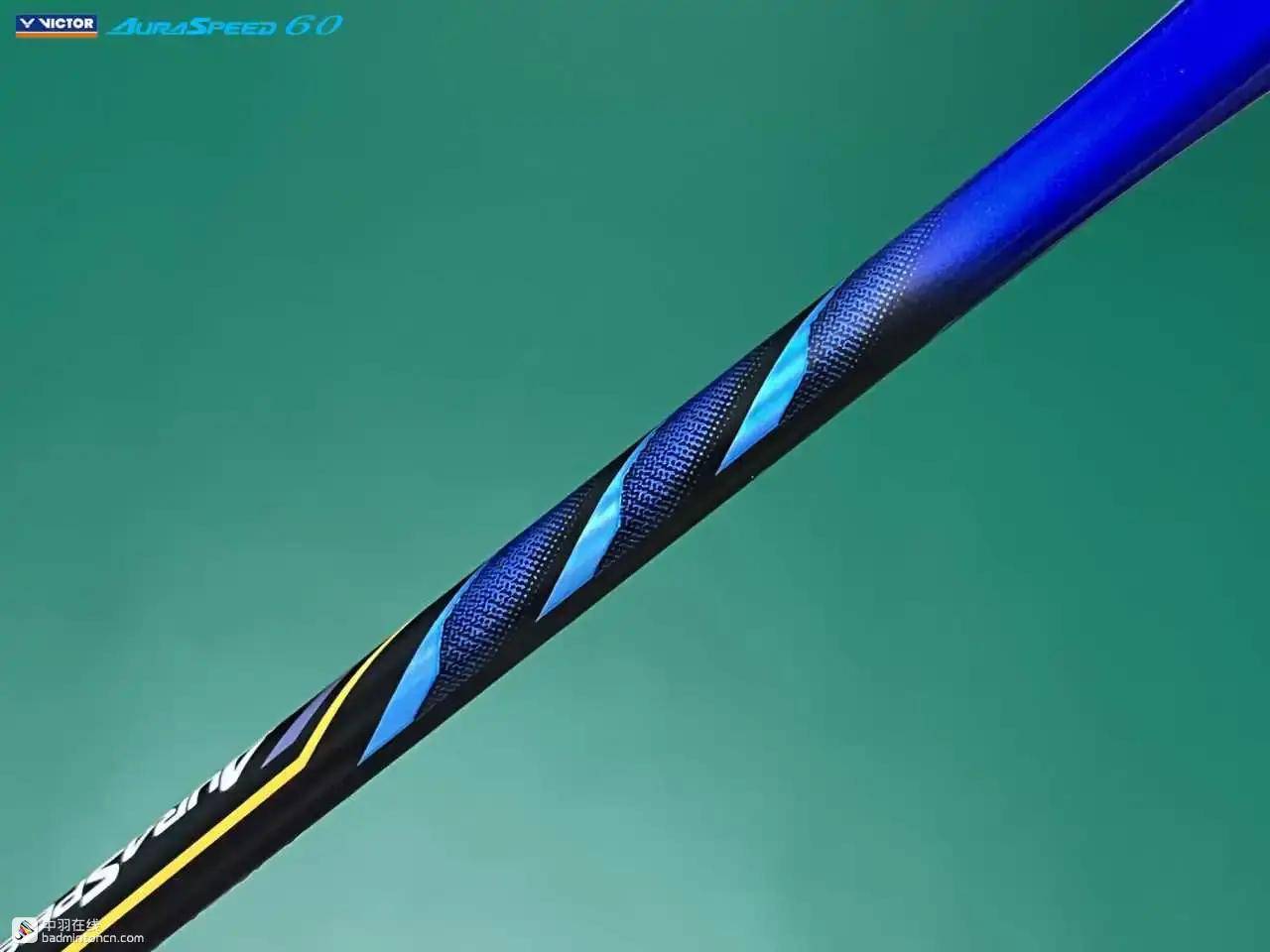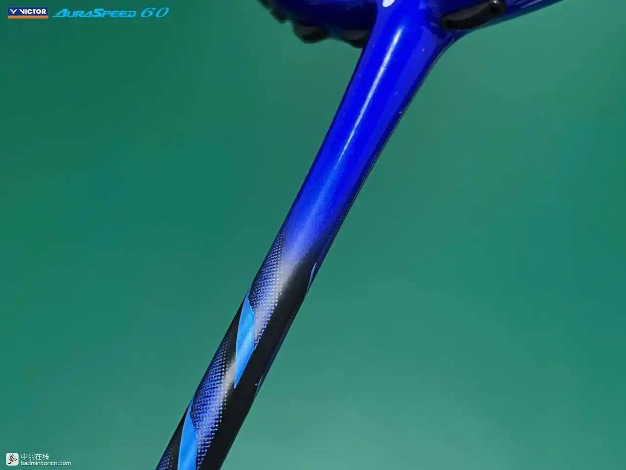型号名称印在中杆中部,在黑色的底色上,白色的“AURASPEED”非常显眼,而“60”则采用水蓝色水标,闪闪发光的表面和两旁同样质感的水标图案相互照应,科技感十足。