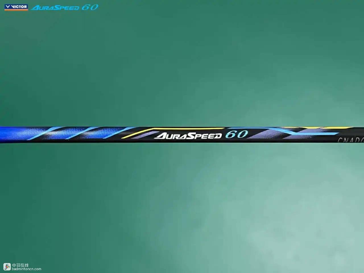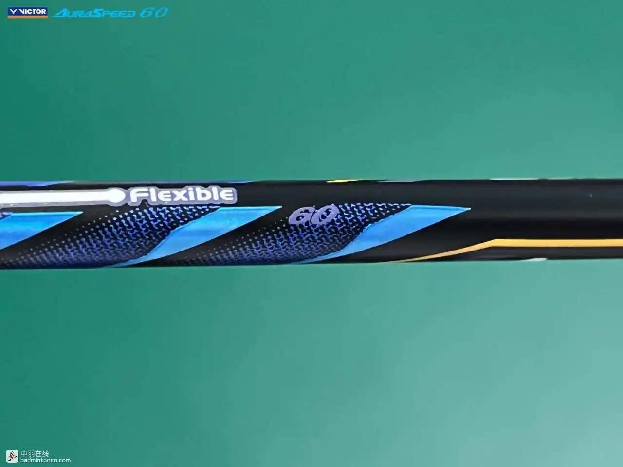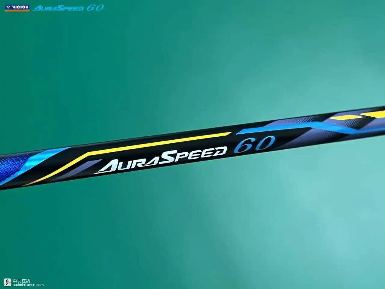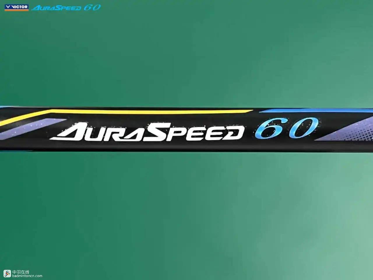型号名称印在中杆中部,在黑色的底色上,白色的“AURASPEED”非常显眼,而“60”则采用水蓝色水标,闪闪发光的表面和两旁同样质感的水标图案相互照应,科技感十足。