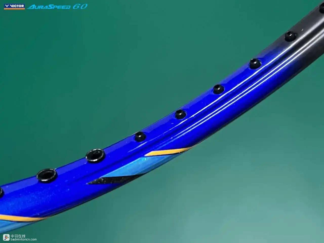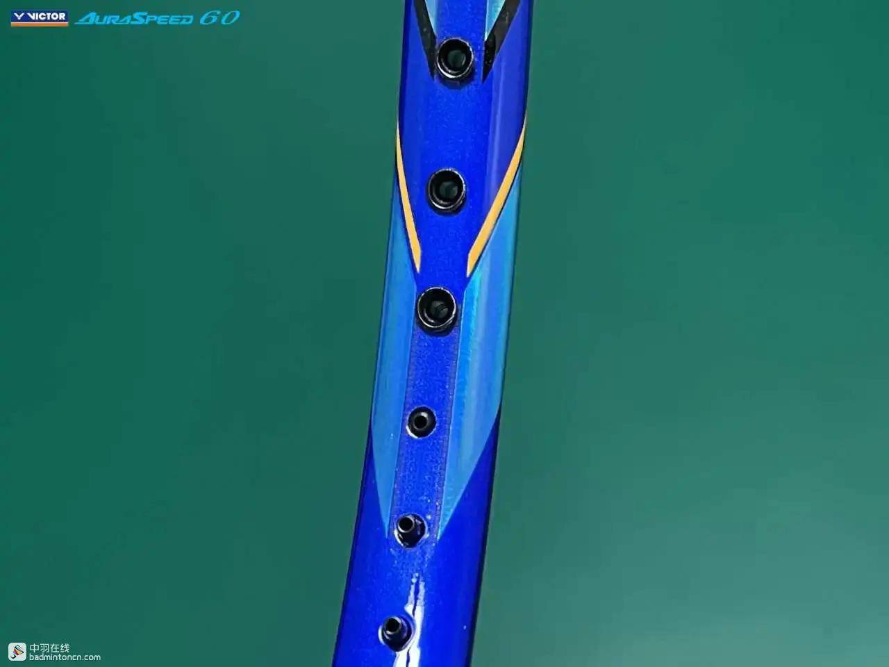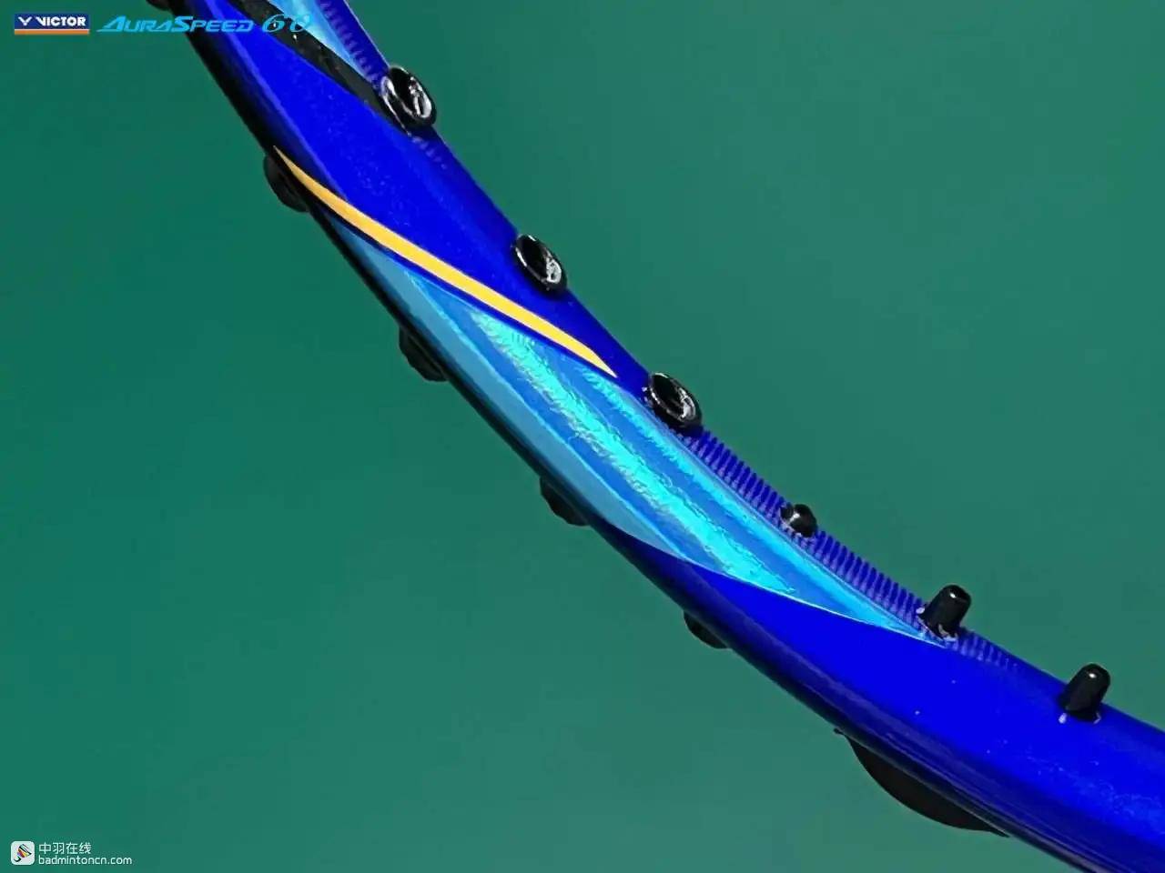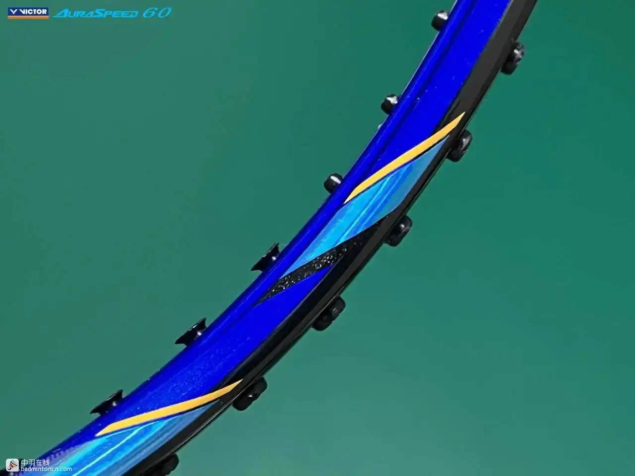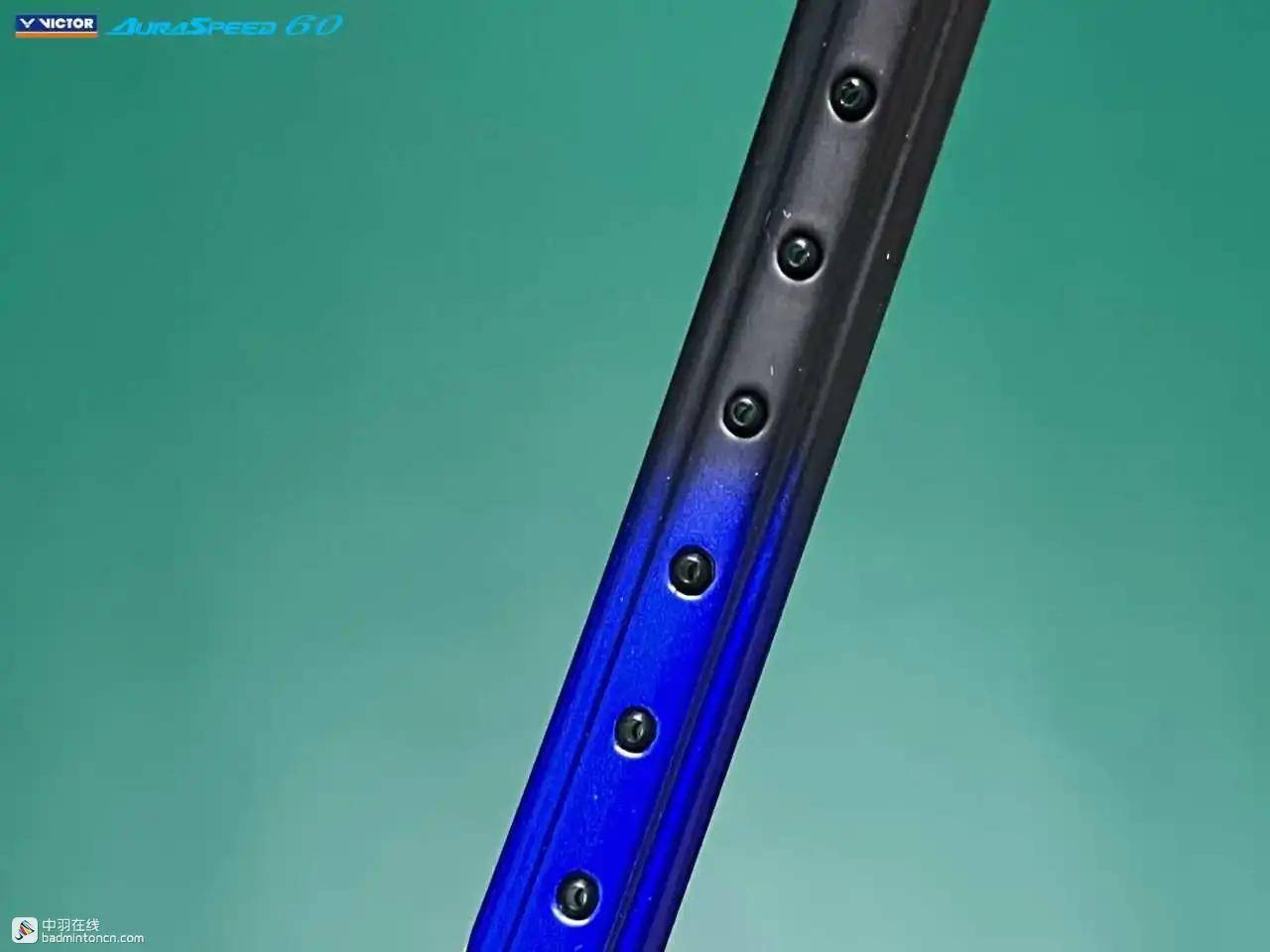 型号名称印在中杆中部,在黑色的底色上,白色的“AURASPEED”非常显眼,而“60”则采用水蓝色水标,闪闪发光的表面和两旁同样质感的水标图案相互照应,科技感十足。