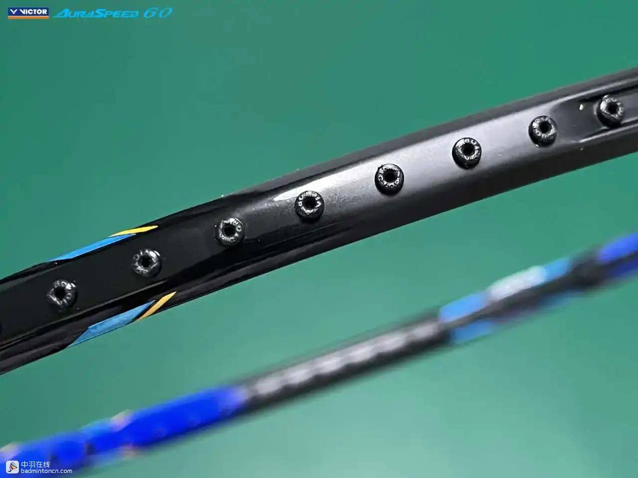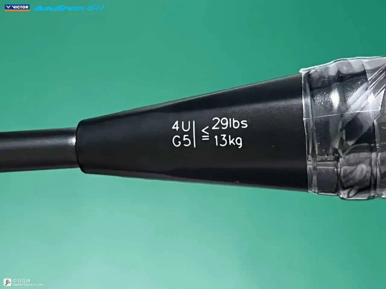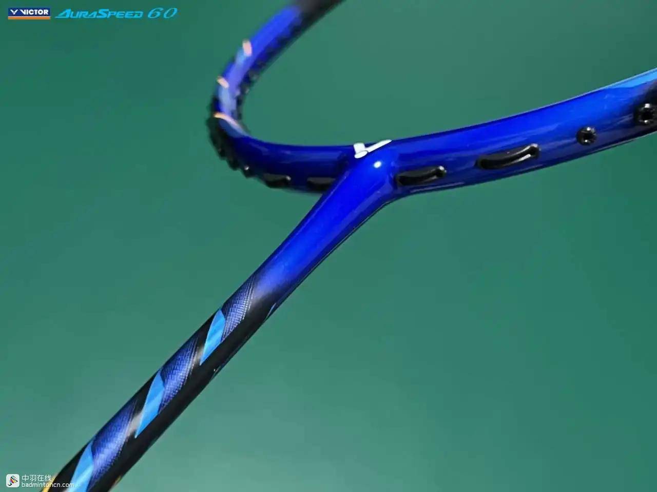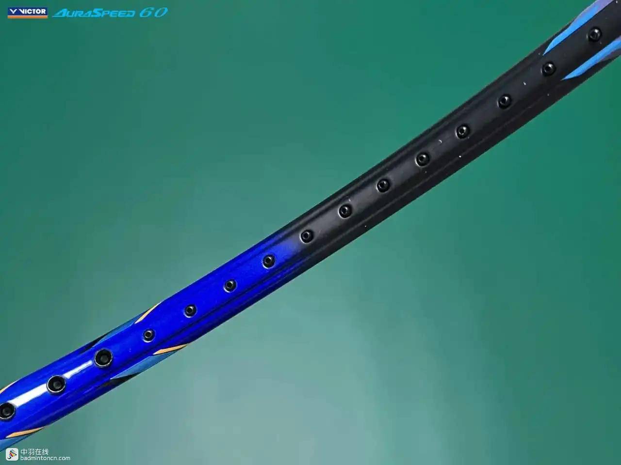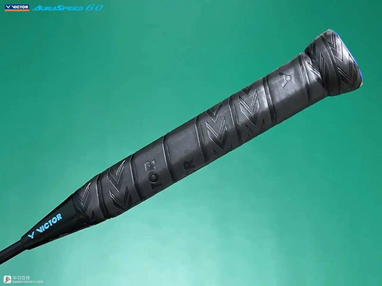 型号名称印在中杆中部,在黑色的底色上,白色的“AURASPEED”非常显眼,而“60”则采用水蓝色水标,闪闪发光的表面和两旁同样质感的水标图案相互照应,科技感十足。
