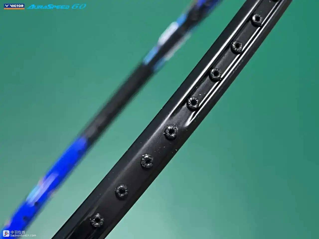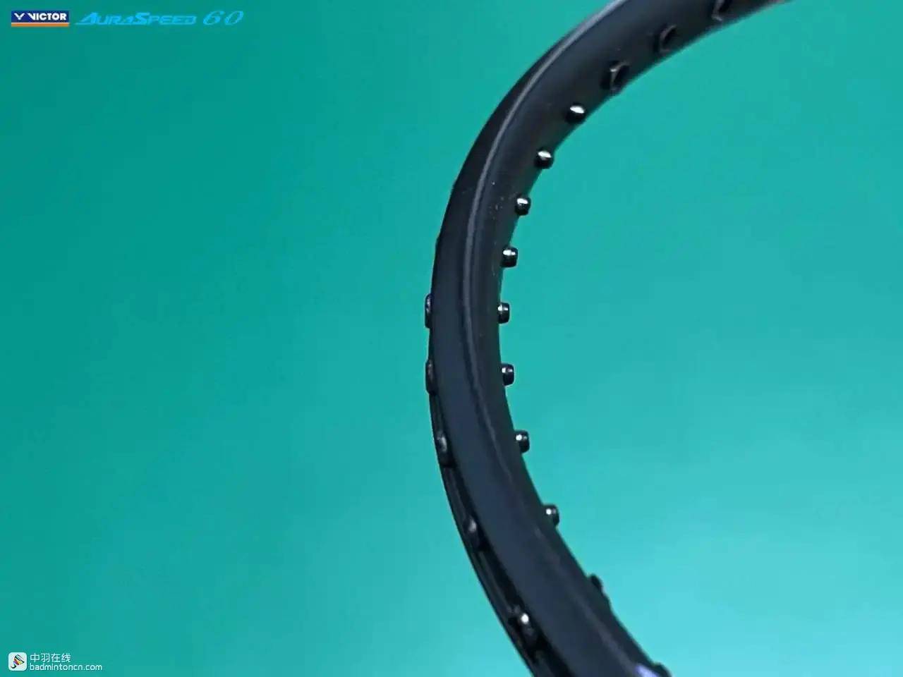 在外框外侧,ARS-60采用半线槽的设计,线槽起始处位于拍框侧面3点和9点略偏上的位置,这让拍框上半部分的圆弧段迎风面积进一步减小,降低风阻,同时也进一步提升其抗扭强度。