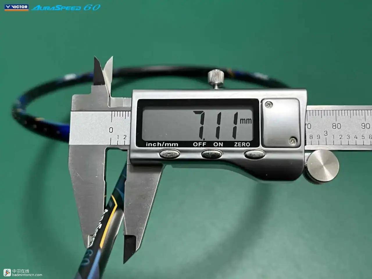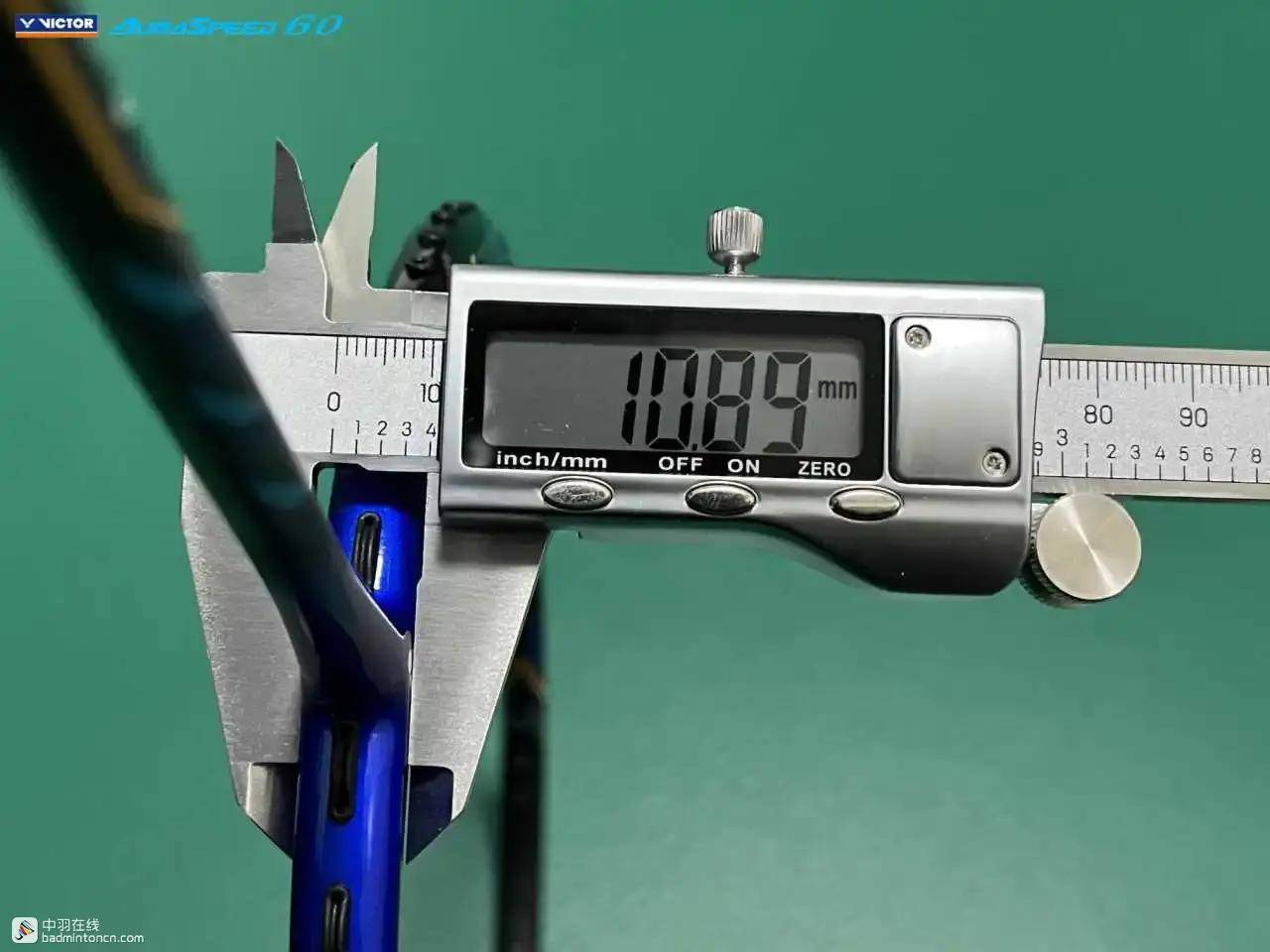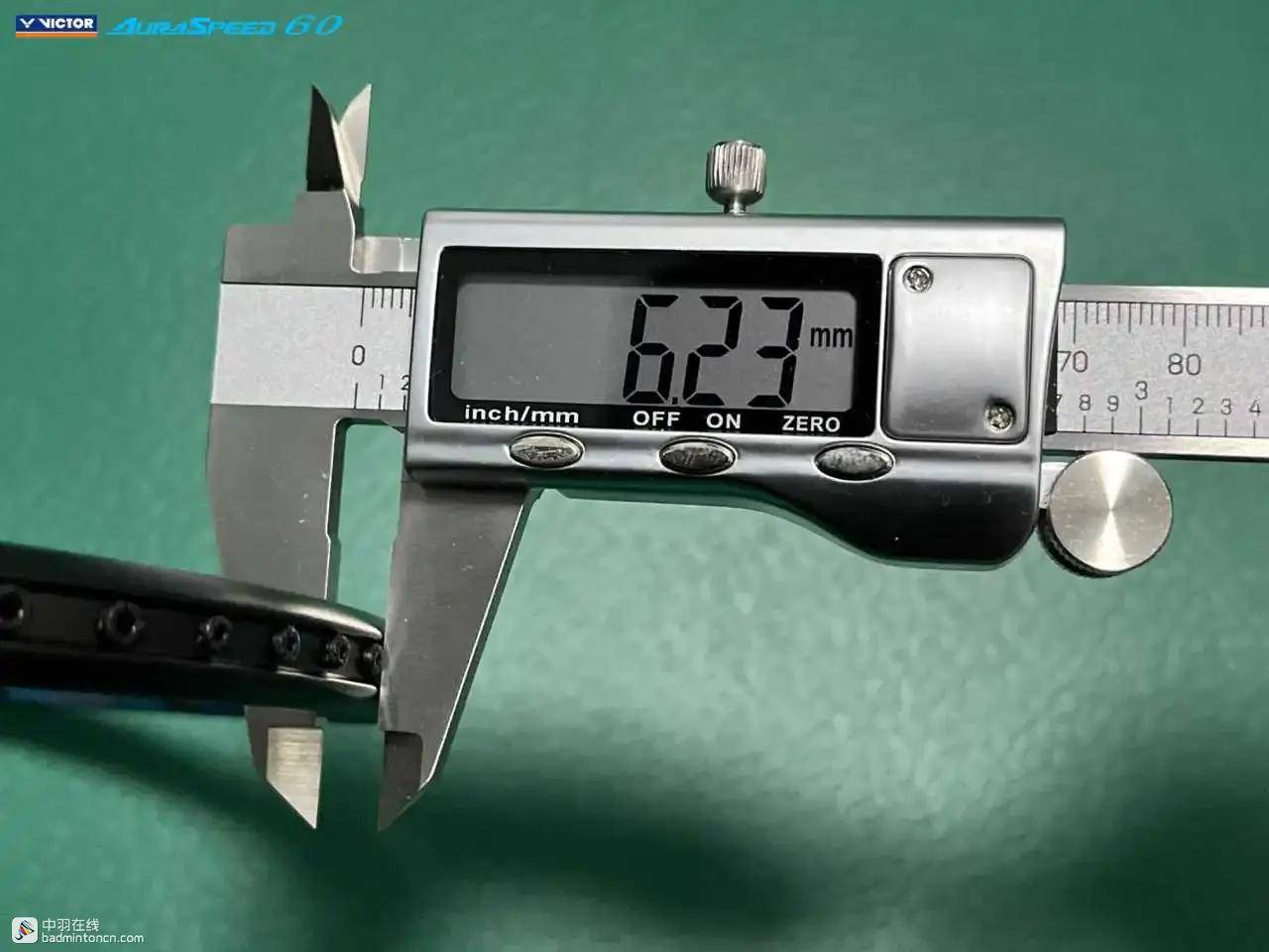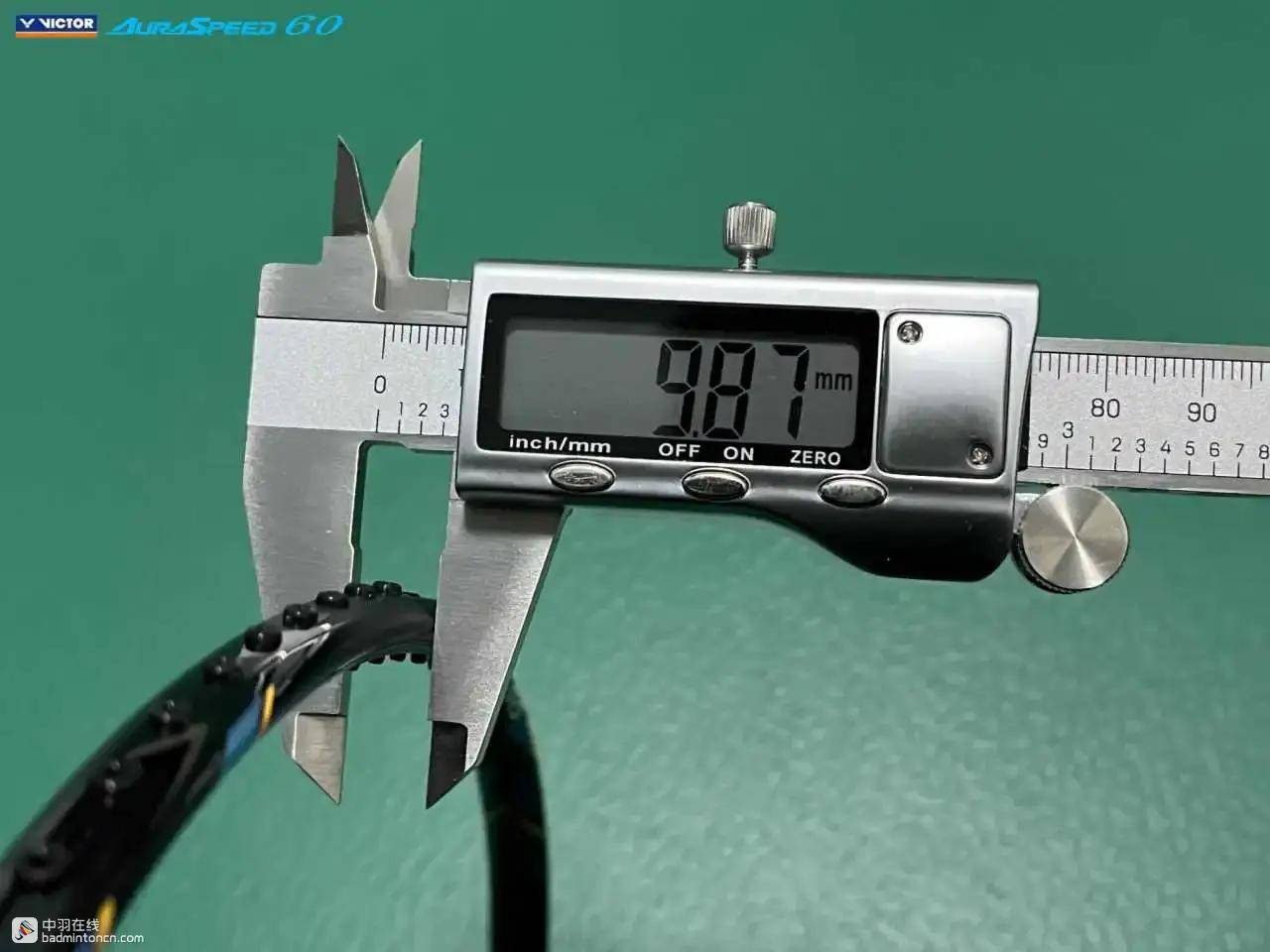实测下,ARS-60的拍身总长约为675mm,其中,拍框长度约255mm,中杆(锥盖顶部至T头两侧最下方线孔处)长度约206mm,手柄(底盖至锥盖顶部)则约为214mm,属于长柄短杆的速度型球拍。