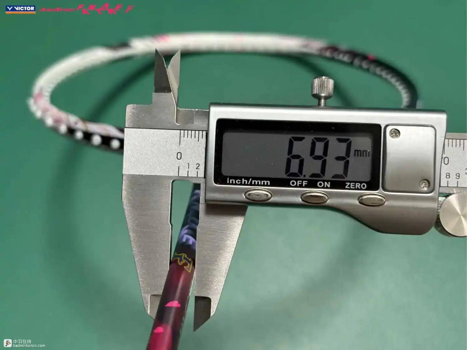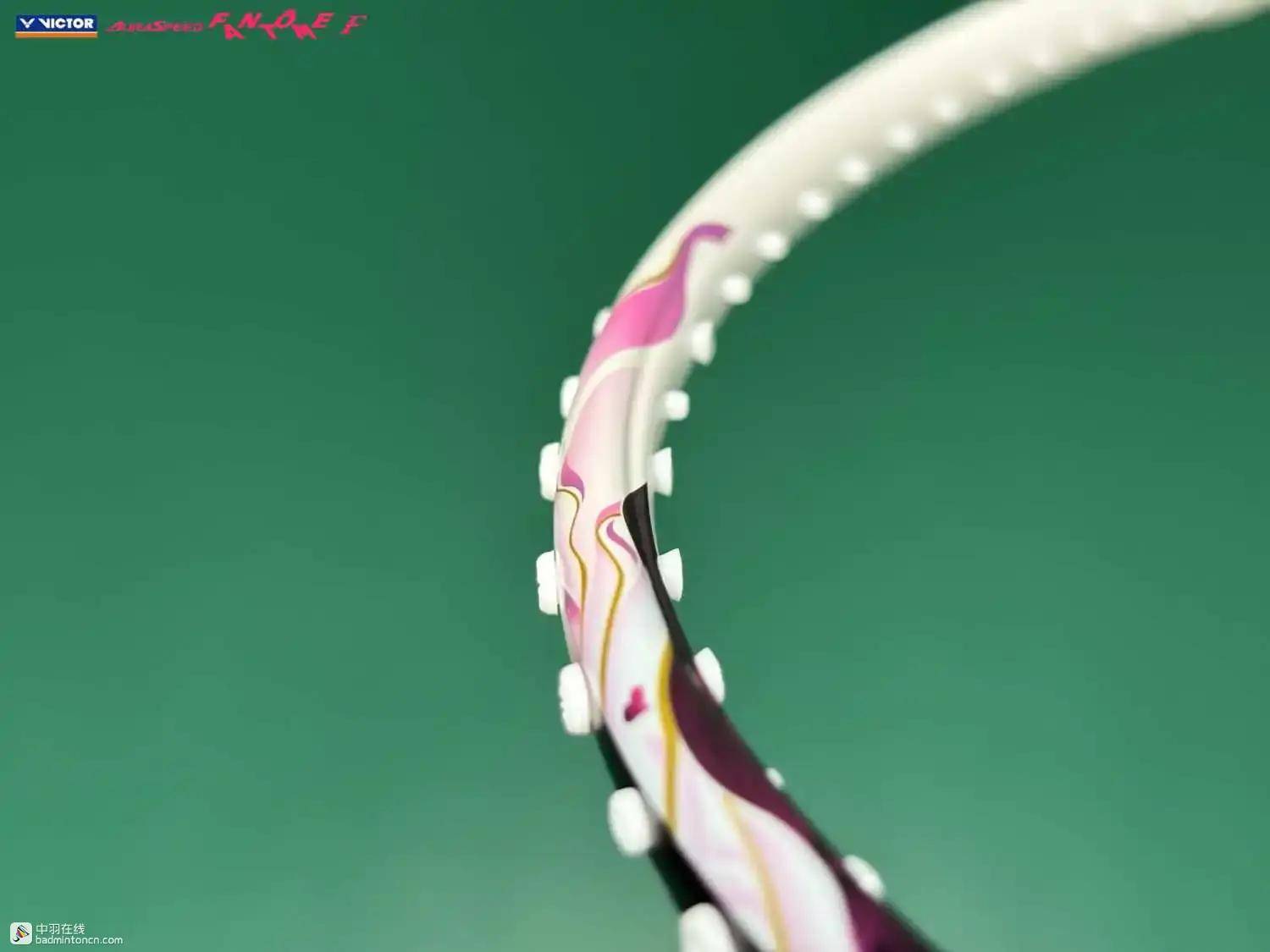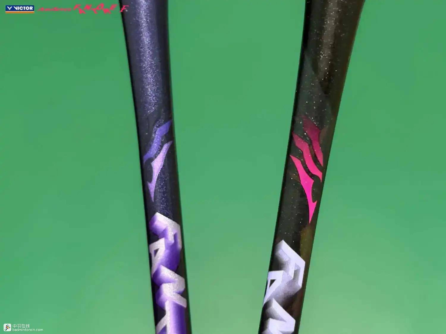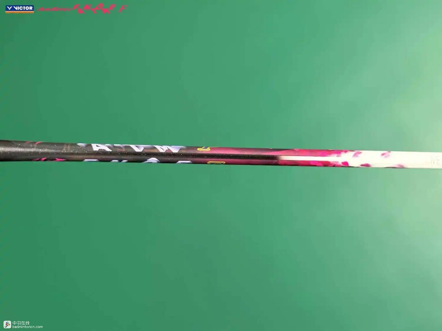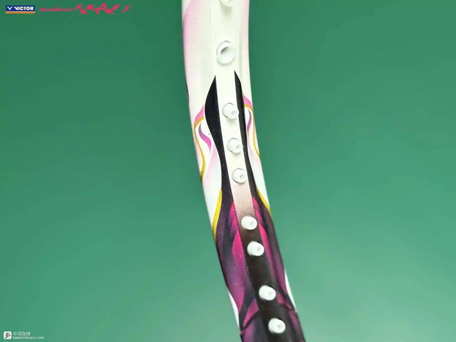 在图案设计上,ARS-影刃F也采用的是一种斜向的对应,左右来看,两边图案各是一种风格,以柔对刚;上下来看,也是如此。 在三通两侧,一侧以粉色配合柔和的线条,如飘动的丝带,在风中摇曳,再加上金色曲线的修饰,并点缀以爱心图案,温婉柔和,优雅丝滑,气质非凡。 而另一侧则是采用了截然不同的风格,三道玫红色的爪痕凸显出利刃般的凌厉感,神秘莫测。黑白相间类似泼墨的图案,展示了一种动若残影的速度感。 拍框上部的图案亦是同理,左右两部分的强烈对比正是ARS-影刃F涂装设计的耐人寻味之处,左右相对,一刚一柔,正如枝条密被利刺的玫瑰,虽表面娇柔,实则暗藏杀机。 ARS-影刃F的中杆由上部的黑色承接尾端的白色,过渡处采用大量玫瑰花瓣,两种色彩相互叠加,其中有的花瓣轮廓清晰,有的则采用模糊处理,似有远有近,有静有动,有虚有实,漫天飞花随风而舞,让人不由沁入那梦幻般的浪漫之中。 靠近三通处,影刃标志性的爪痕图案赫然呈现。 而影刃的英文字体醒目地印于中央,采用紫色,下方金色轮廓包围着紫宝石般的“F”字样。 T头中央的威克多LOGO水标同样采用了紫宝石质感的镭射表面处理。 总的来说,相较于ARS-影刃,ARS-影刃F在涂装的颜色选择、布局以及图案元素方面都有着较大的差异,颜色种类和图案细节都更为丰富。不过ARS-影刃F在原先的位置也保留了一些和ARS-影刃相对应的元素,例如中杆上型号名称的字体、拍框和中杆上的爪痕图案等等,也算是一种传承吧。 科技参数浅析 ARS-影刃F的规格为4U/G5,出厂即为空拍无底胶状态,去除热缩膜之后,重约77.13g,平衡点约为330mm。 上线(威克多VBS-61线,26磅)和手胶(缓震膜+威克多GR233手胶)之后,总重约为87.44g,平衡点则约为316mm。可以看到ARS-影刃F拥有非常高的平衡点,明显高于ARS-影刃,甚至比包括“龙牙家族”所有型号在内的威克多大部分球拍都要更高。 实测下,ARS-影刃F的拍身总长约为675mm,其中,拍框长度约252mm,中杆(锥盖顶部至T头两侧最下方线孔处)长度约215mm,手柄(底盖至锥盖顶部)则约为208mm。 相较于ARS-影刃,ARS-影刃F的拍框、中杆以及手柄长度都保持了一致。 ARS-影刃F延续了ARS-影刃的大拍面设计,同样采用76孔穿线模式。 二者的拍框宽度、形状也均相同。 在框型方面,ARS-影刃F亦传承了ARS-影刃的动力破风框(DYNAMIC-SWORD),拍框截面菱形结构根据位置不同有所区别,增大引导空气的截面积以提升挥速。 拍框左上(约10点和11点之间)、右上(约1点和2点之间)、左下(约7点和8点之间)、右下(约4点和5点之间)对称分布了四处浅凹槽,提升拍框的抗扭。 ARS-影刃F也继承了开创于ARS-影刃身上的薄翼拍框设计,拍框上的至薄处(即顶框12点位置附近)的厚度仅有5.0mm,对挥速的提升效果是非常可观的。 实测之下,ARS-影刃F拍框底部(靠近T头处)宽度实测约为11.43mm,厚度约为8.25mm。 拍框两侧(3点、9点钟方向)宽度则约为10.71mm,厚度约为5.81mm。 拍框顶部宽度约为10.82mm,厚度约为5.18mm。可见顶框的位置确实如参数所标注的那样,是非常纤薄的;而比笔者手中的ARS-影刃要厚了大约0.1至0.2mm的原因,除球拍制造和测量误差外,也有白色漆水一般比深色漆水更厚的因素。 此外,ARS-影刃F的拍框外侧采用线槽结构设计,线槽分布在上方的大半个拍框,比一般的半线槽要长,大约起始于4点和8点位置(由三通向上数第12和13个线孔之间)。 对比ARS-影刃F和ARS-影刃的线槽长度,可以看到二者也是相同的。 ARS-影刃F的拍框和ARS-影刃同样运用了纳米气凝胶(NANO AEROGEL),将其作为一种内发泡材料注入球拍框体,相比传统填充物更轻的它能够释放拍框的配重空间,让碳纤维在拍框上的用量得以增加,不仅能够使球拍更轻量,也使得拍框强度得到提升。 此外,拍框亦搭载强芯填充科技(HARD CORED TECHNOLOGY),提升拍框击球时的稳定性,保证出球的准确度。 ARS-影刃F采用6.6mm中杆,实际测量得中杆外径约为6.93mm(测量点位于中杆中点处)。 相比ARS-影刃的6.8mm中杆,ARS-影刃F的中杆更加纤细,更容易释放弹性;此外,ARS-影刃F在硬度方面也相较于ARS-影刃有所下调,更软弹的中杆有利于使用者更轻松地去发力。 中杆搭载标配的百洛碳素纤维(PYROFIL),保证出色的弹性性能。 另外,ARS-影刃F的中杆与拍框均导入PBO高性能纤维(PBO HIGH PERFORMANCE FIBER),航天级的强韧纤维材料,可大幅提升球拍整体的力量传导性能,使得球拍在保证重量不变的前提下亦兼备强韧度与舒适手感。 ARS-影刃F依然采用悬浮科技手柄,搭配半透明塑料锥盖及蓝色半透明底盖,锥盖内部无力量环结构,能够更充分地释放中杆摆动的自由度,让挥拍更流畅。 ARS-影刃F的建议穿线磅数为最高28磅,比同规格4U的ARS-影刃要低一磅。 上手体验详解 ARS-影刃F拥有非常显著的头重感,上手挥拍时,拍头的惯性明显,随挥感非常强烈,和5U规格的TK-龙牙MUSE有些许相似,这种平衡点很高的球拍现在相对来说不多,因此对于大部分球友来说,在初上手时可能需要一定的适应时间,尤其是在控球方面,较重的拍头增加了精确控制落点的难度,需要一个磨合的过程。 因为头重的缘故,ARS-影刃F的挥重明显大于ARS-影刃,而且中杆更软、更弹,更容易打出形变,总体头重杆软的特点使得其非常好上手,尤其是上手挥拍不用太多主动发力就能把球打出去,但同时击球后中杆的颤动感比ARS-影刃明显,出球的准确度相比ARS-影刃打了折扣,有时会感觉出球有些过于弹,失去了ARS-影