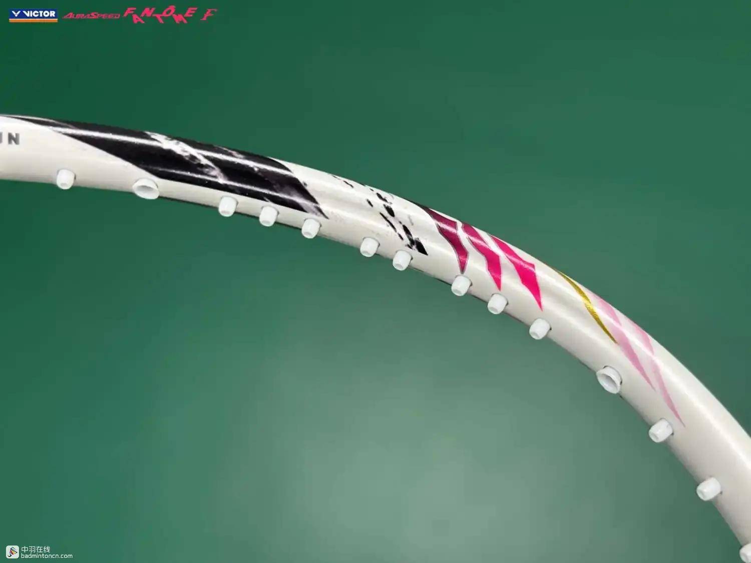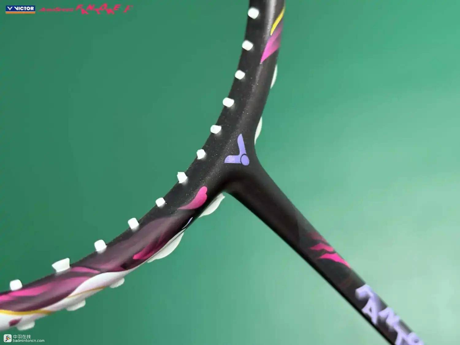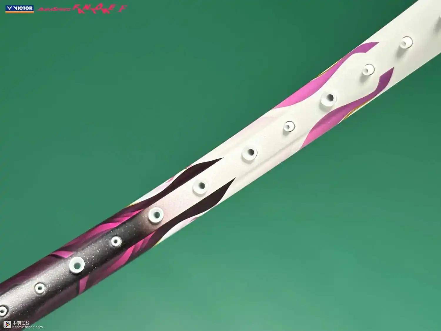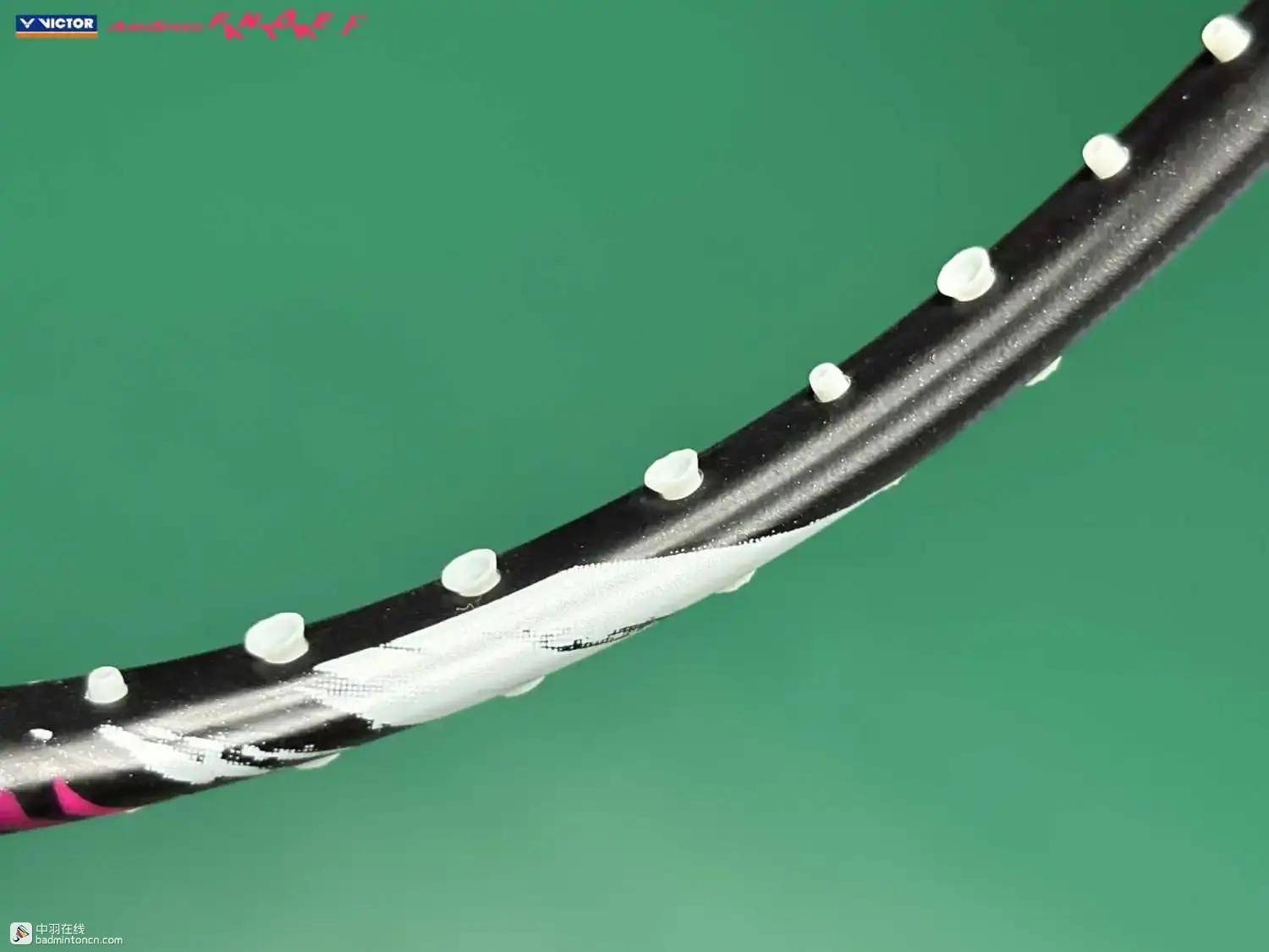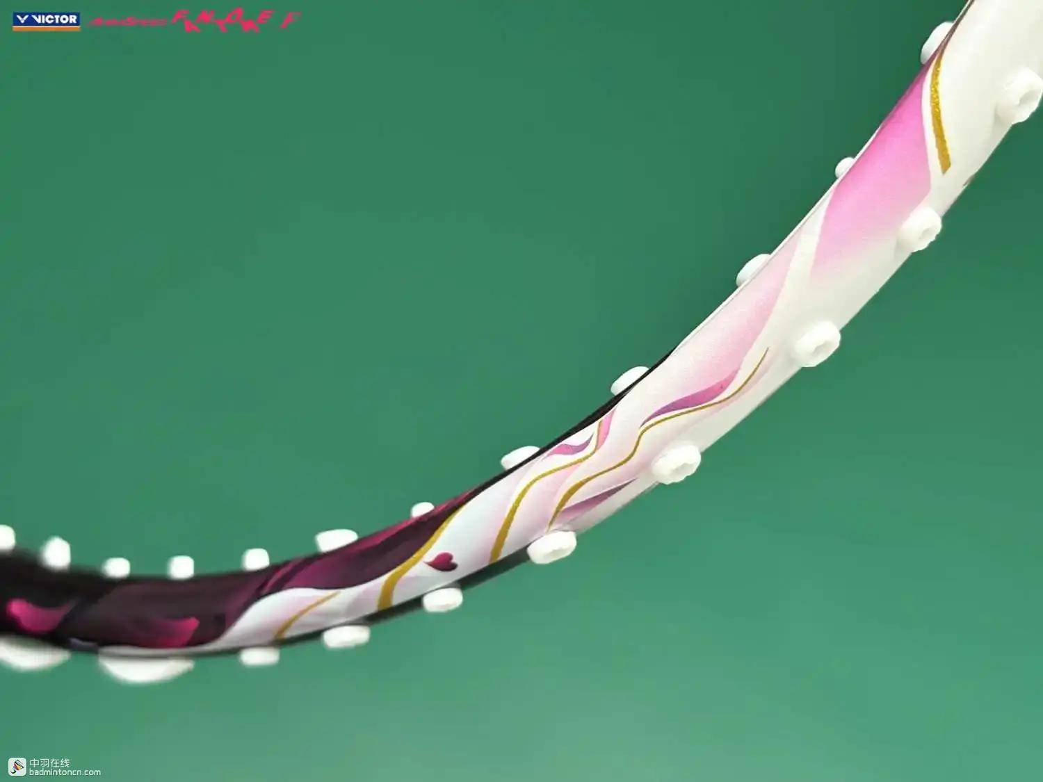 在图案设计上,ARS-影刃F也采用的是一种斜向的对应,左右来看,两边图案各是一种风格,以柔对刚;上下来看,也是如此。 在三通两侧,一侧以粉色配合柔和的线条,如飘动的丝带,在风中摇曳,再加上金色曲线的修饰,并点缀以爱心图案,温婉柔和,优雅丝滑,气质非凡。 而另一侧则是采用了截然不同的风格,三道玫红色的爪痕凸显出利刃般的凌厉感,神秘莫测。黑白相间类似泼墨的图案,展示了一种动若残影的速度感。 拍框上部的图案亦是同理,左右两部分的强烈对比正是ARS-影刃F涂装设计的耐人寻味之处,左右相对,一刚一柔,正如枝条密被利刺的玫瑰,虽表面娇柔,实则暗藏杀机。 ARS-影刃F的中杆由上部的黑色承接尾端的白色,过渡处采用大量玫瑰花瓣,两种色彩相互叠加,其中有的花瓣轮廓清晰,有的则采用模糊处理,似有远有近,有静有动,有虚有实,漫天飞花随风而舞,让人不由沁入那梦幻般的浪漫之中。 靠近三通处,影刃标志性的爪痕图案赫然呈现。 而影刃的英文字体醒目地印于中央,采用紫色,下方金色轮廓包围着紫宝石般的“F”字样。 T头中央的威克多LOGO水标同样采用了紫宝石质感的镭射表面处理。 总的来说,相较于ARS-影刃,ARS-影刃F在涂装的颜色选择、布局以及图案元素方面都有着较大的差异,颜色种类和图案细节都更为丰富。不过ARS-影刃F在原先的位置也保留了一些和ARS-影刃相对应的元素,例如中杆上型号名称的字体、拍框和中杆上的爪痕图案等等,也算是一种传承吧。 科技参数浅析 ARS-影刃F的规格为4U/G5,出厂即为空拍无底胶状态,去除热缩膜之后,重约77.13g,平衡点约为330mm。 上线(威克多VBS-61线,26磅)和手胶(缓震膜+威克多GR233手胶)之后,总重约为87.44g,平衡点则约为316mm。可以看到ARS-影刃F拥有非常高的平衡点,明显高于ARS-影刃,甚至比包括“龙牙家族”所有型号在内的威克多大部分球拍都要更高。 实测下,ARS-影刃F的拍身总长约为675mm,其中,拍框长度约252mm,中杆(锥盖顶部至T头两侧最下方线孔处)长度约215mm,手柄(底盖至锥盖顶部)则约为208mm。 相较于ARS-影刃,ARS-影刃F的拍框、中杆以及手柄长度都保持了一致。 ARS-影刃F延续了ARS-影刃的大拍面设计,同样采用76孔穿线模式。 二者的拍框宽度、形状也均相同。 在框型方面,ARS-影刃F亦传承了ARS-影刃的动力破风框(DYNAMIC-SWORD),拍框截面菱形结构根据位置不同有所区别,增大引导空气的截面积以提升挥速。 拍框左上(约10点和11点之间)、右上(约1点和2点之间)、左下(约7点和8点之间)、右下(约4点和5点之间)对称分布了四处浅凹槽,提升拍框的抗扭。 ARS-影刃F也继承了开创于ARS-影刃身上的薄翼拍框设计,拍框上的至薄处(即顶框12点位置附近)的厚度仅有5.0mm,对挥速的提升效果是非常可观的。 实测之下,ARS-影刃F拍框底部(靠近T头处)宽度实测约为11.43mm,厚度约为8.25mm。 拍框两侧(3点、9点钟方向)宽度则约为10.71mm,厚度约为5.81mm。 拍框顶部宽度约为10.82mm,厚度约为5.18mm。可见顶框的位置确实如参数所标注的那样,是非常纤薄的;而比笔者手中的ARS-影刃要厚了大约0.1至0.2mm的原因,除球拍制造和测量误差外,也有白色漆水一般比深色漆水更厚的因素。 此外,ARS-影刃F的拍框外侧采用线槽结构设计,线槽分布在上方的大半个拍框,比一般的半线槽要长,大约起始于4点和8点位置(由三通向上数第12和13个线孔之间)。 对比ARS-影刃F和ARS-影刃的线槽长度,可以看到二者也是相同的。 ARS-影刃F的拍框和ARS-影刃同样运用了纳米气凝胶(NANO AEROGEL),将其作为一种内发泡材料注入球拍框体,相比传统填充物更轻的它能够释放拍框的配重空间,让碳纤维在拍框上的用量得以增加,不仅能够使球拍更轻量,也使得拍框强度得到提升。 此外,拍框亦搭载强芯填充科技(HARD CORED TECHNOLOGY),提升拍框击球时的稳定性,保证出球的准确度。 ARS-影刃F采用6.6mm中杆,实际测量得中杆外径约为6.93mm(测量点位于中杆中点处)。 相比ARS-影刃的6.8mm中杆,ARS-影刃F的中杆更加纤细,更容易释放弹性;此外,ARS-影刃F在硬度方面也相较于ARS-影刃有所下调,更软弹的中杆有利于使用者更轻松地去发力。 中杆搭载标配的百洛碳素纤维(PYROFIL),保证出色的弹性性能。 另外,ARS-影刃F的中杆与拍框均导入PBO高性能纤维(PBO HIGH PERFORMANCE FIBER),航天级的强韧纤维材料,可大幅提升球拍整体的力量传导性能,使得球拍在保证重量不变的前提下亦兼备强韧度与舒适手感。 ARS-影刃F依然采用悬浮科技手柄,搭配半透明塑料锥盖及蓝色半透明底盖,锥盖内部无力量环结构,能够更充分地释放中杆摆动的自由度,让挥拍更流畅。 ARS-影刃F的建议穿线磅数为最高28磅,比同规格4U的ARS-影刃要低一磅。 上手体验详解 ARS-影刃F拥有非常显著的头重感,上手挥拍时,拍头的惯性明显,随挥感非常强烈,和5U规格的TK-龙牙MUSE有些许相似,这种平衡点很高的球拍现在相对来说不多,因此对于大部分球友来说,在初上手时可能需要一定的适应时间,尤其是在控球方面,较重的拍头增加了精确控制落点的难度,需要一个磨合的过程。 因为头重的缘故,ARS-影刃F的挥重明显大于ARS-影刃,而且中杆更软、更弹,更容易打出形变,总体头重杆软的特点使得其非常好上手,尤其是上手挥拍不用太多主动发力就能把球打出去,但同时击球后中杆的颤动感比ARS-影刃明显,出球的准确度相比ARS-影刃打了折扣,有时会感觉出球有些过于弹,失去了ARS-影