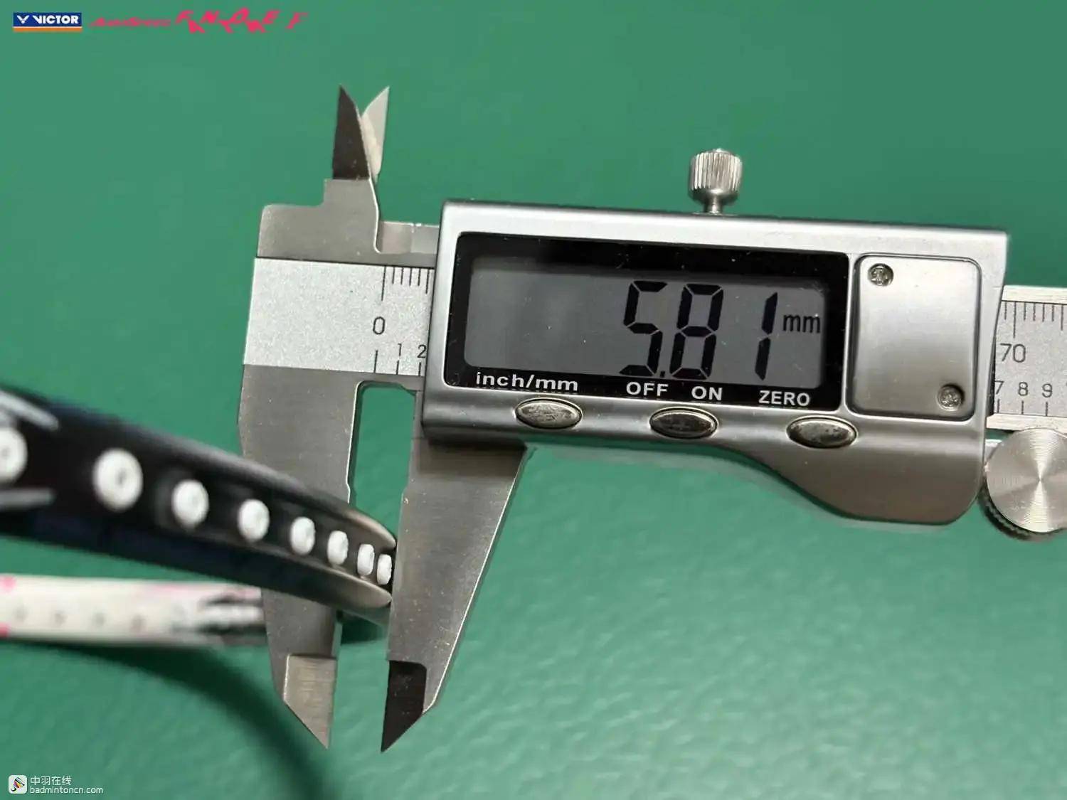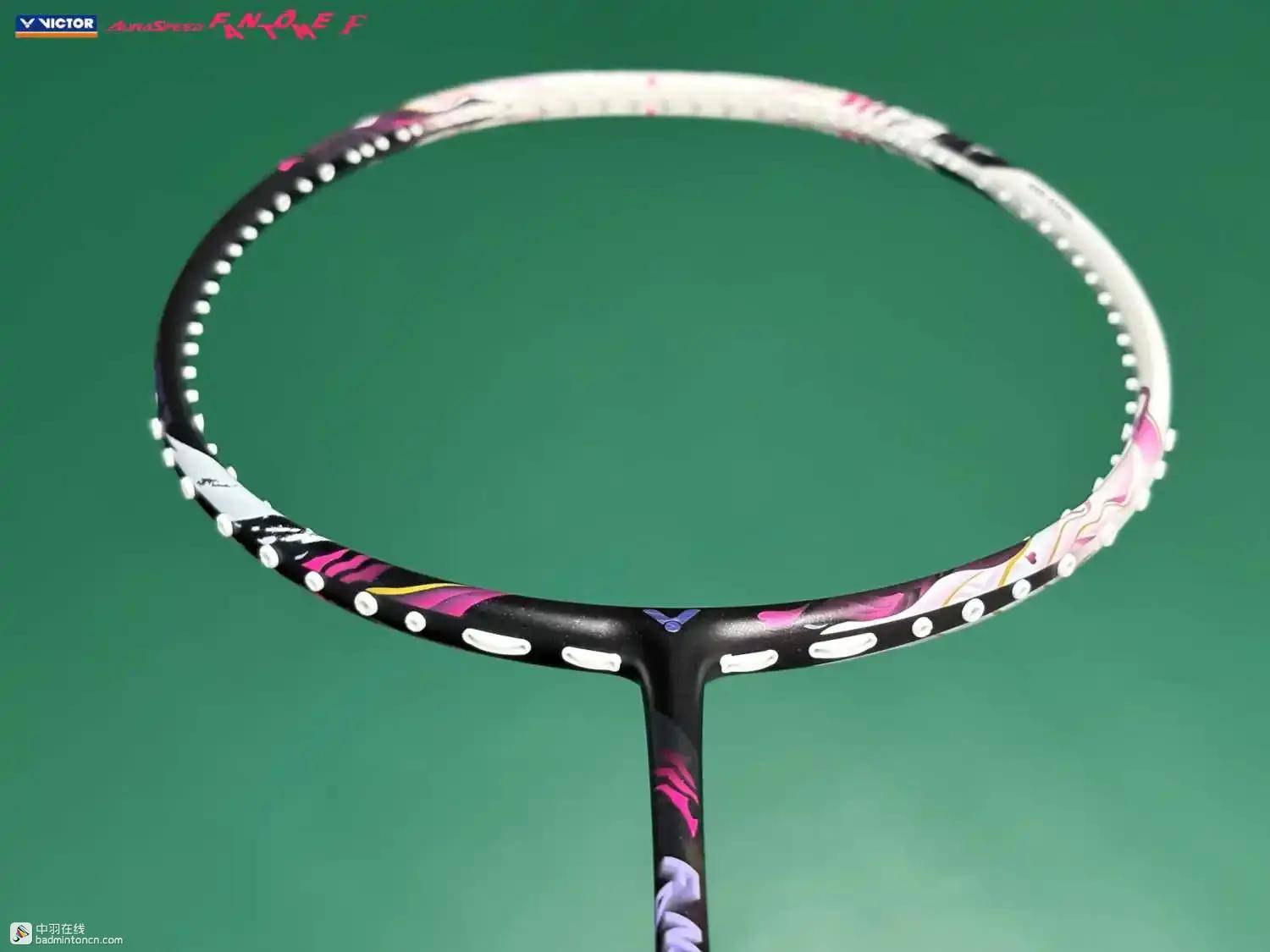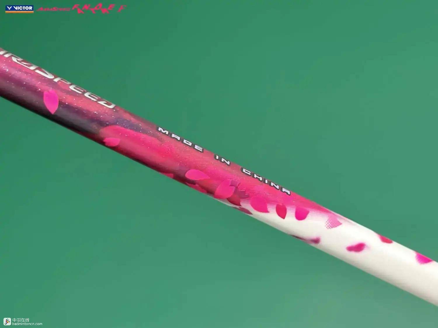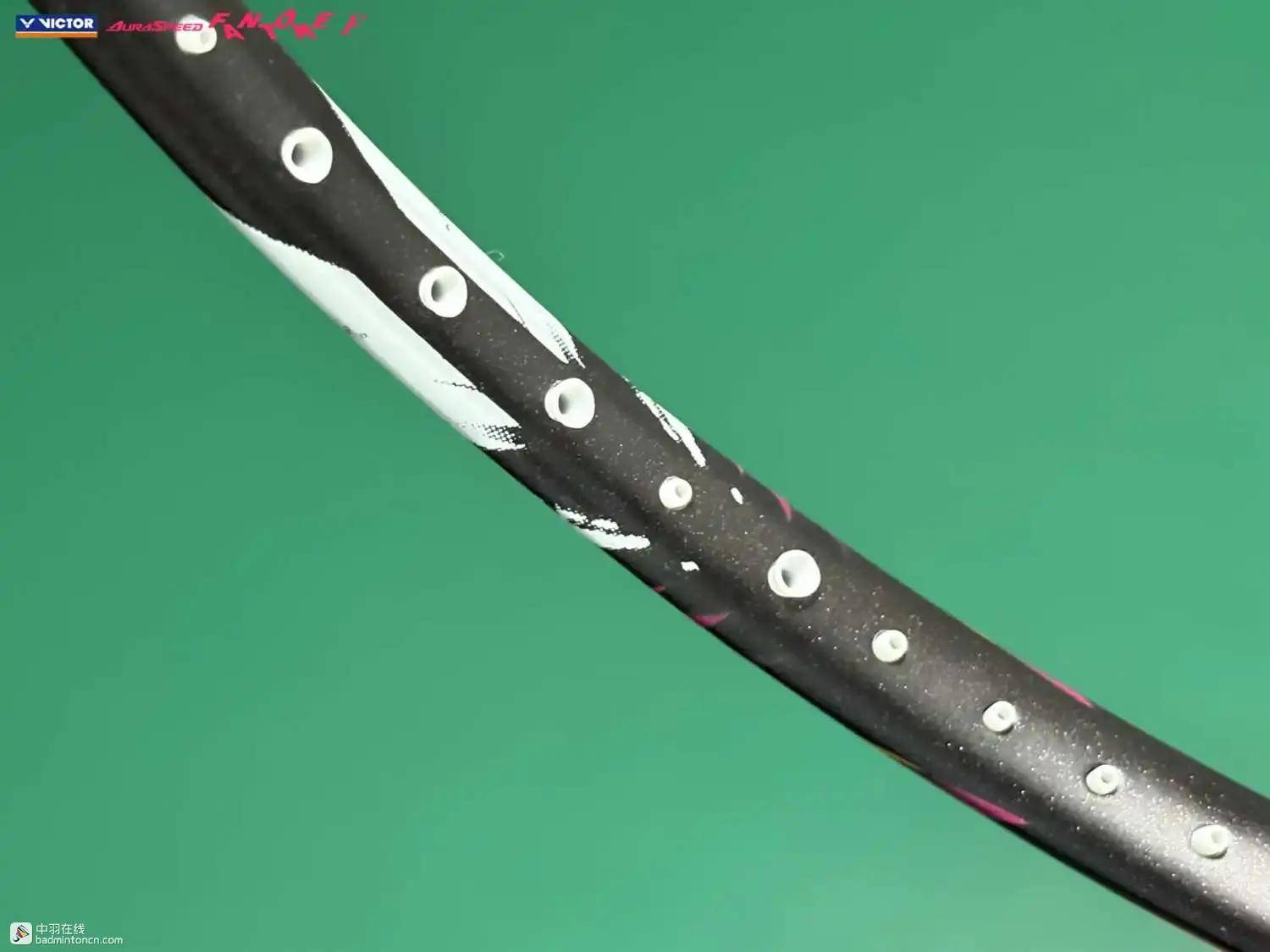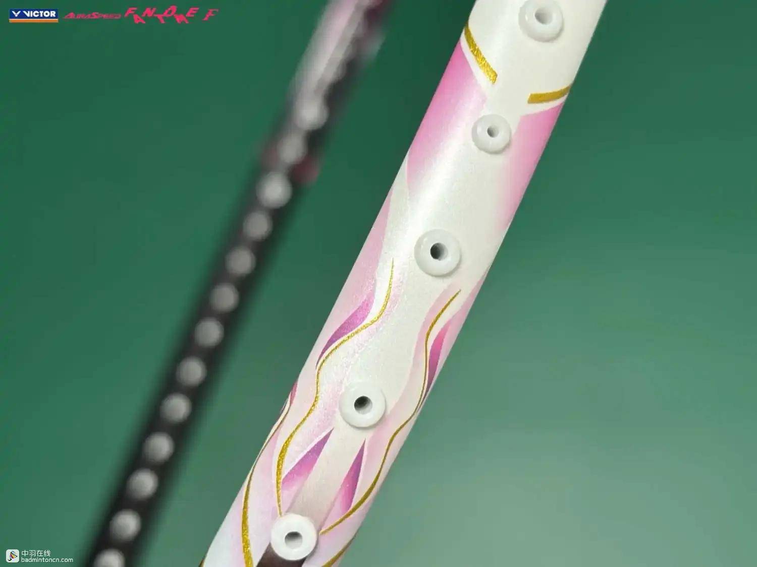 在图案设计上,ARS-影刃F也采用的是一种斜向的对应,左右来看,两边图案各是一种风格,以柔对刚;上下来看,也是如此。 在三通两侧,一侧以粉色配合柔和的线条,如飘动的丝带,在风中摇曳,再加上金色曲线的修饰,并点缀以爱心图案,温婉柔和,优雅丝滑,气质非凡。 而另一侧则是采用了截然不同的风格,三道玫红色的爪痕凸显出利刃般的凌厉感,神秘莫测。黑白相间类似泼墨的图案,展示了一种动若残影的速度感。 拍框上部的图案亦是同理,左右两部分的强烈对比正是ARS-影刃F涂装设计的耐人寻味之处,左右相对,一刚一柔,正如枝条密被利刺的玫瑰,虽表面娇柔,实则暗藏杀机。 ARS-影刃F的中杆由上部的黑色承接尾端的白色,过渡处采用大量玫瑰花瓣,两种色彩相互叠加,其中有的花瓣轮廓清晰,有的则采用模糊处理,似有远有近,有静有动,有虚有实,漫天飞花随风而舞,让人不由沁入那梦幻般的浪漫之中。 靠近三通处,影刃标志性的爪痕图案赫然呈现。 而影刃的英文字体醒目地印于中央,采用紫色,下方金色轮廓包围着紫宝石般的“F”字样。 T头中央的威克多LOGO水标同样采用了紫宝石质感的镭射表面处理。 总的来说,相较于ARS-影刃,ARS-影刃F在涂装的颜色选择、布局以及图案元素方面都有着较大的差异,颜色种类和图案细节都更为丰富。不过ARS-影刃F在原先的位置也保留了一些和ARS-影刃相对应的元素,例如中杆上型号名称的字体、拍框和中杆上的爪痕图案等等,也算是一种传承吧。 科技参数浅析 ARS-影刃F的规格为4U/G5,出厂即为空拍无底胶状态,去除热缩膜之后,重约77.13g,平衡点约为330mm。 上线(威克多VBS-61线,26磅)和手胶(缓震膜+威克多GR233手胶)之后,总重约为87.44g,平衡点则约为316mm。可以看到ARS-影刃F拥有非常高的平衡点,明显高于ARS-影刃,甚至比包括“龙牙家族”所有型号在内的威克多大部分球拍都要更高。 实测下,ARS-影刃F的拍身总长约为675mm,其中,拍框长度约252mm,中杆(锥盖顶部至T头两侧最下方线孔处)长度约215mm,手柄(底盖至锥盖顶部)则约为208mm。 相较于ARS-影刃,ARS-影刃F的拍框、中杆以及手柄长度都保持了一致。 ARS-影刃F延续了ARS-影刃的大拍面设计,同样采用76孔穿线模式。 二者的拍框宽度、形状也均相同。 在框型方面,ARS-影刃F亦传承了ARS-影刃的动力破风框(DYNAMIC-SWORD),拍框截面菱形结构根据位置不同有所区别,增大引导空气的截面积以提升挥速。 拍框左上(约10点和11点之间)、右上(约1点和2点之间)、左下(约7点和8点之间)、右下(约4点和5点之间)对称分布了四处浅凹槽,提升拍框的抗扭。 ARS-影刃F也继承了开创于ARS-影刃身上的薄翼拍框设计,拍框上的至薄处(即顶框12点位置附近)的厚度仅有5.0mm,对挥速的提升效果是非常可观的。 实测之下,ARS-影刃F拍框底部(靠近T头处)宽度实测约为11.43mm,厚度约为8.25mm。 拍框两侧(3点、9点钟方向)宽度则约为10.71mm,厚度约为5.81mm。 拍框顶部宽度约为10.82mm,厚度约为5.18mm。可见顶框的位置确实如参数所标注的那样,是非常纤薄的;而比笔者手中的ARS-影刃要厚了大约0.1至0.2mm的原因,除球拍制造和测量误差外,也有白色漆水一般比深色漆水更厚的因素。 此外,ARS-影刃F的拍框外侧采用线槽结构设计,线槽分布在上方的大半个拍框,比一般的半线槽要长,大约起始于4点和8点位置(由三通向上数第12和13个线孔之间)。 对比ARS-影刃F和ARS-影刃的线槽长度,可以看到二者也是相同的。 ARS-影刃F的拍框和ARS-影刃同样运用了纳米气凝胶(NANO AEROGEL),将其作为一种内发泡材料注入球拍框体,相比传统填充物更轻的它能够释放拍框的配重空间,让碳纤维在拍框上的用量得以增加,不仅能够使球拍更轻量,也使得拍框强度得到提升。 此外,拍框亦搭载强芯填充科技(HARD CORED TECHNOLOGY),提升拍框击球时的稳定性,保证出球的准确度。 ARS-影刃F采用6.6mm中杆,实际测量得中杆外径约为6.93mm(测量点位于中杆中点处)。 相比ARS-影刃的6.8mm中杆,ARS-影刃F的中杆更加纤细,更容易释放弹性;此外,ARS-影刃F在硬度方面也相较于ARS-影刃有所下调,更软弹的中杆有利于使用者更轻松地去发力。 中杆搭载标配的百洛碳素纤维(PYROFIL),保证出色的弹性性能。 另外,ARS-影刃F的中杆与拍框均导入PBO高性能纤维(PBO HIGH PERFORMANCE FIBER),航天级的强韧纤维材料,可大幅提升球拍整体的力量传导性能,使得球拍在保证重量不变的前提下亦兼备强韧度与舒适手感。 ARS-影刃F依然采用悬浮科技手柄,搭配半透明塑料锥盖及蓝色半透明底盖,锥盖内部无力量环结构,能够更充分地释放中杆摆动的自由度,让挥拍更流畅。 ARS-影刃F的建议穿线磅数为最高28磅,比同规格4U的ARS-影刃要低一磅。 上手体验详解 ARS-影刃F拥有非常显著的头重感,上手挥拍时,拍头的惯性明显,随挥感非常强烈,和5U规格的TK-龙牙MUSE有些许相似,这种平衡点很高的球拍现在相对来说不多,因此对于大部分球友来说,在初上手时可能需要一定的适应时间,尤其是在控球方面,较重的拍头增加了精确控制落点的难度,需要一个磨合的过程。 因为头重的缘故,ARS-影刃F的挥重明显大于ARS-影刃,而且中杆更软、更弹,更容易打出形变,总体头重杆软的特点使得其非常好上手,尤其是上手挥拍不用太多主动发力就能把球打出去,但同时击球后中杆的颤动感比ARS-影刃明显,出球的准确度相比ARS-影刃打了折扣,有时会感觉出球有些过于弹,失去了ARS-影