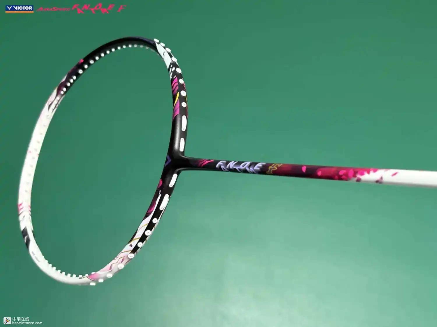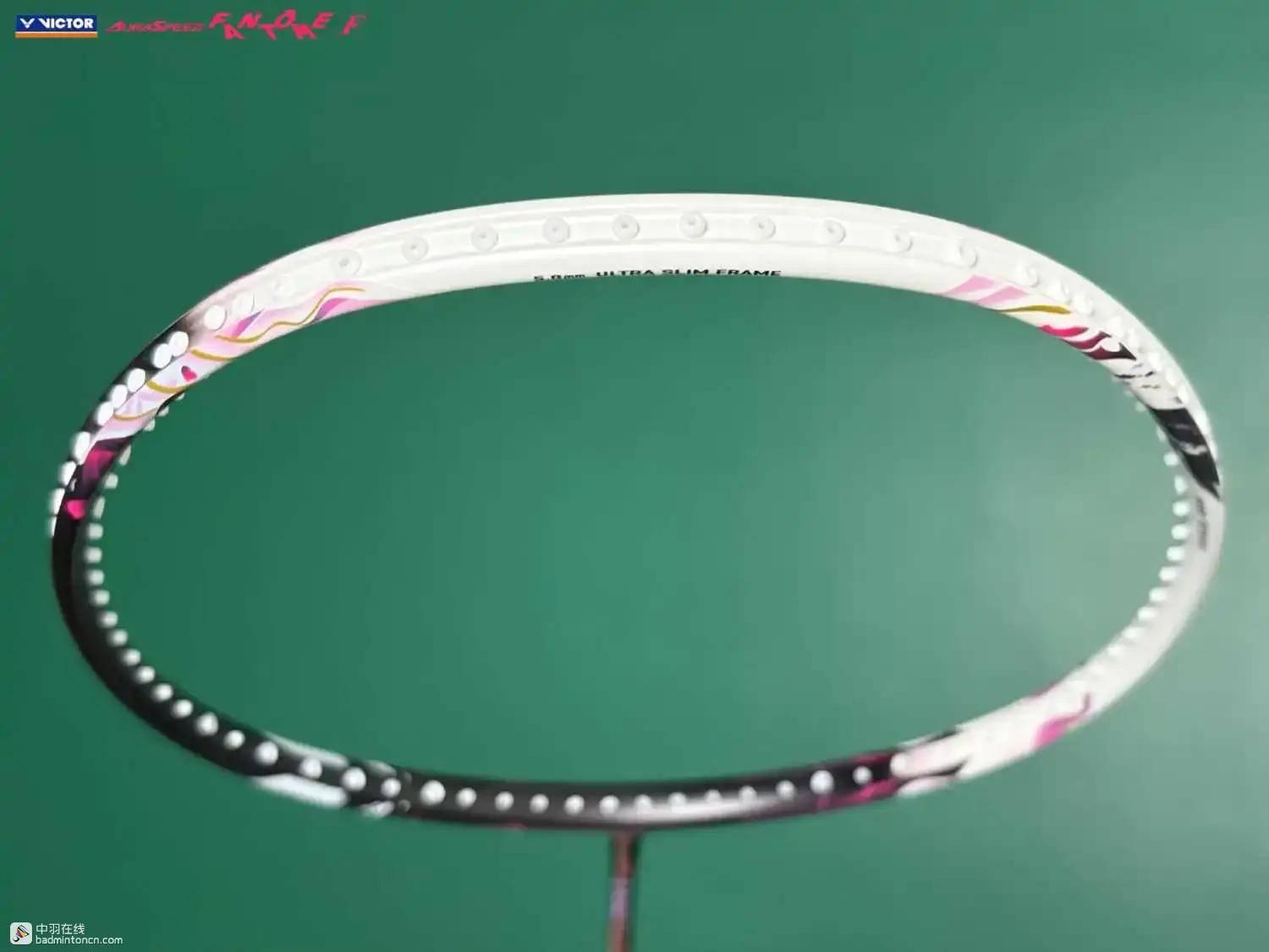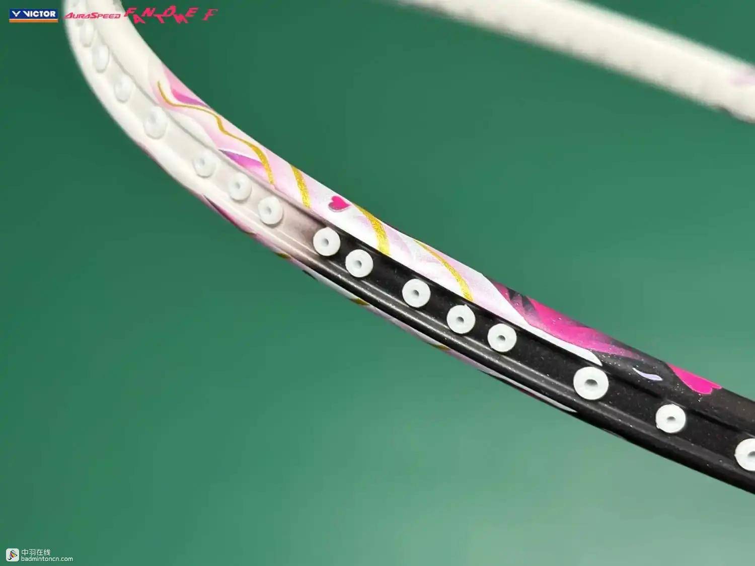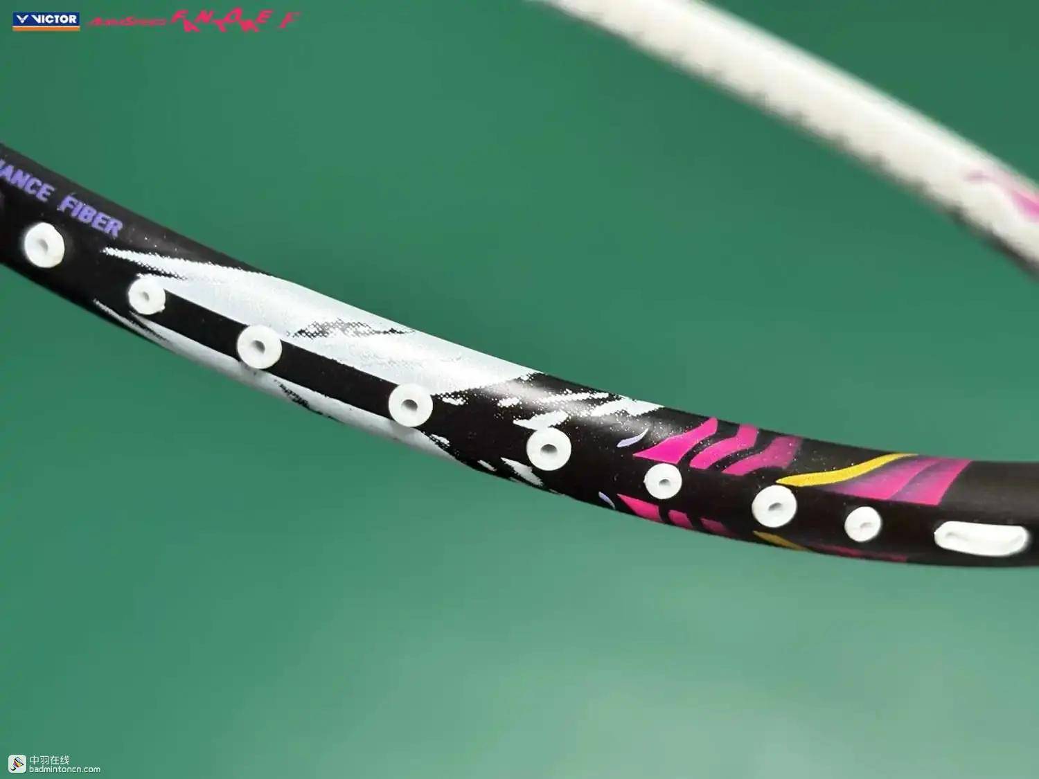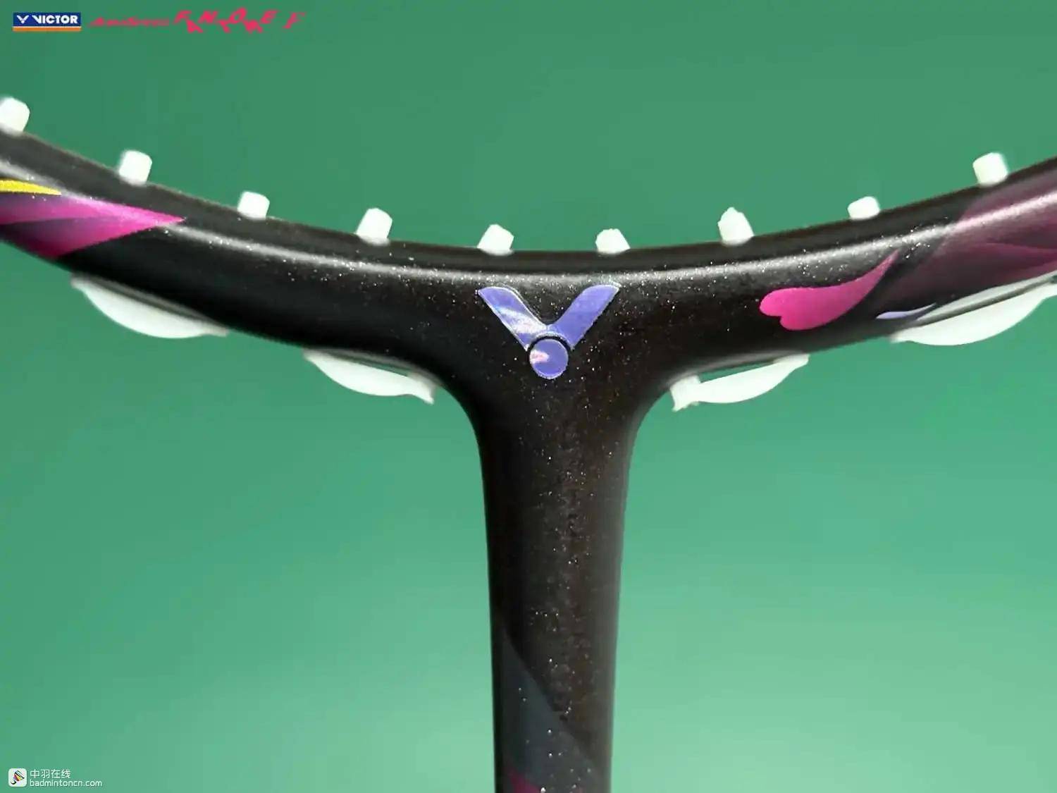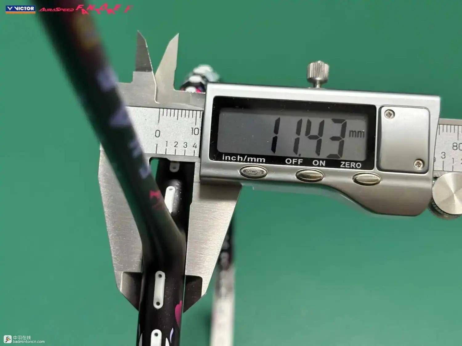 在图案设计上,ARS-影刃F也采用的是一种斜向的对应,左右来看,两边图案各是一种风格,以柔对刚;上下来看,也是如此。 在三通两侧,一侧以粉色配合柔和的线条,如飘动的丝带,在风中摇曳,再加上金色曲线的修饰,并点缀以爱心图案,温婉柔和,优雅丝滑,气质非凡。 而另一侧则是采用了截然不同的风格,三道玫红色的爪痕凸显出利刃般的凌厉感,神秘莫测。黑白相间类似泼墨的图案,展示了一种动若残影的速度感。 拍框上部的图案亦是同理,左右两部分的强烈对比正是ARS-影刃F涂装设计的耐人寻味之处,左右相对,一刚一柔,正如枝条密被利刺的玫瑰,虽表面娇柔,实则暗藏杀机。 ARS-影刃F的中杆由上部的黑色承接尾端的白色,过渡处采用大量玫瑰花瓣,两种色彩相互叠加,其中有的花瓣轮廓清晰,有的则采用模糊处理,似有远有近,有静有动,有虚有实,漫天飞花随风而舞,让人不由沁入那梦幻般的浪漫之中。 靠近三通处,影刃标志性的爪痕图案赫然呈现。 而影刃的英文字体醒目地印于中央,采用紫色,下方金色轮廓包围着紫宝石般的“F”字样。 T头中央的威克多LOGO水标同样采用了紫宝石质感的镭射表面处理。 总的来说,相较于ARS-影刃,ARS-影刃F在涂装的颜色选择、布局以及图案元素方面都有着较大的差异,颜色种类和图案细节都更为丰富。不过ARS-影刃F在原先的位置也保留了一些和ARS-影刃相对应的元素,例如中杆上型号名称的字体、拍框和中杆上的爪痕图案等等,也算是一种传承吧。 科技参数浅析 ARS-影刃F的规格为4U/G5,出厂即为空拍无底胶状态,去除热缩膜之后,重约77.13g,平衡点约为330mm。 上线(威克多VBS-61线,26磅)和手胶(缓震膜+威克多GR233手胶)之后,总重约为87.44g,平衡点则约为316mm。可以看到ARS-影刃F拥有非常高的平衡点,明显高于ARS-影刃,甚至比包括“龙牙家族”所有型号在内的威克多大部分球拍都要更高。 实测下,ARS-影刃F的拍身总长约为675mm,其中,拍框长度约252mm,中杆(锥盖顶部至T头两侧最下方线孔处)长度约215mm,手柄(底盖至锥盖顶部)则约为208mm。 相较于ARS-影刃,ARS-影刃F的拍框、中杆以及手柄长度都保持了一致。 ARS-影刃F延续了ARS-影刃的大拍面设计,同样采用76孔穿线模式。 二者的拍框宽度、形状也均相同。 在框型方面,ARS-影刃F亦传承了ARS-影刃的动力破风框(DYNAMIC-SWORD),拍框截面菱形结构根据位置不同有所区别,增大引导空气的截面积以提升挥速。 拍框左上(约10点和11点之间)、右上(约1点和2点之间)、左下(约7点和8点之间)、右下(约4点和5点之间)对称分布了四处浅凹槽,提升拍框的抗扭。 ARS-影刃F也继承了开创于ARS-影刃身上的薄翼拍框设计,拍框上的至薄处(即顶框12点位置附近)的厚度仅有5.0mm,对挥速的提升效果是非常可观的。 实测之下,ARS-影刃F拍框底部(靠近T头处)宽度实测约为11.43mm,厚度约为8.25mm。 拍框两侧(3点、9点钟方向)宽度则约为10.71mm,厚度约为5.81mm。 拍框顶部宽度约为10.82mm,厚度约为5.18mm。可见顶框的位置确实如参数所标注的那样,是非常纤薄的;而比笔者手中的ARS-影刃要厚了大约0.1至0.2mm的原因,除球拍制造和测量误差外,也有白色漆水一般比深色漆水更厚的因素。 此外,ARS-影刃F的拍框外侧采用线槽结构设计,线槽分布在上方的大半个拍框,比一般的半线槽要长,大约起始于4点和8点位置(由三通向上数第12和13个线孔之间)。 对比ARS-影刃F和ARS-影刃的线槽长度,可以看到二者也是相同的。 ARS-影刃F的拍框和ARS-影刃同样运用了纳米气凝胶(NANO AEROGEL),将其作为一种内发泡材料注入球拍框体,相比传统填充物更轻的它能够释放拍框的配重空间,让碳纤维在拍框上的用量得以增加,不仅能够使球拍更轻量,也使得拍框强度得到提升。 此外,拍框亦搭载强芯填充科技(HARD CORED TECHNOLOGY),提升拍框击球时的稳定性,保证出球的准确度。 ARS-影刃F采用6.6mm中杆,实际测量得中杆外径约为6.93mm(测量点位于中杆中点处)。 相比ARS-影刃的6.8mm中杆,ARS-影刃F的中杆更加纤细,更容易释放弹性;此外,ARS-影刃F在硬度方面也相较于ARS-影刃有所下调,更软弹的中杆有利于使用者更轻松地去发力。 中杆搭载标配的百洛碳素纤维(PYROFIL),保证出色的弹性性能。 另外,ARS-影刃F的中杆与拍框均导入PBO高性能纤维(PBO HIGH PERFORMANCE FIBER),航天级的强韧纤维材料,可大幅提升球拍整体的力量传导性能,使得球拍在保证重量不变的前提下亦兼备强韧度与舒适手感。 ARS-影刃F依然采用悬浮科技手柄,搭配半透明塑料锥盖及蓝色半透明底盖,锥盖内部无力量环结构,能够更充分地释放中杆摆动的自由度,让挥拍更流畅。 ARS-影刃F的建议穿线磅数为最高28磅,比同规格4U的ARS-影刃要低一磅。 上手体验详解 ARS-影刃F拥有非常显著的头重感,上手挥拍时,拍头的惯性明显,随挥感非常强烈,和5U规格的TK-龙牙MUSE有些许相似,这种平衡点很高的球拍现在相对来说不多,因此对于大部分球友来说,在初上手时可能需要一定的适应时间,尤其是在控球方面,较重的拍头增加了精确控制落点的难度,需要一个磨合的过程。 因为头重的缘故,ARS-影刃F的挥重明显大于ARS-影刃,而且中杆更软、更弹,更容易打出形变,总体头重杆软的特点使得其非常好上手,尤其是上手挥拍不用太多主动发力就能把球打出去,但同时击球后中杆的颤动感比ARS-影刃明显,出球的准确度相比ARS-影刃打了折扣,有时会感觉出球有些过于弹,失去了ARS-影