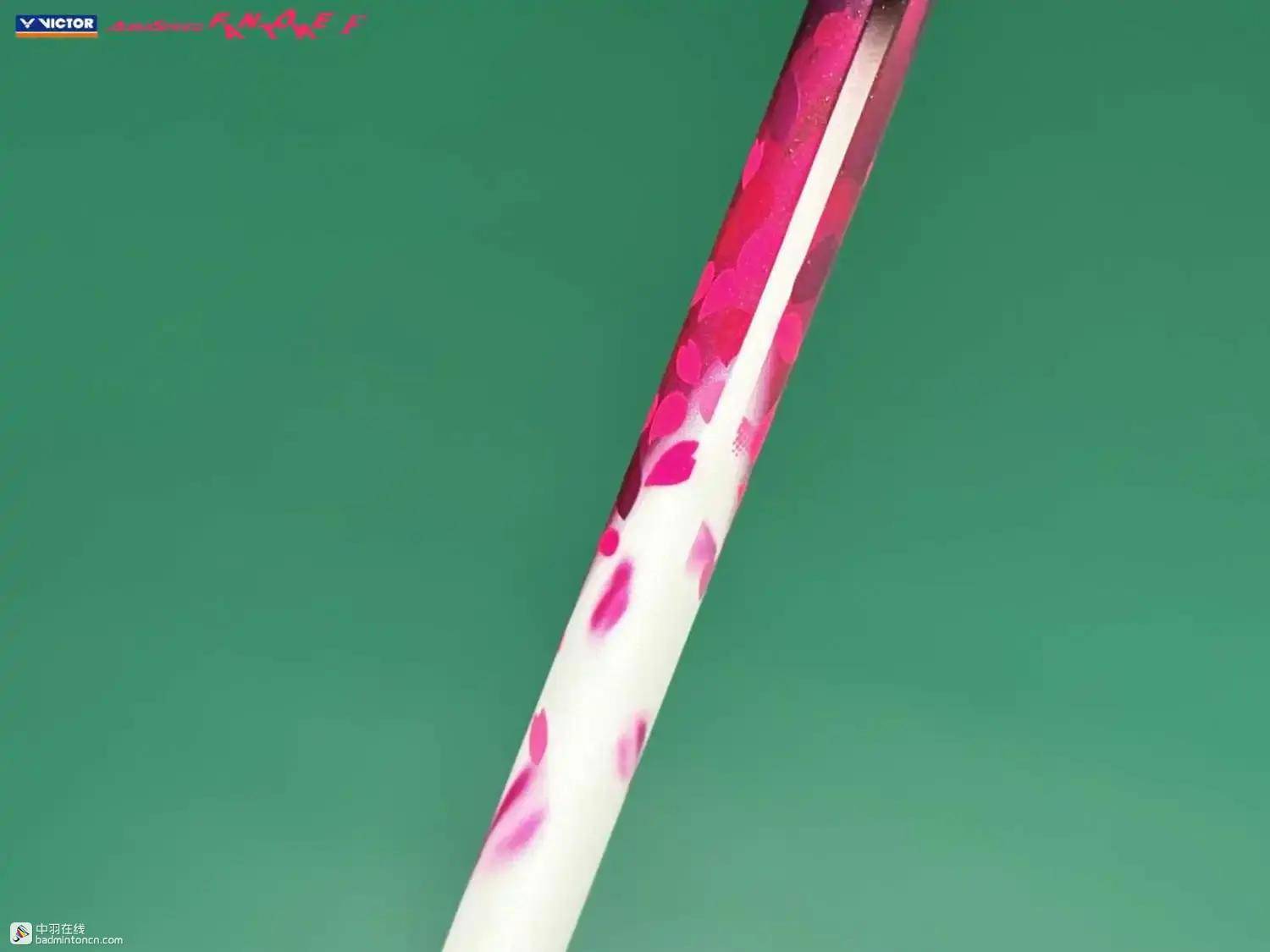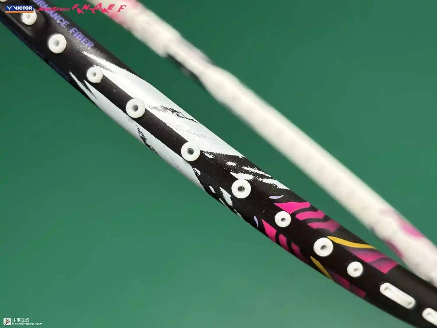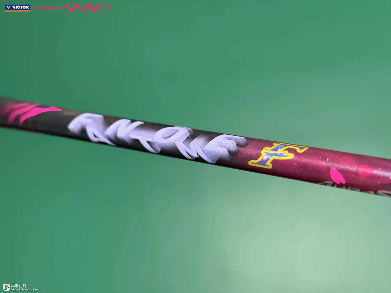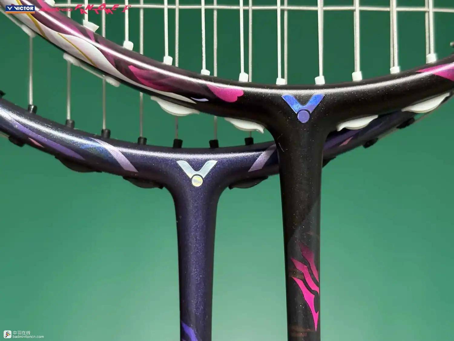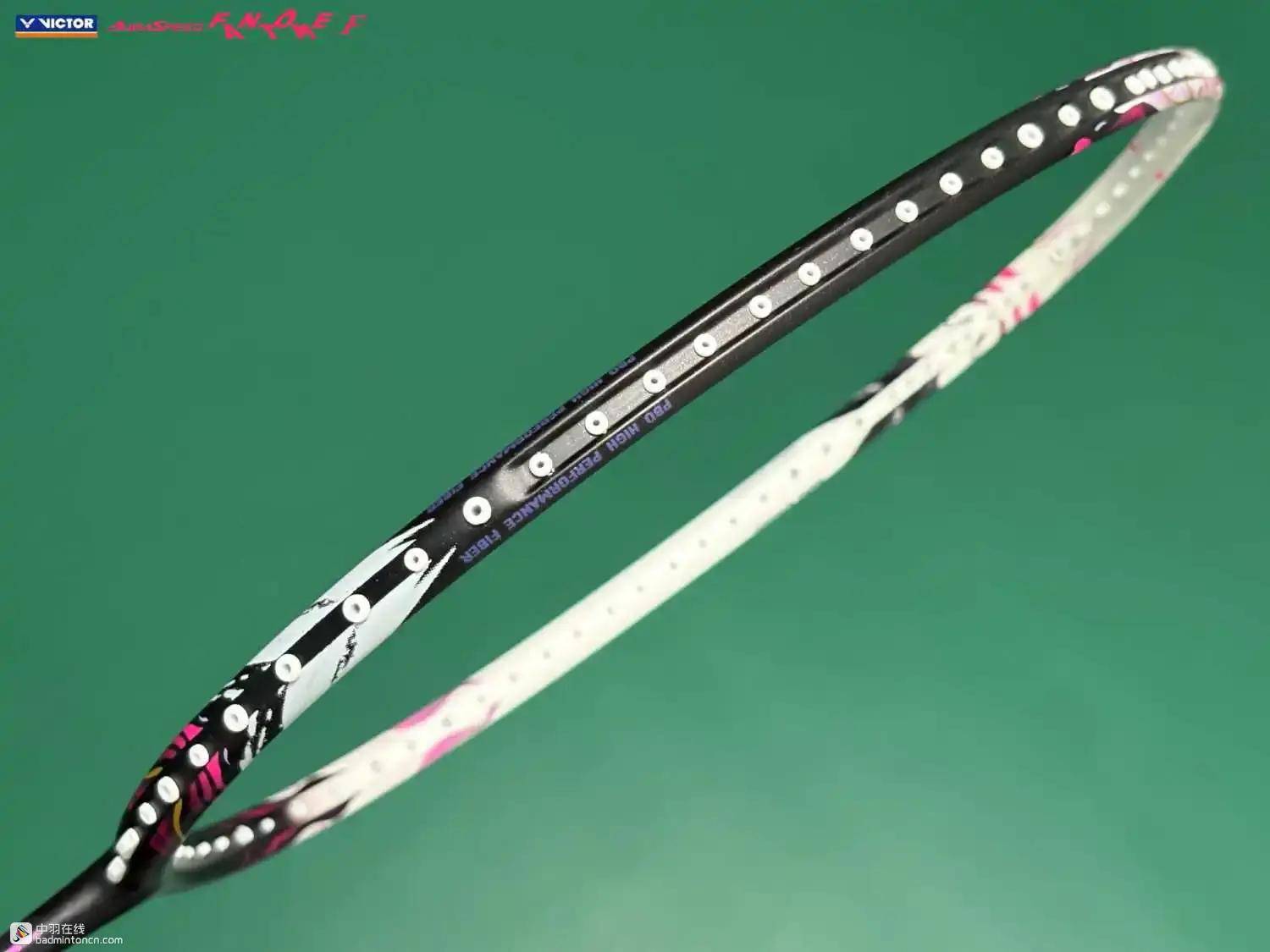 在图案设计上,ARS-影刃F也采用的是一种斜向的对应,左右来看,两边图案各是一种风格,以柔对刚;上下来看,也是如此。 在三通两侧,一侧以粉色配合柔和的线条,如飘动的丝带,在风中摇曳,再加上金色曲线的修饰,并点缀以爱心图案,温婉柔和,优雅丝滑,气质非凡。 而另一侧则是采用了截然不同的风格,三道玫红色的爪痕凸显出利刃般的凌厉感,神秘莫测。黑白相间类似泼墨的图案,展示了一种动若残影的速度感。 拍框上部的图案亦是同理,左右两部分的强烈对比正是ARS-影刃F涂装设计的耐人寻味之处,左右相对,一刚一柔,正如枝条密被利刺的玫瑰,虽表面娇柔,实则暗藏杀机。 ARS-影刃F的中杆由上部的黑色承接尾端的白色,过渡处采用大量玫瑰花瓣,两种色彩相互叠加,其中有的花瓣轮廓清晰,有的则采用模糊处理,似有远有近,有静有动,有虚有实,漫天飞花随风而舞,让人不由沁入那梦幻般的浪漫之中。 靠近三通处,影刃标志性的爪痕图案赫然呈现。 而影刃的英文字体醒目地印于中央,采用紫色,下方金色轮廓包围着紫宝石般的“F”字样。 T头中央的威克多LOGO水标同样采用了紫宝石质感的镭射表面处理。 总的来说,相较于ARS-影刃,ARS-影刃F在涂装的颜色选择、布局以及图案元素方面都有着较大的差异,颜色种类和图案细节都更为丰富。不过ARS-影刃F在原先的位置也保留了一些和ARS-影刃相对应的元素,例如中杆上型号名称的字体、拍框和中杆上的爪痕图案等等,也算是一种传承吧。 科技参数浅析 ARS-影刃F的规格为4U/G5,出厂即为空拍无底胶状态,去除热缩膜之后,重约77.13g,平衡点约为330mm。 上线(威克多VBS-61线,26磅)和手胶(缓震膜+威克多GR233手胶)之后,总重约为87.44g,平衡点则约为316mm。可以看到ARS-影刃F拥有非常高的平衡点,明显高于ARS-影刃,甚至比包括“龙牙家族”所有型号在内的威克多大部分球拍都要更高。 实测下,ARS-影刃F的拍身总长约为675mm,其中,拍框长度约252mm,中杆(锥盖顶部至T头两侧最下方线孔处)长度约215mm,手柄(底盖至锥盖顶部)则约为208mm。 相较于ARS-影刃,ARS-影刃F的拍框、中杆以及手柄长度都保持了一致。 ARS-影刃F延续了ARS-影刃的大拍面设计,同样采用76孔穿线模式。 二者的拍框宽度、形状也均相同。 在框型方面,ARS-影刃F亦传承了ARS-影刃的动力破风框(DYNAMIC-SWORD),拍框截面菱形结构根据位置不同有所区别,增大引导空气的截面积以提升挥速。 拍框左上(约10点和11点之间)、右上(约1点和2点之间)、左下(约7点和8点之间)、右下(约4点和5点之间)对称分布了四处浅凹槽,提升拍框的抗扭。 ARS-影刃F也继承了开创于ARS-影刃身上的薄翼拍框设计,拍框上的至薄处(即顶框12点位置附近)的厚度仅有5.0mm,对挥速的提升效果是非常可观的。 实测之下,ARS-影刃F拍框底部(靠近T头处)宽度实测约为11.43mm,厚度约为8.25mm。 拍框两侧(3点、9点钟方向)宽度则约为10.71mm,厚度约为5.81mm。 拍框顶部宽度约为10.82mm,厚度约为5.18mm。可见顶框的位置确实如参数所标注的那样,是非常纤薄的;而比笔者手中的ARS-影刃要厚了大约0.1至0.2mm的原因,除球拍制造和测量误差外,也有白色漆水一般比深色漆水更厚的因素。 此外,ARS-影刃F的拍框外侧采用线槽结构设计,线槽分布在上方的大半个拍框,比一般的半线槽要长,大约起始于4点和8点位置(由三通向上数第12和13个线孔之间)。 对比ARS-影刃F和ARS-影刃的线槽长度,可以看到二者也是相同的。 ARS-影刃F的拍框和ARS-影刃同样运用了纳米气凝胶(NANO AEROGEL),将其作为一种内发泡材料注入球拍框体,相比传统填充物更轻的它能够释放拍框的配重空间,让碳纤维在拍框上的用量得以增加,不仅能够使球拍更轻量,也使得拍框强度得到提升。 此外,拍框亦搭载强芯填充科技(HARD CORED TECHNOLOGY),提升拍框击球时的稳定性,保证出球的准确度。 ARS-影刃F采用6.6mm中杆,实际测量得中杆外径约为6.93mm(测量点位于中杆中点处)。 相比ARS-影刃的6.8mm中杆,ARS-影刃F的中杆更加纤细,更容易释放弹性;此外,ARS-影刃F在硬度方面也相较于ARS-影刃有所下调,更软弹的中杆有利于使用者更轻松地去发力。 中杆搭载标配的百洛碳素纤维(PYROFIL),保证出色的弹性性能。 另外,ARS-影刃F的中杆与拍框均导入PBO高性能纤维(PBO HIGH PERFORMANCE FIBER),航天级的强韧纤维材料,可大幅提升球拍整体的力量传导性能,使得球拍在保证重量不变的前提下亦兼备强韧度与舒适手感。 ARS-影刃F依然采用悬浮科技手柄,搭配半透明塑料锥盖及蓝色半透明底盖,锥盖内部无力量环结构,能够更充分地释放中杆摆动的自由度,让挥拍更流畅。 ARS-影刃F的建议穿线磅数为最高28磅,比同规格4U的ARS-影刃要低一磅。 上手体验详解 ARS-影刃F拥有非常显著的头重感,上手挥拍时,拍头的惯性明显,随挥感非常强烈,和5U规格的TK-龙牙MUSE有些许相似,这种平衡点很高的球拍现在相对来说不多,因此对于大部分球友来说,在初上手时可能需要一定的适应时间,尤其是在控球方面,较重的拍头增加了精确控制落点的难度,需要一个磨合的过程。 因为头重的缘故,ARS-影刃F的挥重明显大于ARS-影刃,而且中杆更软、更弹,更容易打出形变,总体头重杆软的特点使得其非常好上手,尤其是上手挥拍不用太多主动发力就能把球打出去,但同时击球后中杆的颤动感比ARS-影刃明显,出球的准确度相比ARS-影刃打了折扣,有时会感觉出球有些过于弹,失去了ARS-影