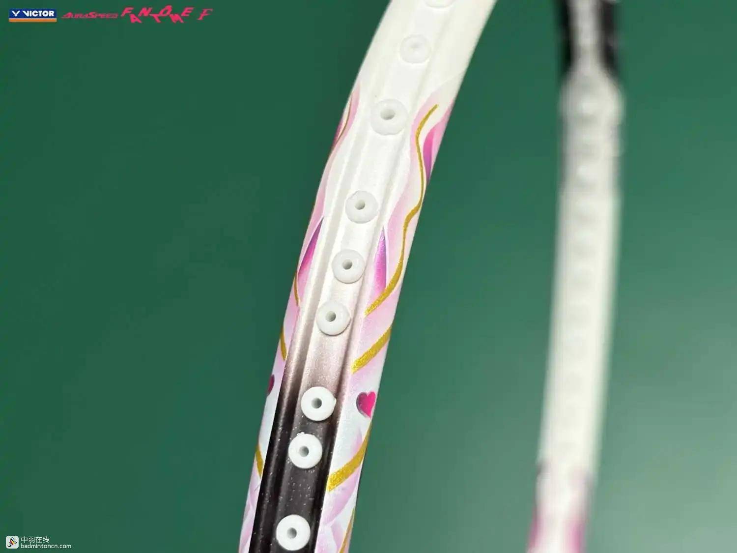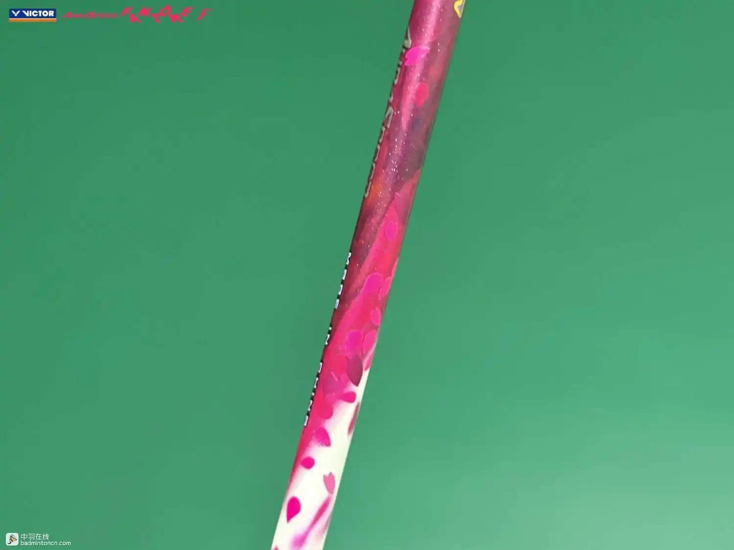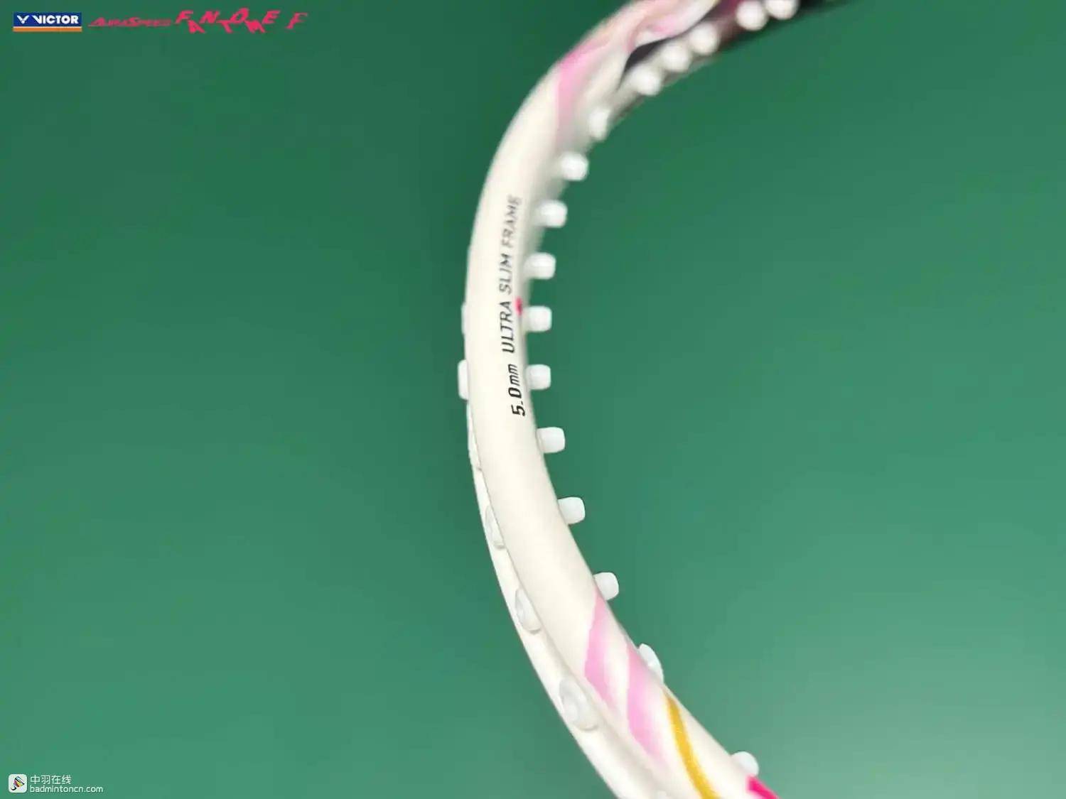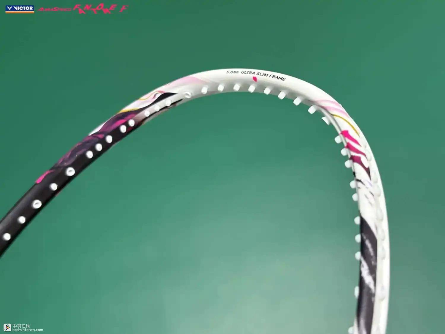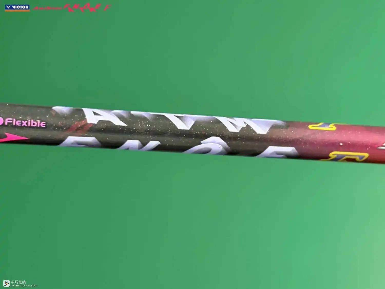 在图案设计上,ARS-影刃F也采用的是一种斜向的对应,左右来看,两边图案各是一种风格,以柔对刚;上下来看,也是如此。 在三通两侧,一侧以粉色配合柔和的线条,如飘动的丝带,在风中摇曳,再加上金色曲线的修饰,并点缀以爱心图案,温婉柔和,优雅丝滑,气质非凡。 而另一侧则是采用了截然不同的风格,三道玫红色的爪痕凸显出利刃般的凌厉感,神秘莫测。黑白相间类似泼墨的图案,展示了一种动若残影的速度感。 拍框上部的图案亦是同理,左右两部分的强烈对比正是ARS-影刃F涂装设计的耐人寻味之处,左右相对,一刚一柔,正如枝条密被利刺的玫瑰,虽表面娇柔,实则暗藏杀机。 ARS-影刃F的中杆由上部的黑色承接尾端的白色,过渡处采用大量玫瑰花瓣,两种色彩相互叠加,其中有的花瓣轮廓清晰,有的则采用模糊处理,似有远有近,有静有动,有虚有实,漫天飞花随风而舞,让人不由沁入那梦幻般的浪漫之中。 靠近三通处,影刃标志性的爪痕图案赫然呈现。 而影刃的英文字体醒目地印于中央,采用紫色,下方金色轮廓包围着紫宝石般的“F”字样。 T头中央的威克多LOGO水标同样采用了紫宝石质感的镭射表面处理。 总的来说,相较于ARS-影刃,ARS-影刃F在涂装的颜色选择、布局以及图案元素方面都有着较大的差异,颜色种类和图案细节都更为丰富。不过ARS-影刃F在原先的位置也保留了一些和ARS-影刃相对应的元素,例如中杆上型号名称的字体、拍框和中杆上的爪痕图案等等,也算是一种传承吧。 科技参数浅析 ARS-影刃F的规格为4U/G5,出厂即为空拍无底胶状态,去除热缩膜之后,重约77.13g,平衡点约为330mm。 上线(威克多VBS-61线,26磅)和手胶(缓震膜+威克多GR233手胶)之后,总重约为87.44g,平衡点则约为316mm。可以看到ARS-影刃F拥有非常高的平衡点,明显高于ARS-影刃,甚至比包括“龙牙家族”所有型号在内的威克多大部分球拍都要更高。 实测下,ARS-影刃F的拍身总长约为675mm,其中,拍框长度约252mm,中杆(锥盖顶部至T头两侧最下方线孔处)长度约215mm,手柄(底盖至锥盖顶部)则约为208mm。 相较于ARS-影刃,ARS-影刃F的拍框、中杆以及手柄长度都保持了一致。 ARS-影刃F延续了ARS-影刃的大拍面设计,同样采用76孔穿线模式。 二者的拍框宽度、形状也均相同。 在框型方面,ARS-影刃F亦传承了ARS-影刃的动力破风框(DYNAMIC-SWORD),拍框截面菱形结构根据位置不同有所区别,增大引导空气的截面积以提升挥速。 拍框左上(约10点和11点之间)、右上(约1点和2点之间)、左下(约7点和8点之间)、右下(约4点和5点之间)对称分布了四处浅凹槽,提升拍框的抗扭。 ARS-影刃F也继承了开创于ARS-影刃身上的薄翼拍框设计,拍框上的至薄处(即顶框12点位置附近)的厚度仅有5.0mm,对挥速的提升效果是非常可观的。 实测之下,ARS-影刃F拍框底部(靠近T头处)宽度实测约为11.43mm,厚度约为8.25mm。 拍框两侧(3点、9点钟方向)宽度则约为10.71mm,厚度约为5.81mm。 拍框顶部宽度约为10.82mm,厚度约为5.18mm。可见顶框的位置确实如参数所标注的那样,是非常纤薄的;而比笔者手中的ARS-影刃要厚了大约0.1至0.2mm的原因,除球拍制造和测量误差外,也有白色漆水一般比深色漆水更厚的因素。 此外,ARS-影刃F的拍框外侧采用线槽结构设计,线槽分布在上方的大半个拍框,比一般的半线槽要长,大约起始于4点和8点位置(由三通向上数第12和13个线孔之间)。 对比ARS-影刃F和ARS-影刃的线槽长度,可以看到二者也是相同的。 ARS-影刃F的拍框和ARS-影刃同样运用了纳米气凝胶(NANO AEROGEL),将其作为一种内发泡材料注入球拍框体,相比传统填充物更轻的它能够释放拍框的配重空间,让碳纤维在拍框上的用量得以增加,不仅能够使球拍更轻量,也使得拍框强度得到提升。 此外,拍框亦搭载强芯填充科技(HARD CORED TECHNOLOGY),提升拍框击球时的稳定性,保证出球的准确度。 ARS-影刃F采用6.6mm中杆,实际测量得中杆外径约为6.93mm(测量点位于中杆中点处)。 相比ARS-影刃的6.8mm中杆,ARS-影刃F的中杆更加纤细,更容易释放弹性;此外,ARS-影刃F在硬度方面也相较于ARS-影刃有所下调,更软弹的中杆有利于使用者更轻松地去发力。 中杆搭载标配的百洛碳素纤维(PYROFIL),保证出色的弹性性能。 另外,ARS-影刃F的中杆与拍框均导入PBO高性能纤维(PBO HIGH PERFORMANCE FIBER),航天级的强韧纤维材料,可大幅提升球拍整体的力量传导性能,使得球拍在保证重量不变的前提下亦兼备强韧度与舒适手感。 ARS-影刃F依然采用悬浮科技手柄,搭配半透明塑料锥盖及蓝色半透明底盖,锥盖内部无力量环结构,能够更充分地释放中杆摆动的自由度,让挥拍更流畅。 ARS-影刃F的建议穿线磅数为最高28磅,比同规格4U的ARS-影刃要低一磅。 上手体验详解 ARS-影刃F拥有非常显著的头重感,上手挥拍时,拍头的惯性明显,随挥感非常强烈,和5U规格的TK-龙牙MUSE有些许相似,这种平衡点很高的球拍现在相对来说不多,因此对于大部分球友来说,在初上手时可能需要一定的适应时间,尤其是在控球方面,较重的拍头增加了精确控制落点的难度,需要一个磨合的过程。 因为头重的缘故,ARS-影刃F的挥重明显大于ARS-影刃,而且中杆更软、更弹,更容易打出形变,总体头重杆软的特点使得其非常好上手,尤其是上手挥拍不用太多主动发力就能把球打出去,但同时击球后中杆的颤动感比ARS-影刃明显,出球的准确度相比ARS-影刃打了折扣,有时会感觉出球有些过于弹,失去了ARS-影