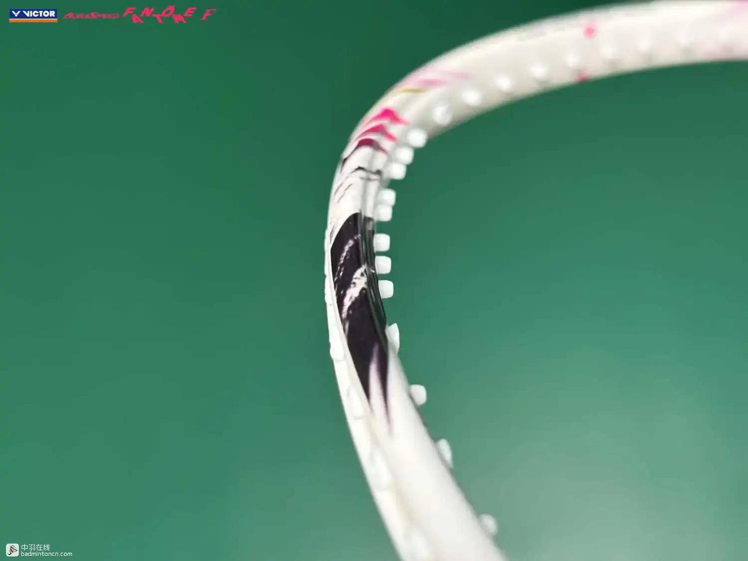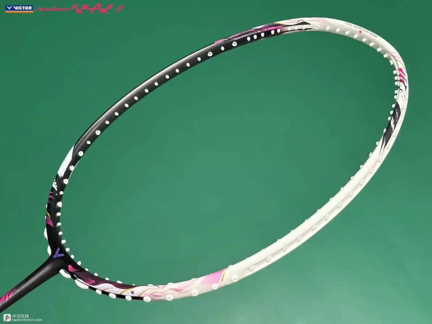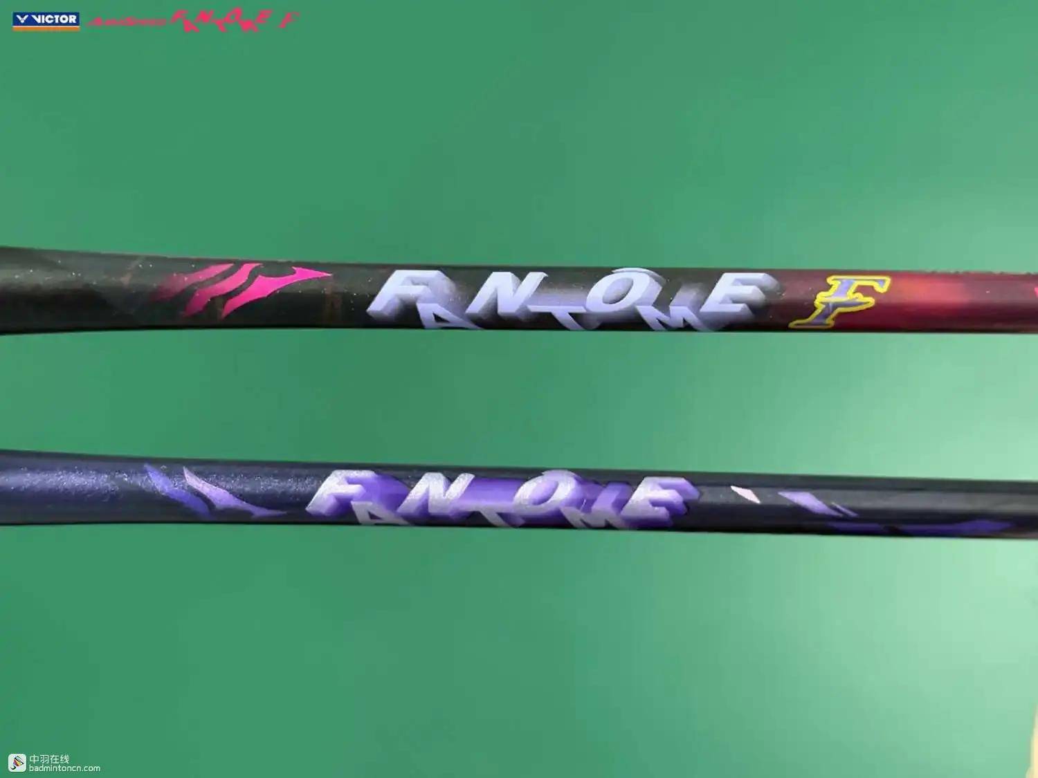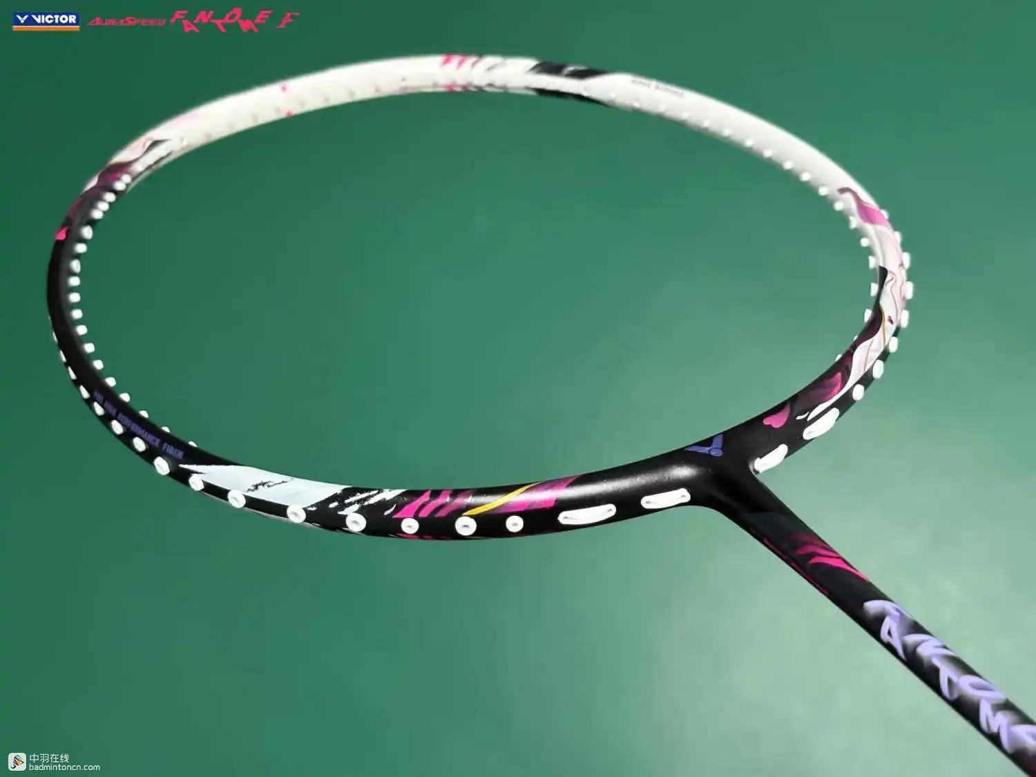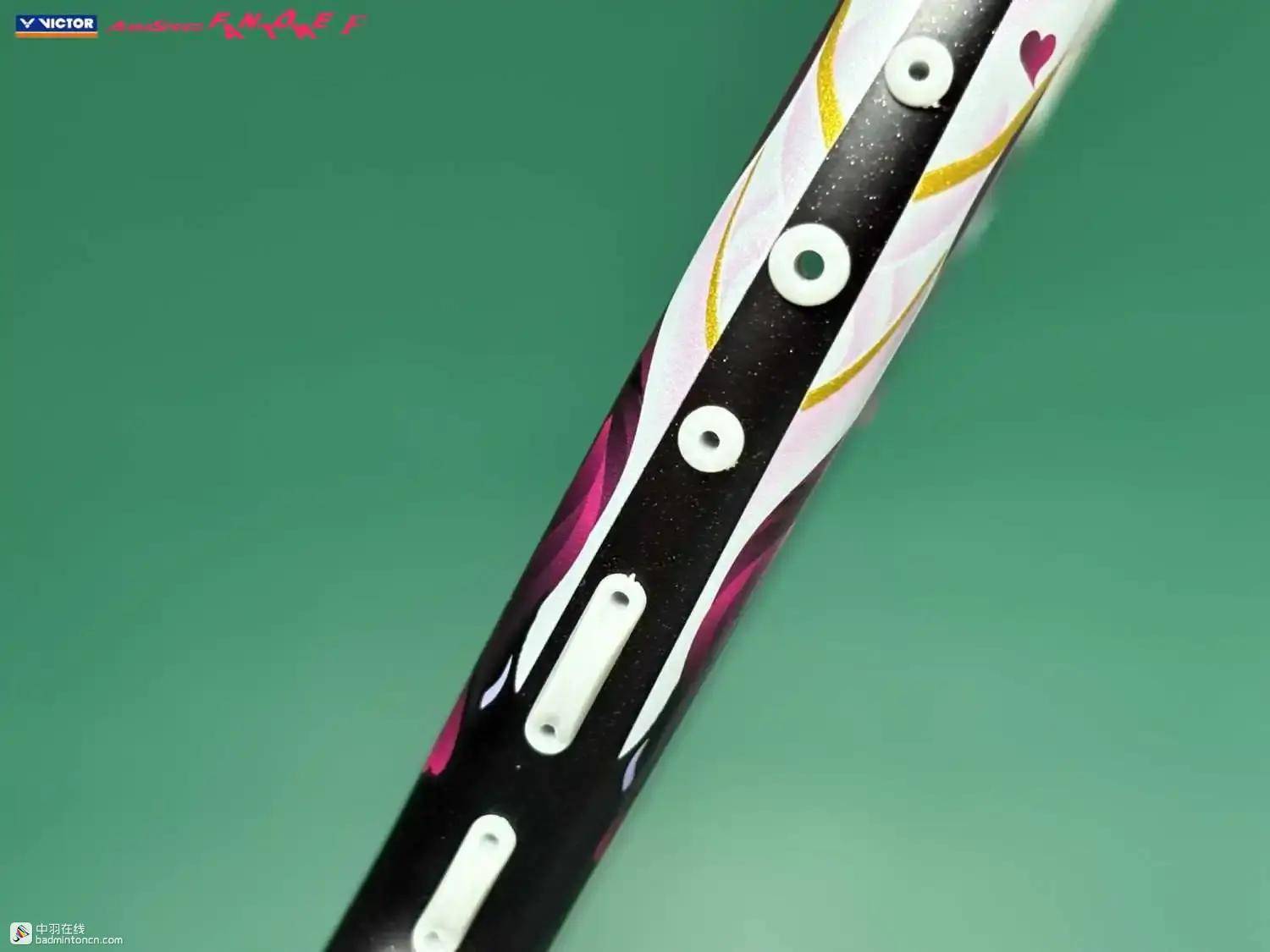 在图案设计上,ARS-影刃F也采用的是一种斜向的对应,左右来看,两边图案各是一种风格,以柔对刚;上下来看,也是如此。 在三通两侧,一侧以粉色配合柔和的线条,如飘动的丝带,在风中摇曳,再加上金色曲线的修饰,并点缀以爱心图案,温婉柔和,优雅丝滑,气质非凡。 而另一侧则是采用了截然不同的风格,三道玫红色的爪痕凸显出利刃般的凌厉感,神秘莫测。黑白相间类似泼墨的图案,展示了一种动若残影的速度感。 拍框上部的图案亦是同理,左右两部分的强烈对比正是ARS-影刃F涂装设计的耐人寻味之处,左右相对,一刚一柔,正如枝条密被利刺的玫瑰,虽表面娇柔,实则暗藏杀机。 ARS-影刃F的中杆由上部的黑色承接尾端的白色,过渡处采用大量玫瑰花瓣,两种色彩相互叠加,其中有的花瓣轮廓清晰,有的则采用模糊处理,似有远有近,有静有动,有虚有实,漫天飞花随风而舞,让人不由沁入那梦幻般的浪漫之中。 靠近三通处,影刃标志性的爪痕图案赫然呈现。 而影刃的英文字体醒目地印于中央,采用紫色,下方金色轮廓包围着紫宝石般的“F”字样。 T头中央的威克多LOGO水标同样采用了紫宝石质感的镭射表面处理。 总的来说,相较于ARS-影刃,ARS-影刃F在涂装的颜色选择、布局以及图案元素方面都有着较大的差异,颜色种类和图案细节都更为丰富。不过ARS-影刃F在原先的位置也保留了一些和ARS-影刃相对应的元素,例如中杆上型号名称的字体、拍框和中杆上的爪痕图案等等,也算是一种传承吧。 科技参数浅析 ARS-影刃F的规格为4U/G5,出厂即为空拍无底胶状态,去除热缩膜之后,重约77.13g,平衡点约为330mm。 上线(威克多VBS-61线,26磅)和手胶(缓震膜+威克多GR233手胶)之后,总重约为87.44g,平衡点则约为316mm。可以看到ARS-影刃F拥有非常高的平衡点,明显高于ARS-影刃,甚至比包括“龙牙家族”所有型号在内的威克多大部分球拍都要更高。 实测下,ARS-影刃F的拍身总长约为675mm,其中,拍框长度约252mm,中杆(锥盖顶部至T头两侧最下方线孔处)长度约215mm,手柄(底盖至锥盖顶部)则约为208mm。 相较于ARS-影刃,ARS-影刃F的拍框、中杆以及手柄长度都保持了一致。 ARS-影刃F延续了ARS-影刃的大拍面设计,同样采用76孔穿线模式。 二者的拍框宽度、形状也均相同。 在框型方面,ARS-影刃F亦传承了ARS-影刃的动力破风框(DYNAMIC-SWORD),拍框截面菱形结构根据位置不同有所区别,增大引导空气的截面积以提升挥速。 拍框左上(约10点和11点之间)、右上(约1点和2点之间)、左下(约7点和8点之间)、右下(约4点和5点之间)对称分布了四处浅凹槽,提升拍框的抗扭。 ARS-影刃F也继承了开创于ARS-影刃身上的薄翼拍框设计,拍框上的至薄处(即顶框12点位置附近)的厚度仅有5.0mm,对挥速的提升效果是非常可观的。 实测之下,ARS-影刃F拍框底部(靠近T头处)宽度实测约为11.43mm,厚度约为8.25mm。 拍框两侧(3点、9点钟方向)宽度则约为10.71mm,厚度约为5.81mm。 拍框顶部宽度约为10.82mm,厚度约为5.18mm。可见顶框的位置确实如参数所标注的那样,是非常纤薄的;而比笔者手中的ARS-影刃要厚了大约0.1至0.2mm的原因,除球拍制造和测量误差外,也有白色漆水一般比深色漆水更厚的因素。 此外,ARS-影刃F的拍框外侧采用线槽结构设计,线槽分布在上方的大半个拍框,比一般的半线槽要长,大约起始于4点和8点位置(由三通向上数第12和13个线孔之间)。 对比ARS-影刃F和ARS-影刃的线槽长度,可以看到二者也是相同的。 ARS-影刃F的拍框和ARS-影刃同样运用了纳米气凝胶(NANO AEROGEL),将其作为一种内发泡材料注入球拍框体,相比传统填充物更轻的它能够释放拍框的配重空间,让碳纤维在拍框上的用量得以增加,不仅能够使球拍更轻量,也使得拍框强度得到提升。 此外,拍框亦搭载强芯填充科技(HARD CORED TECHNOLOGY),提升拍框击球时的稳定性,保证出球的准确度。 ARS-影刃F采用6.6mm中杆,实际测量得中杆外径约为6.93mm(测量点位于中杆中点处)。 相比ARS-影刃的6.8mm中杆,ARS-影刃F的中杆更加纤细,更容易释放弹性;此外,ARS-影刃F在硬度方面也相较于ARS-影刃有所下调,更软弹的中杆有利于使用者更轻松地去发力。 中杆搭载标配的百洛碳素纤维(PYROFIL),保证出色的弹性性能。 另外,ARS-影刃F的中杆与拍框均导入PBO高性能纤维(PBO HIGH PERFORMANCE FIBER),航天级的强韧纤维材料,可大幅提升球拍整体的力量传导性能,使得球拍在保证重量不变的前提下亦兼备强韧度与舒适手感。 ARS-影刃F依然采用悬浮科技手柄,搭配半透明塑料锥盖及蓝色半透明底盖,锥盖内部无力量环结构,能够更充分地释放中杆摆动的自由度,让挥拍更流畅。 ARS-影刃F的建议穿线磅数为最高28磅,比同规格4U的ARS-影刃要低一磅。 上手体验详解 ARS-影刃F拥有非常显著的头重感,上手挥拍时,拍头的惯性明显,随挥感非常强烈,和5U规格的TK-龙牙MUSE有些许相似,这种平衡点很高的球拍现在相对来说不多,因此对于大部分球友来说,在初上手时可能需要一定的适应时间,尤其是在控球方面,较重的拍头增加了精确控制落点的难度,需要一个磨合的过程。 因为头重的缘故,ARS-影刃F的挥重明显大于ARS-影刃,而且中杆更软、更弹,更容易打出形变,总体头重杆软的特点使得其非常好上手,尤其是上手挥拍不用太多主动发力就能把球打出去,但同时击球后中杆的颤动感比ARS-影刃明显,出球的准确度相比ARS-影刃打了折扣,有时会感觉出球有些过于弹,失去了ARS-影