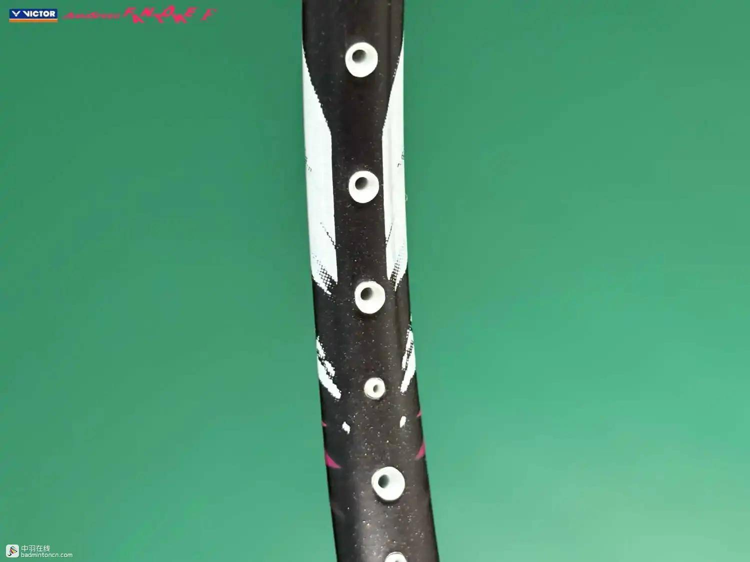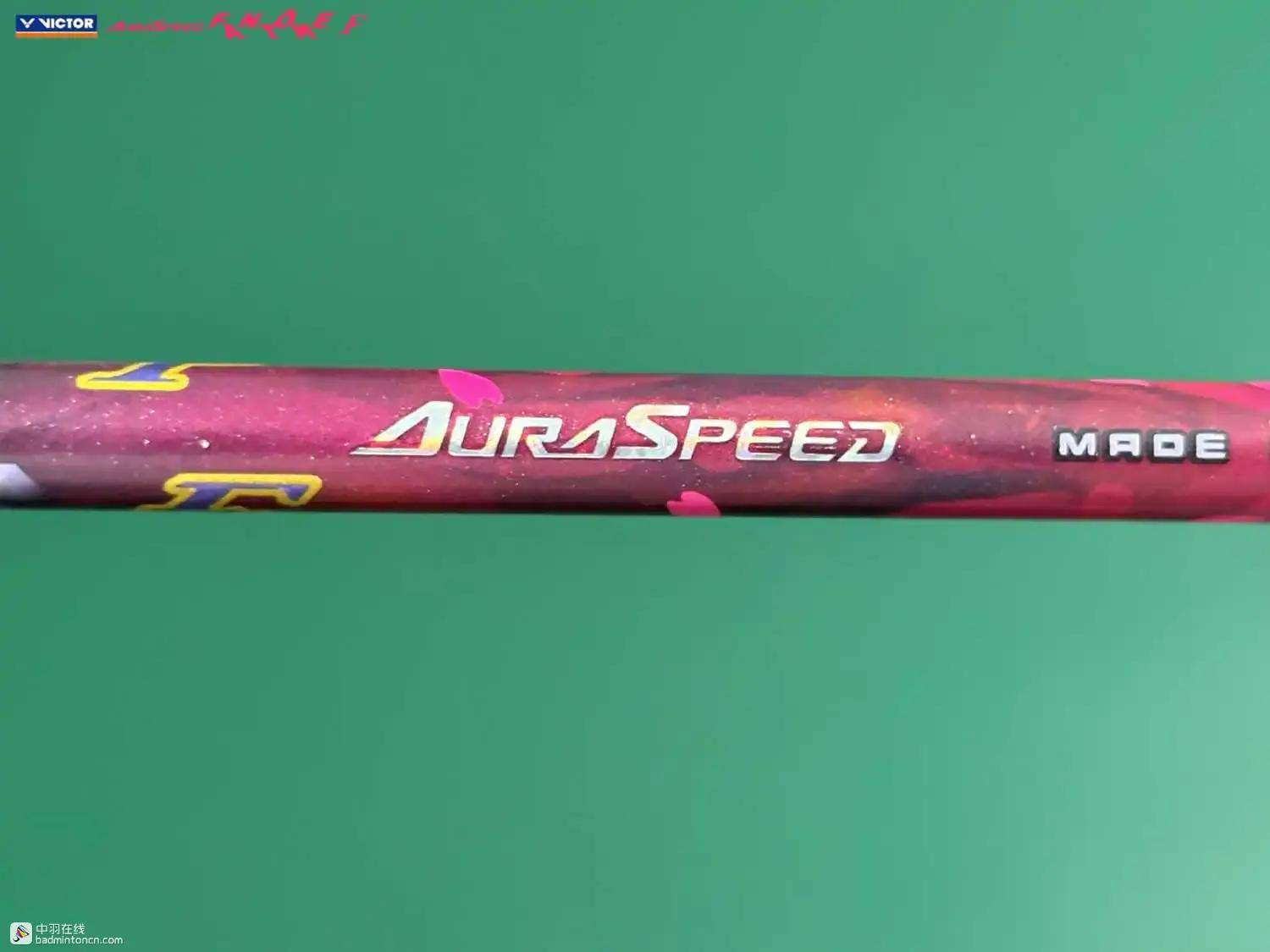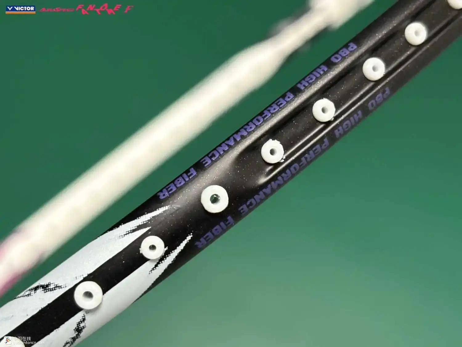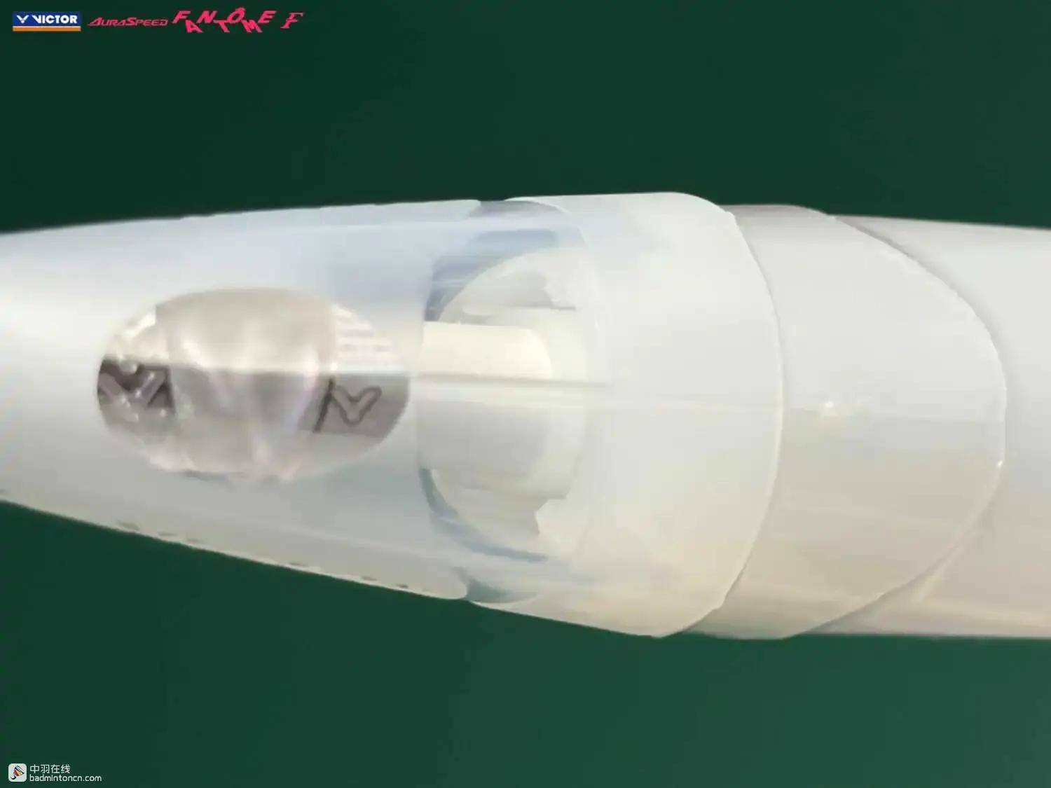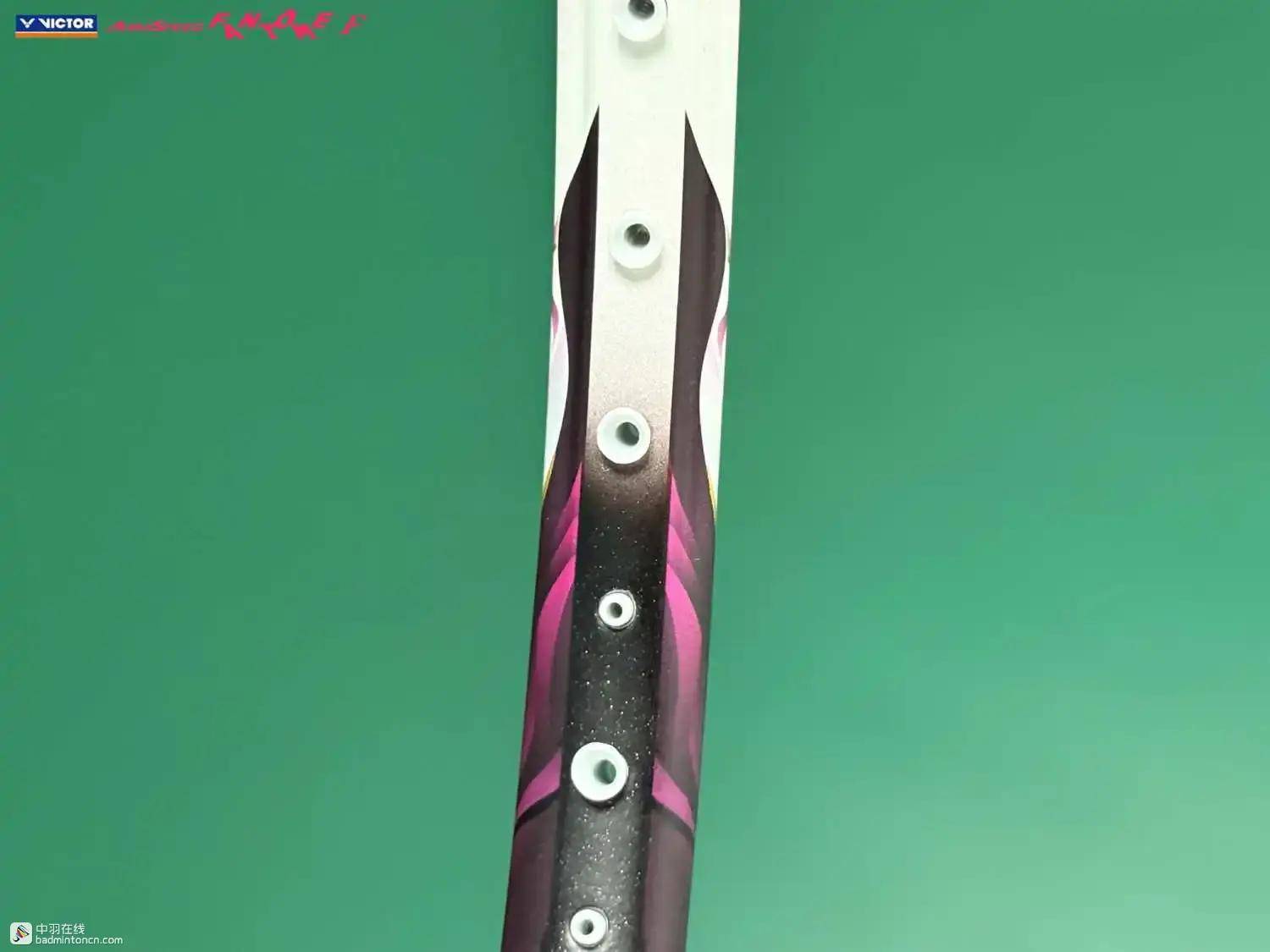 在图案设计上,ARS-影刃F也采用的是一种斜向的对应,左右来看,两边图案各是一种风格,以柔对刚;上下来看,也是如此。 在三通两侧,一侧以粉色配合柔和的线条,如飘动的丝带,在风中摇曳,再加上金色曲线的修饰,并点缀以爱心图案,温婉柔和,优雅丝滑,气质非凡。 而另一侧则是采用了截然不同的风格,三道玫红色的爪痕凸显出利刃般的凌厉感,神秘莫测。黑白相间类似泼墨的图案,展示了一种动若残影的速度感。 拍框上部的图案亦是同理,左右两部分的强烈对比正是ARS-影刃F涂装设计的耐人寻味之处,左右相对,一刚一柔,正如枝条密被利刺的玫瑰,虽表面娇柔,实则暗藏杀机。 ARS-影刃F的中杆由上部的黑色承接尾端的白色,过渡处采用大量玫瑰花瓣,两种色彩相互叠加,其中有的花瓣轮廓清晰,有的则采用模糊处理,似有远有近,有静有动,有虚有实,漫天飞花随风而舞,让人不由沁入那梦幻般的浪漫之中。 靠近三通处,影刃标志性的爪痕图案赫然呈现。 而影刃的英文字体醒目地印于中央,采用紫色,下方金色轮廓包围着紫宝石般的“F”字样。 T头中央的威克多LOGO水标同样采用了紫宝石质感的镭射表面处理。 总的来说,相较于ARS-影刃,ARS-影刃F在涂装的颜色选择、布局以及图案元素方面都有着较大的差异,颜色种类和图案细节都更为丰富。不过ARS-影刃F在原先的位置也保留了一些和ARS-影刃相对应的元素,例如中杆上型号名称的字体、拍框和中杆上的爪痕图案等等,也算是一种传承吧。 科技参数浅析 ARS-影刃F的规格为4U/G5,出厂即为空拍无底胶状态,去除热缩膜之后,重约77.13g,平衡点约为330mm。 上线(威克多VBS-61线,26磅)和手胶(缓震膜+威克多GR233手胶)之后,总重约为87.44g,平衡点则约为316mm。可以看到ARS-影刃F拥有非常高的平衡点,明显高于ARS-影刃,甚至比包括“龙牙家族”所有型号在内的威克多大部分球拍都要更高。 实测下,ARS-影刃F的拍身总长约为675mm,其中,拍框长度约252mm,中杆(锥盖顶部至T头两侧最下方线孔处)长度约215mm,手柄(底盖至锥盖顶部)则约为208mm。 相较于ARS-影刃,ARS-影刃F的拍框、中杆以及手柄长度都保持了一致。 ARS-影刃F延续了ARS-影刃的大拍面设计,同样采用76孔穿线模式。 二者的拍框宽度、形状也均相同。 在框型方面,ARS-影刃F亦传承了ARS-影刃的动力破风框(DYNAMIC-SWORD),拍框截面菱形结构根据位置不同有所区别,增大引导空气的截面积以提升挥速。 拍框左上(约10点和11点之间)、右上(约1点和2点之间)、左下(约7点和8点之间)、右下(约4点和5点之间)对称分布了四处浅凹槽,提升拍框的抗扭。 ARS-影刃F也继承了开创于ARS-影刃身上的薄翼拍框设计,拍框上的至薄处(即顶框12点位置附近)的厚度仅有5.0mm,对挥速的提升效果是非常可观的。 实测之下,ARS-影刃F拍框底部(靠近T头处)宽度实测约为11.43mm,厚度约为8.25mm。 拍框两侧(3点、9点钟方向)宽度则约为10.71mm,厚度约为5.81mm。 拍框顶部宽度约为10.82mm,厚度约为5.18mm。可见顶框的位置确实如参数所标注的那样,是非常纤薄的;而比笔者手中的ARS-影刃要厚了大约0.1至0.2mm的原因,除球拍制造和测量误差外,也有白色漆水一般比深色漆水更厚的因素。 此外,ARS-影刃F的拍框外侧采用线槽结构设计,线槽分布在上方的大半个拍框,比一般的半线槽要长,大约起始于4点和8点位置(由三通向上数第12和13个线孔之间)。 对比ARS-影刃F和ARS-影刃的线槽长度,可以看到二者也是相同的。 ARS-影刃F的拍框和ARS-影刃同样运用了纳米气凝胶(NANO AEROGEL),将其作为一种内发泡材料注入球拍框体,相比传统填充物更轻的它能够释放拍框的配重空间,让碳纤维在拍框上的用量得以增加,不仅能够使球拍更轻量,也使得拍框强度得到提升。 此外,拍框亦搭载强芯填充科技(HARD CORED TECHNOLOGY),提升拍框击球时的稳定性,保证出球的准确度。 ARS-影刃F采用6.6mm中杆,实际测量得中杆外径约为6.93mm(测量点位于中杆中点处)。 相比ARS-影刃的6.8mm中杆,ARS-影刃F的中杆更加纤细,更容易释放弹性;此外,ARS-影刃F在硬度方面也相较于ARS-影刃有所下调,更软弹的中杆有利于使用者更轻松地去发力。 中杆搭载标配的百洛碳素纤维(PYROFIL),保证出色的弹性性能。 另外,ARS-影刃F的中杆与拍框均导入PBO高性能纤维(PBO HIGH PERFORMANCE FIBER),航天级的强韧纤维材料,可大幅提升球拍整体的力量传导性能,使得球拍在保证重量不变的前提下亦兼备强韧度与舒适手感。 ARS-影刃F依然采用悬浮科技手柄,搭配半透明塑料锥盖及蓝色半透明底盖,锥盖内部无力量环结构,能够更充分地释放中杆摆动的自由度,让挥拍更流畅。 ARS-影刃F的建议穿线磅数为最高28磅,比同规格4U的ARS-影刃要低一磅。 上手体验详解 ARS-影刃F拥有非常显著的头重感,上手挥拍时,拍头的惯性明显,随挥感非常强烈,和5U规格的TK-龙牙MUSE有些许相似,这种平衡点很高的球拍现在相对来说不多,因此对于大部分球友来说,在初上手时可能需要一定的适应时间,尤其是在控球方面,较重的拍头增加了精确控制落点的难度,需要一个磨合的过程。 因为头重的缘故,ARS-影刃F的挥重明显大于ARS-影刃,而且中杆更软、更弹,更容易打出形变,总体头重杆软的特点使得其非常好上手,尤其是上手挥拍不用太多主动发力就能把球打出去,但同时击球后中杆的颤动感比ARS-影刃明显,出球的准确度相比ARS-影刃打了折扣,有时会感觉出球有些过于弹,失去了ARS-影