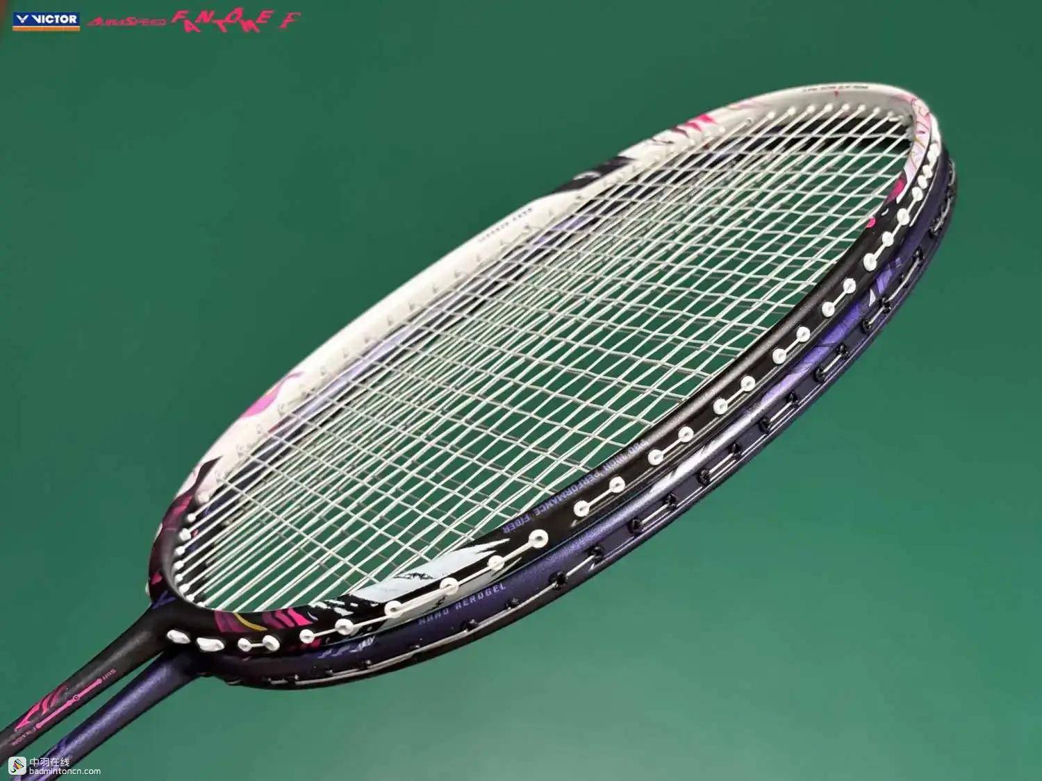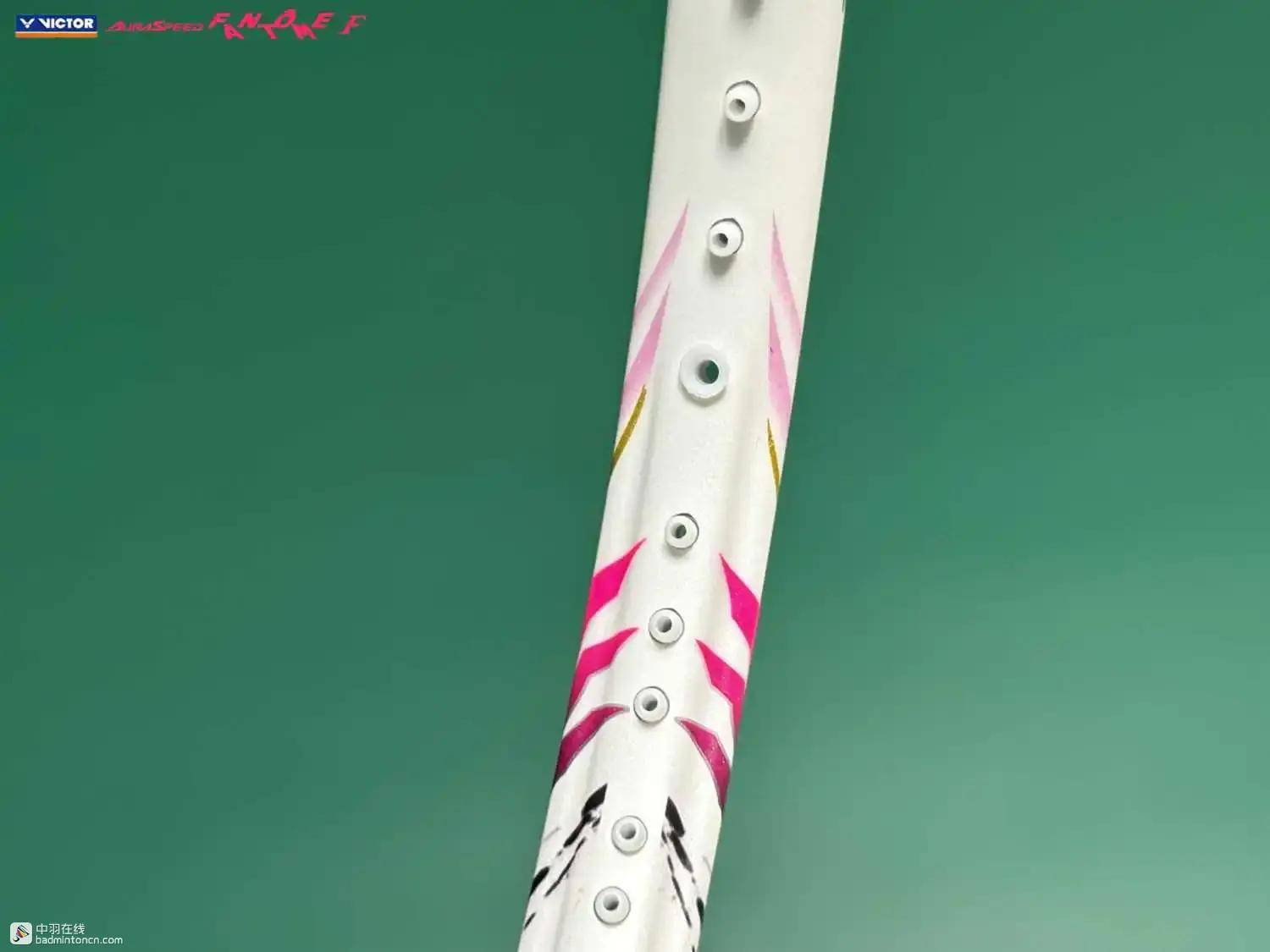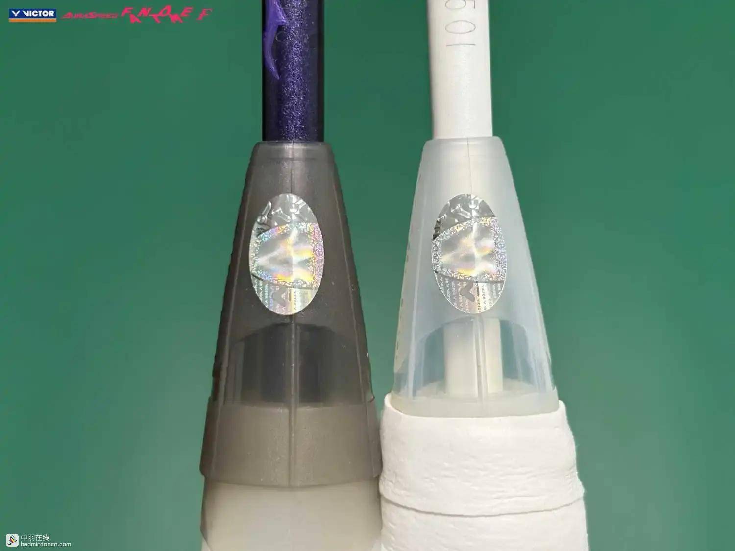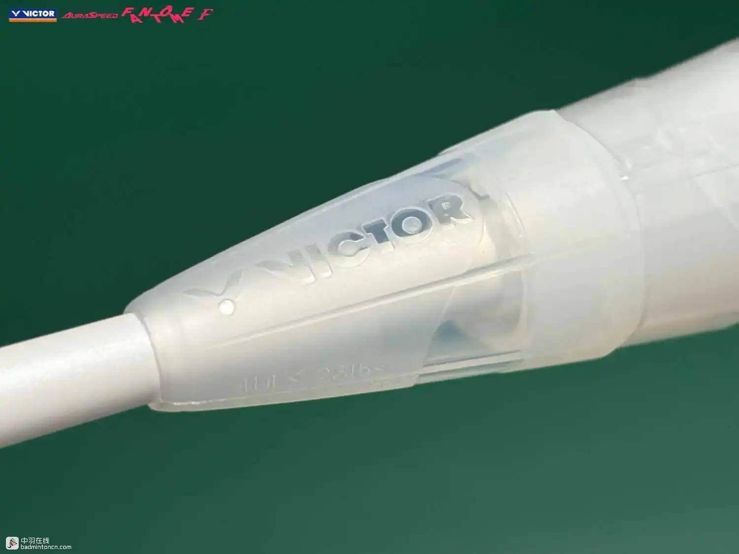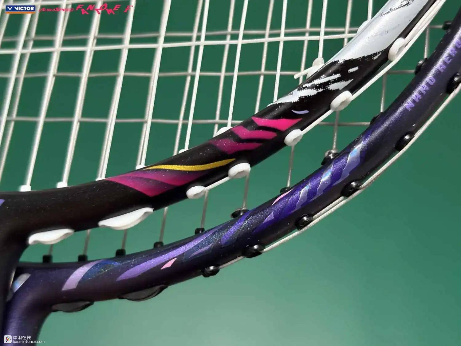 在图案设计上,ARS-影刃F也采用的是一种斜向的对应,左右来看,两边图案各是一种风格,以柔对刚;上下来看,也是如此。 在三通两侧,一侧以粉色配合柔和的线条,如飘动的丝带,在风中摇曳,再加上金色曲线的修饰,并点缀以爱心图案,温婉柔和,优雅丝滑,气质非凡。 而另一侧则是采用了截然不同的风格,三道玫红色的爪痕凸显出利刃般的凌厉感,神秘莫测。黑白相间类似泼墨的图案,展示了一种动若残影的速度感。 拍框上部的图案亦是同理,左右两部分的强烈对比正是ARS-影刃F涂装设计的耐人寻味之处,左右相对,一刚一柔,正如枝条密被利刺的玫瑰,虽表面娇柔,实则暗藏杀机。 ARS-影刃F的中杆由上部的黑色承接尾端的白色,过渡处采用大量玫瑰花瓣,两种色彩相互叠加,其中有的花瓣轮廓清晰,有的则采用模糊处理,似有远有近,有静有动,有虚有实,漫天飞花随风而舞,让人不由沁入那梦幻般的浪漫之中。 靠近三通处,影刃标志性的爪痕图案赫然呈现。 而影刃的英文字体醒目地印于中央,采用紫色,下方金色轮廓包围着紫宝石般的“F”字样。 T头中央的威克多LOGO水标同样采用了紫宝石质感的镭射表面处理。 总的来说,相较于ARS-影刃,ARS-影刃F在涂装的颜色选择、布局以及图案元素方面都有着较大的差异,颜色种类和图案细节都更为丰富。不过ARS-影刃F在原先的位置也保留了一些和ARS-影刃相对应的元素,例如中杆上型号名称的字体、拍框和中杆上的爪痕图案等等,也算是一种传承吧。 科技参数浅析 ARS-影刃F的规格为4U/G5,出厂即为空拍无底胶状态,去除热缩膜之后,重约77.13g,平衡点约为330mm。 上线(威克多VBS-61线,26磅)和手胶(缓震膜+威克多GR233手胶)之后,总重约为87.44g,平衡点则约为316mm。可以看到ARS-影刃F拥有非常高的平衡点,明显高于ARS-影刃,甚至比包括“龙牙家族”所有型号在内的威克多大部分球拍都要更高。 实测下,ARS-影刃F的拍身总长约为675mm,其中,拍框长度约252mm,中杆(锥盖顶部至T头两侧最下方线孔处)长度约215mm,手柄(底盖至锥盖顶部)则约为208mm。 相较于ARS-影刃,ARS-影刃F的拍框、中杆以及手柄长度都保持了一致。 ARS-影刃F延续了ARS-影刃的大拍面设计,同样采用76孔穿线模式。 二者的拍框宽度、形状也均相同。 在框型方面,ARS-影刃F亦传承了ARS-影刃的动力破风框(DYNAMIC-SWORD),拍框截面菱形结构根据位置不同有所区别,增大引导空气的截面积以提升挥速。 拍框左上(约10点和11点之间)、右上(约1点和2点之间)、左下(约7点和8点之间)、右下(约4点和5点之间)对称分布了四处浅凹槽,提升拍框的抗扭。 ARS-影刃F也继承了开创于ARS-影刃身上的薄翼拍框设计,拍框上的至薄处(即顶框12点位置附近)的厚度仅有5.0mm,对挥速的提升效果是非常可观的。 实测之下,ARS-影刃F拍框底部(靠近T头处)宽度实测约为11.43mm,厚度约为8.25mm。 拍框两侧(3点、9点钟方向)宽度则约为10.71mm,厚度约为5.81mm。 拍框顶部宽度约为10.82mm,厚度约为5.18mm。可见顶框的位置确实如参数所标注的那样,是非常纤薄的;而比笔者手中的ARS-影刃要厚了大约0.1至0.2mm的原因,除球拍制造和测量误差外,也有白色漆水一般比深色漆水更厚的因素。 此外,ARS-影刃F的拍框外侧采用线槽结构设计,线槽分布在上方的大半个拍框,比一般的半线槽要长,大约起始于4点和8点位置(由三通向上数第12和13个线孔之间)。 对比ARS-影刃F和ARS-影刃的线槽长度,可以看到二者也是相同的。 ARS-影刃F的拍框和ARS-影刃同样运用了纳米气凝胶(NANO AEROGEL),将其作为一种内发泡材料注入球拍框体,相比传统填充物更轻的它能够释放拍框的配重空间,让碳纤维在拍框上的用量得以增加,不仅能够使球拍更轻量,也使得拍框强度得到提升。 此外,拍框亦搭载强芯填充科技(HARD CORED TECHNOLOGY),提升拍框击球时的稳定性,保证出球的准确度。 ARS-影刃F采用6.6mm中杆,实际测量得中杆外径约为6.93mm(测量点位于中杆中点处)。 相比ARS-影刃的6.8mm中杆,ARS-影刃F的中杆更加纤细,更容易释放弹性;此外,ARS-影刃F在硬度方面也相较于ARS-影刃有所下调,更软弹的中杆有利于使用者更轻松地去发力。 中杆搭载标配的百洛碳素纤维(PYROFIL),保证出色的弹性性能。 另外,ARS-影刃F的中杆与拍框均导入PBO高性能纤维(PBO HIGH PERFORMANCE FIBER),航天级的强韧纤维材料,可大幅提升球拍整体的力量传导性能,使得球拍在保证重量不变的前提下亦兼备强韧度与舒适手感。 ARS-影刃F依然采用悬浮科技手柄,搭配半透明塑料锥盖及蓝色半透明底盖,锥盖内部无力量环结构,能够更充分地释放中杆摆动的自由度,让挥拍更流畅。 ARS-影刃F的建议穿线磅数为最高28磅,比同规格4U的ARS-影刃要低一磅。 上手体验详解 ARS-影刃F拥有非常显著的头重感,上手挥拍时,拍头的惯性明显,随挥感非常强烈,和5U规格的TK-龙牙MUSE有些许相似,这种平衡点很高的球拍现在相对来说不多,因此对于大部分球友来说,在初上手时可能需要一定的适应时间,尤其是在控球方面,较重的拍头增加了精确控制落点的难度,需要一个磨合的过程。 因为头重的缘故,ARS-影刃F的挥重明显大于ARS-影刃,而且中杆更软、更弹,更容易打出形变,总体头重杆软的特点使得其非常好上手,尤其是上手挥拍不用太多主动发力就能把球打出去,但同时击球后中杆的颤动感比ARS-影刃明显,出球的准确度相比ARS-影刃打了折扣,有时会感觉出球有些过于弹,失去了ARS-影