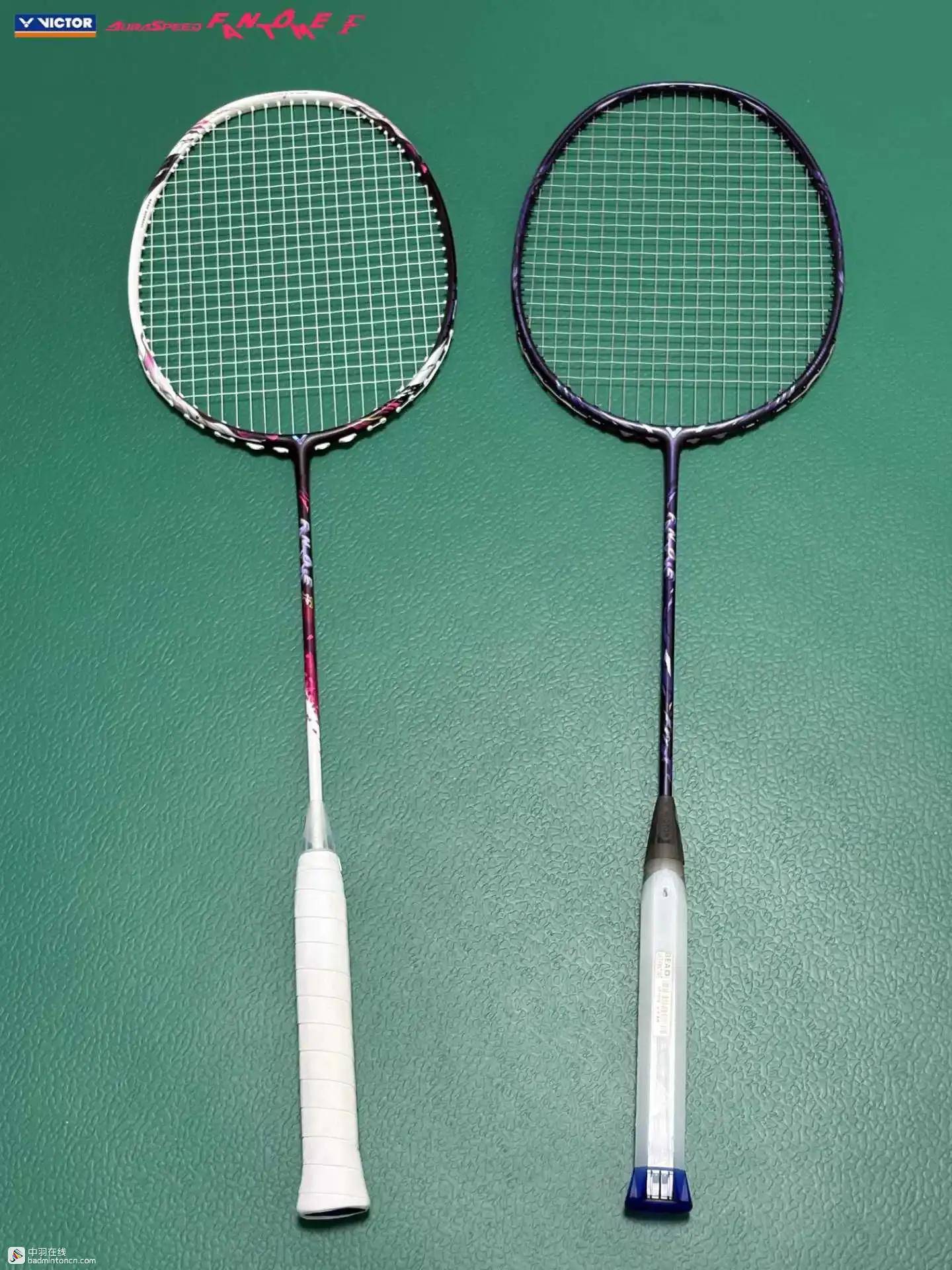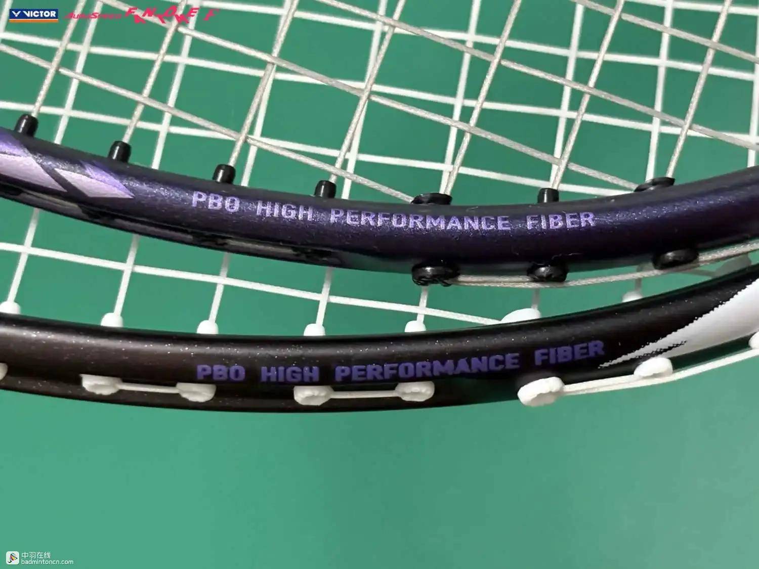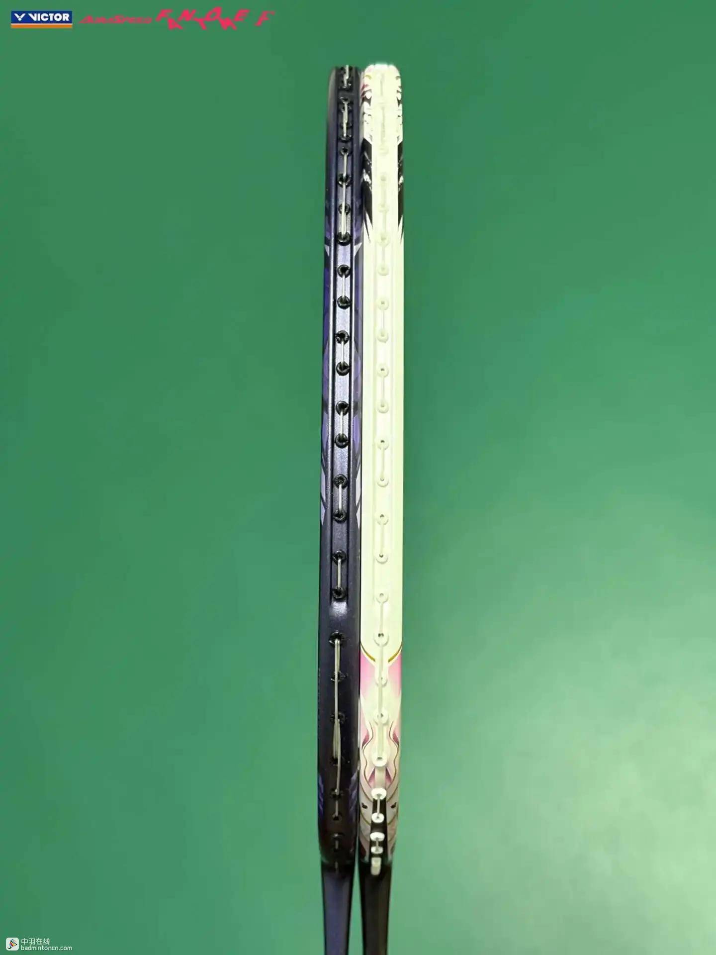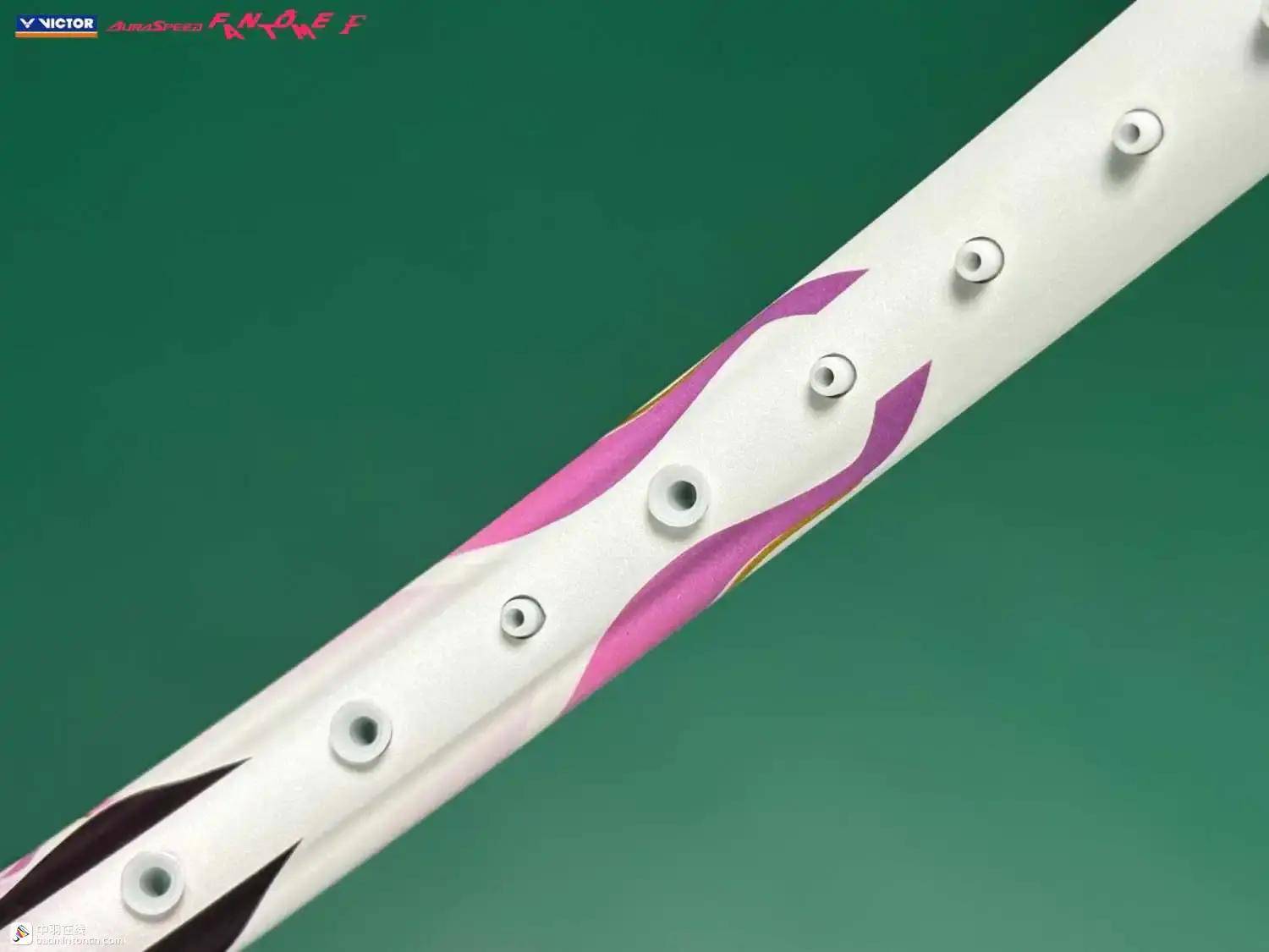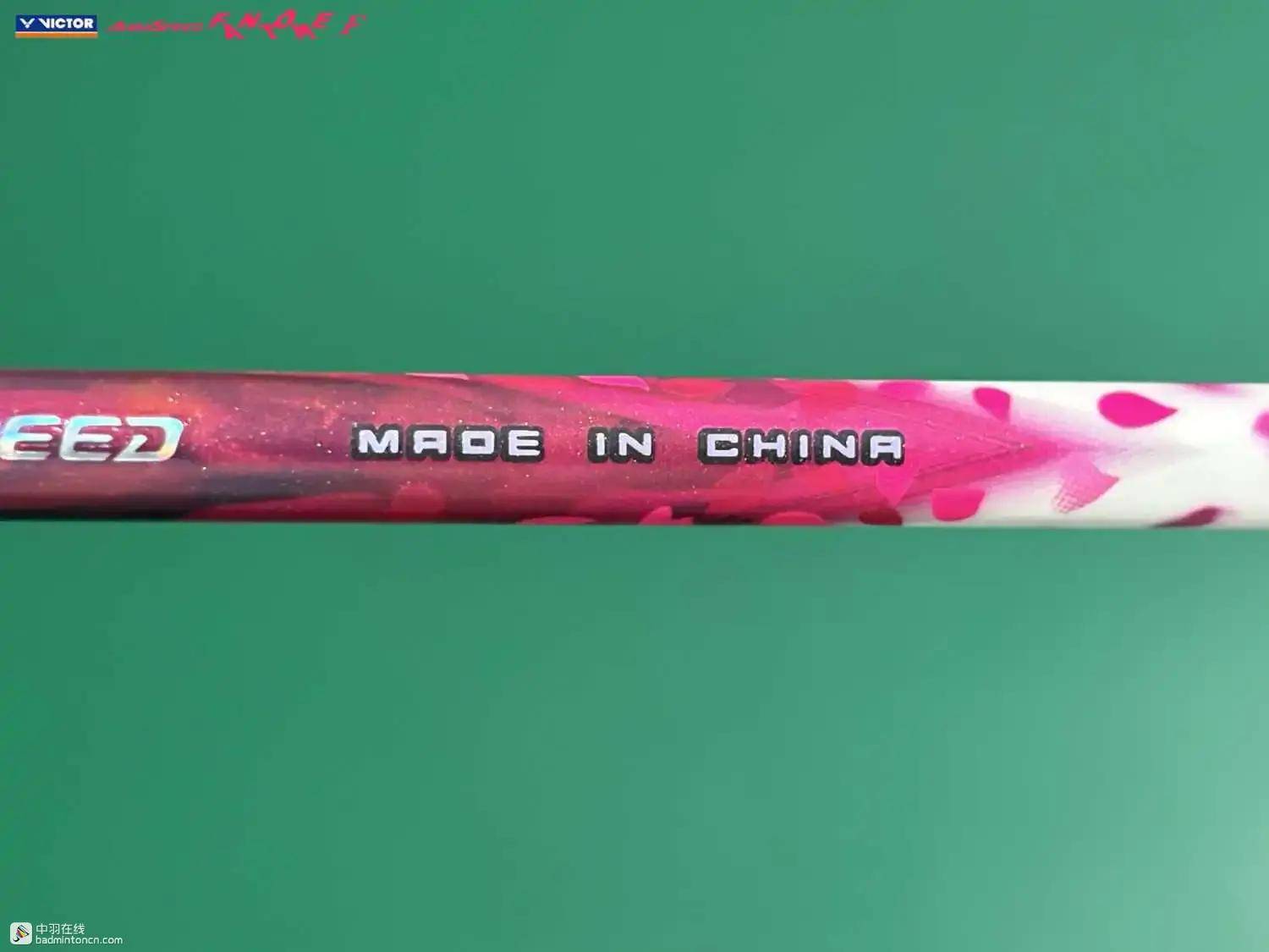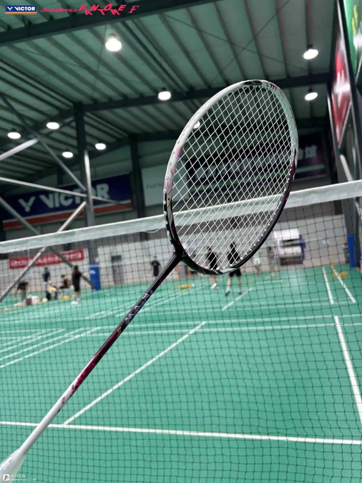 在图案设计上,ARS-影刃F也采用的是一种斜向的对应,左右来看,两边图案各是一种风格,以柔对刚;上下来看,也是如此。 在三通两侧,一侧以粉色配合柔和的线条,如飘动的丝带,在风中摇曳,再加上金色曲线的修饰,并点缀以爱心图案,温婉柔和,优雅丝滑,气质非凡。 而另一侧则是采用了截然不同的风格,三道玫红色的爪痕凸显出利刃般的凌厉感,神秘莫测。黑白相间类似泼墨的图案,展示了一种动若残影的速度感。 拍框上部的图案亦是同理,左右两部分的强烈对比正是ARS-影刃F涂装设计的耐人寻味之处,左右相对,一刚一柔,正如枝条密被利刺的玫瑰,虽表面娇柔,实则暗藏杀机。 ARS-影刃F的中杆由上部的黑色承接尾端的白色,过渡处采用大量玫瑰花瓣,两种色彩相互叠加,其中有的花瓣轮廓清晰,有的则采用模糊处理,似有远有近,有静有动,有虚有实,漫天飞花随风而舞,让人不由沁入那梦幻般的浪漫之中。 靠近三通处,影刃标志性的爪痕图案赫然呈现。 而影刃的英文字体醒目地印于中央,采用紫色,下方金色轮廓包围着紫宝石般的“F”字样。 T头中央的威克多LOGO水标同样采用了紫宝石质感的镭射表面处理。 总的来说,相较于ARS-影刃,ARS-影刃F在涂装的颜色选择、布局以及图案元素方面都有着较大的差异,颜色种类和图案细节都更为丰富。不过ARS-影刃F在原先的位置也保留了一些和ARS-影刃相对应的元素,例如中杆上型号名称的字体、拍框和中杆上的爪痕图案等等,也算是一种传承吧。 科技参数浅析 ARS-影刃F的规格为4U/G5,出厂即为空拍无底胶状态,去除热缩膜之后,重约77.13g,平衡点约为330mm。 上线(威克多VBS-61线,26磅)和手胶(缓震膜+威克多GR233手胶)之后,总重约为87.44g,平衡点则约为316mm。可以看到ARS-影刃F拥有非常高的平衡点,明显高于ARS-影刃,甚至比包括“龙牙家族”所有型号在内的威克多大部分球拍都要更高。 实测下,ARS-影刃F的拍身总长约为675mm,其中,拍框长度约252mm,中杆(锥盖顶部至T头两侧最下方线孔处)长度约215mm,手柄(底盖至锥盖顶部)则约为208mm。 相较于ARS-影刃,ARS-影刃F的拍框、中杆以及手柄长度都保持了一致。 ARS-影刃F延续了ARS-影刃的大拍面设计,同样采用76孔穿线模式。 二者的拍框宽度、形状也均相同。 在框型方面,ARS-影刃F亦传承了ARS-影刃的动力破风框(DYNAMIC-SWORD),拍框截面菱形结构根据位置不同有所区别,增大引导空气的截面积以提升挥速。 拍框左上(约10点和11点之间)、右上(约1点和2点之间)、左下(约7点和8点之间)、右下(约4点和5点之间)对称分布了四处浅凹槽,提升拍框的抗扭。 ARS-影刃F也继承了开创于ARS-影刃身上的薄翼拍框设计,拍框上的至薄处(即顶框12点位置附近)的厚度仅有5.0mm,对挥速的提升效果是非常可观的。 实测之下,ARS-影刃F拍框底部(靠近T头处)宽度实测约为11.43mm,厚度约为8.25mm。 拍框两侧(3点、9点钟方向)宽度则约为10.71mm,厚度约为5.81mm。 拍框顶部宽度约为10.82mm,厚度约为5.18mm。可见顶框的位置确实如参数所标注的那样,是非常纤薄的;而比笔者手中的ARS-影刃要厚了大约0.1至0.2mm的原因,除球拍制造和测量误差外,也有白色漆水一般比深色漆水更厚的因素。 此外,ARS-影刃F的拍框外侧采用线槽结构设计,线槽分布在上方的大半个拍框,比一般的半线槽要长,大约起始于4点和8点位置(由三通向上数第12和13个线孔之间)。 对比ARS-影刃F和ARS-影刃的线槽长度,可以看到二者也是相同的。 ARS-影刃F的拍框和ARS-影刃同样运用了纳米气凝胶(NANO AEROGEL),将其作为一种内发泡材料注入球拍框体,相比传统填充物更轻的它能够释放拍框的配重空间,让碳纤维在拍框上的用量得以增加,不仅能够使球拍更轻量,也使得拍框强度得到提升。 此外,拍框亦搭载强芯填充科技(HARD CORED TECHNOLOGY),提升拍框击球时的稳定性,保证出球的准确度。 ARS-影刃F采用6.6mm中杆,实际测量得中杆外径约为6.93mm(测量点位于中杆中点处)。 相比ARS-影刃的6.8mm中杆,ARS-影刃F的中杆更加纤细,更容易释放弹性;此外,ARS-影刃F在硬度方面也相较于ARS-影刃有所下调,更软弹的中杆有利于使用者更轻松地去发力。 中杆搭载标配的百洛碳素纤维(PYROFIL),保证出色的弹性性能。 另外,ARS-影刃F的中杆与拍框均导入PBO高性能纤维(PBO HIGH PERFORMANCE FIBER),航天级的强韧纤维材料,可大幅提升球拍整体的力量传导性能,使得球拍在保证重量不变的前提下亦兼备强韧度与舒适手感。 ARS-影刃F依然采用悬浮科技手柄,搭配半透明塑料锥盖及蓝色半透明底盖,锥盖内部无力量环结构,能够更充分地释放中杆摆动的自由度,让挥拍更流畅。 ARS-影刃F的建议穿线磅数为最高28磅,比同规格4U的ARS-影刃要低一磅。 上手体验详解 ARS-影刃F拥有非常显著的头重感,上手挥拍时,拍头的惯性明显,随挥感非常强烈,和5U规格的TK-龙牙MUSE有些许相似,这种平衡点很高的球拍现在相对来说不多,因此对于大部分球友来说,在初上手时可能需要一定的适应时间,尤其是在控球方面,较重的拍头增加了精确控制落点的难度,需要一个磨合的过程。 因为头重的缘故,ARS-影刃F的挥重明显大于ARS-影刃,而且中杆更软、更弹,更容易打出形变,总体头重杆软的特点使得其非常好上手,尤其是上手挥拍不用太多主动发力就能把球打出去,但同时击球后中杆的颤动感比ARS-影刃明显,出球的准确度相比ARS-影刃打了折扣,有时会感觉出球有些过于弹,失去了ARS-影