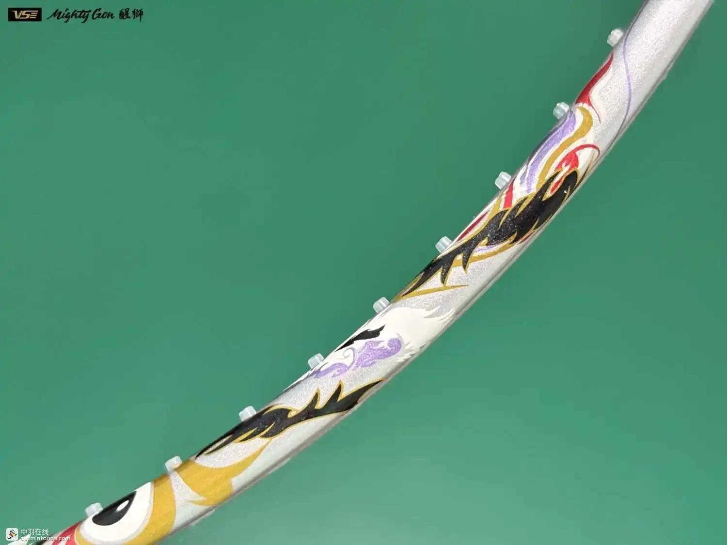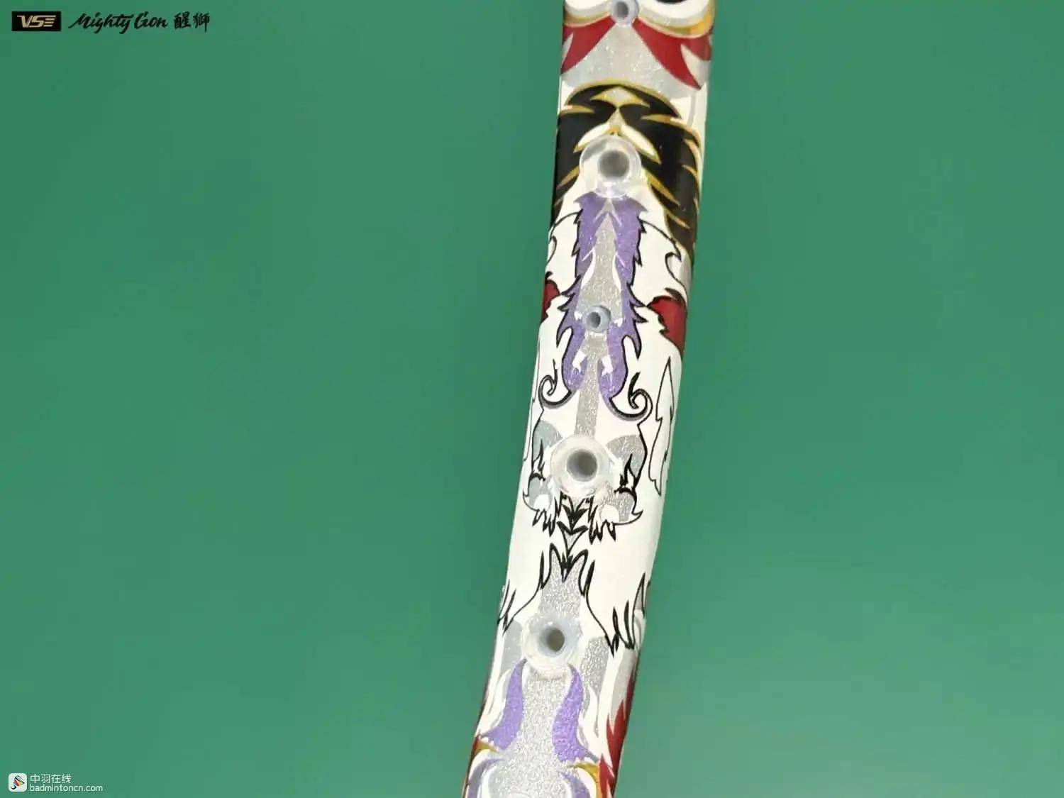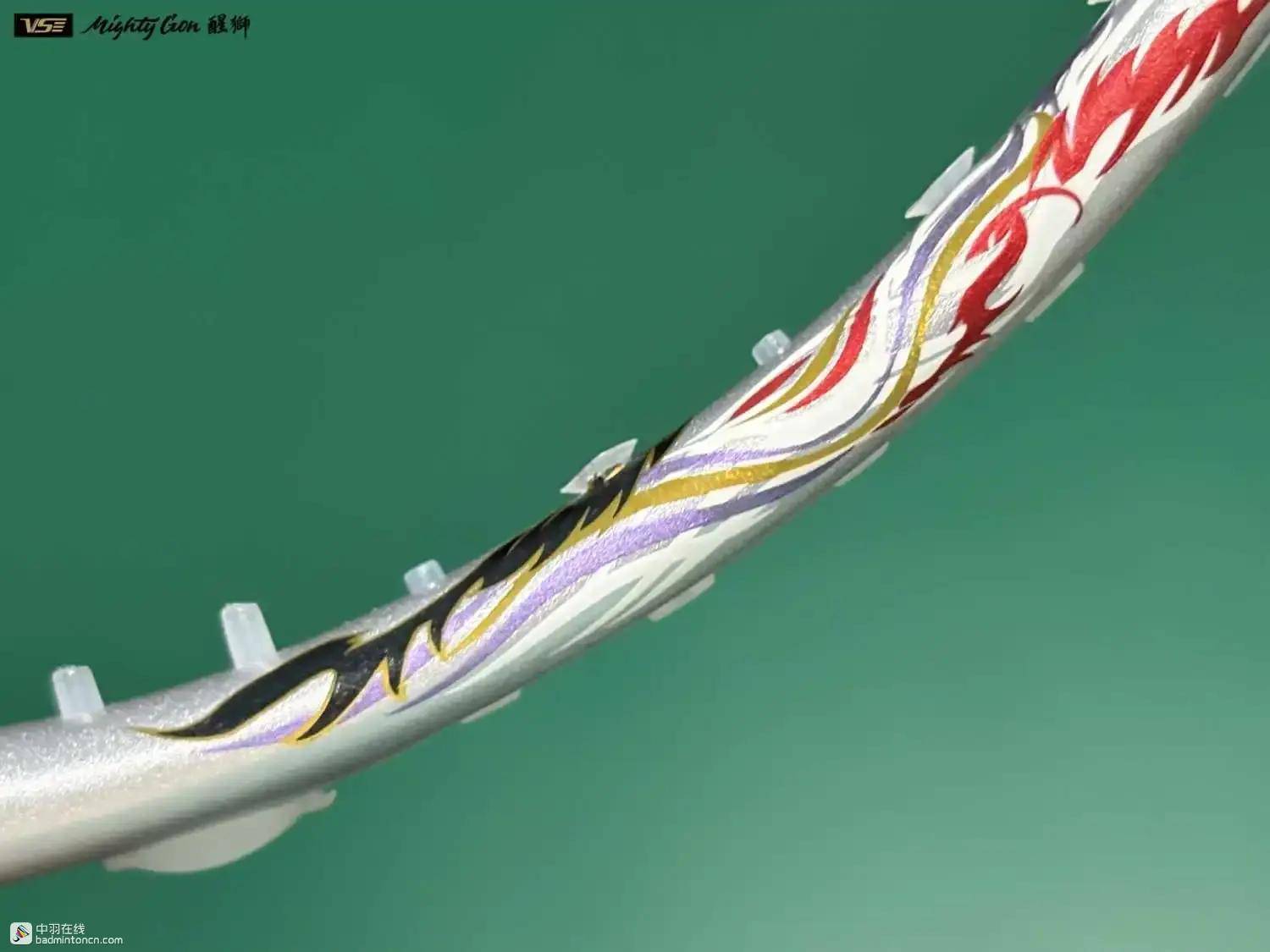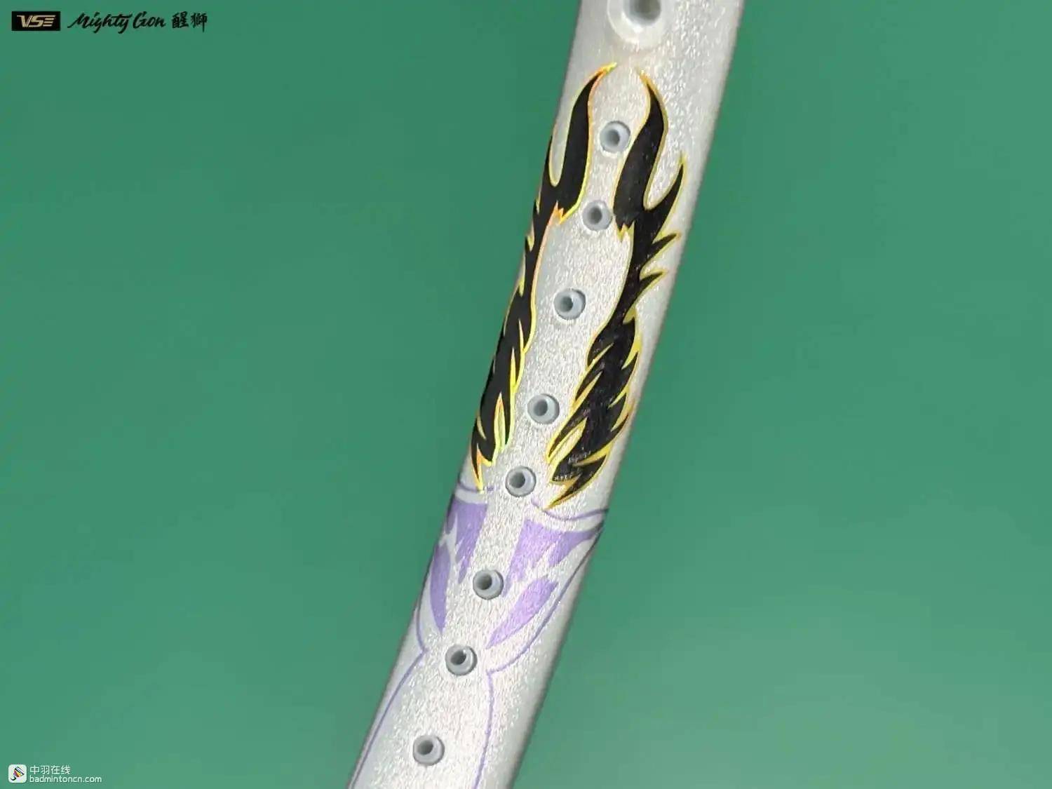 银醒狮的拍框采用对称式涂装设计,融入醒狮狮头造型,颜色方面除金色镭射水标之外,还大量运用黑、红、白和紫色,色彩丰富。